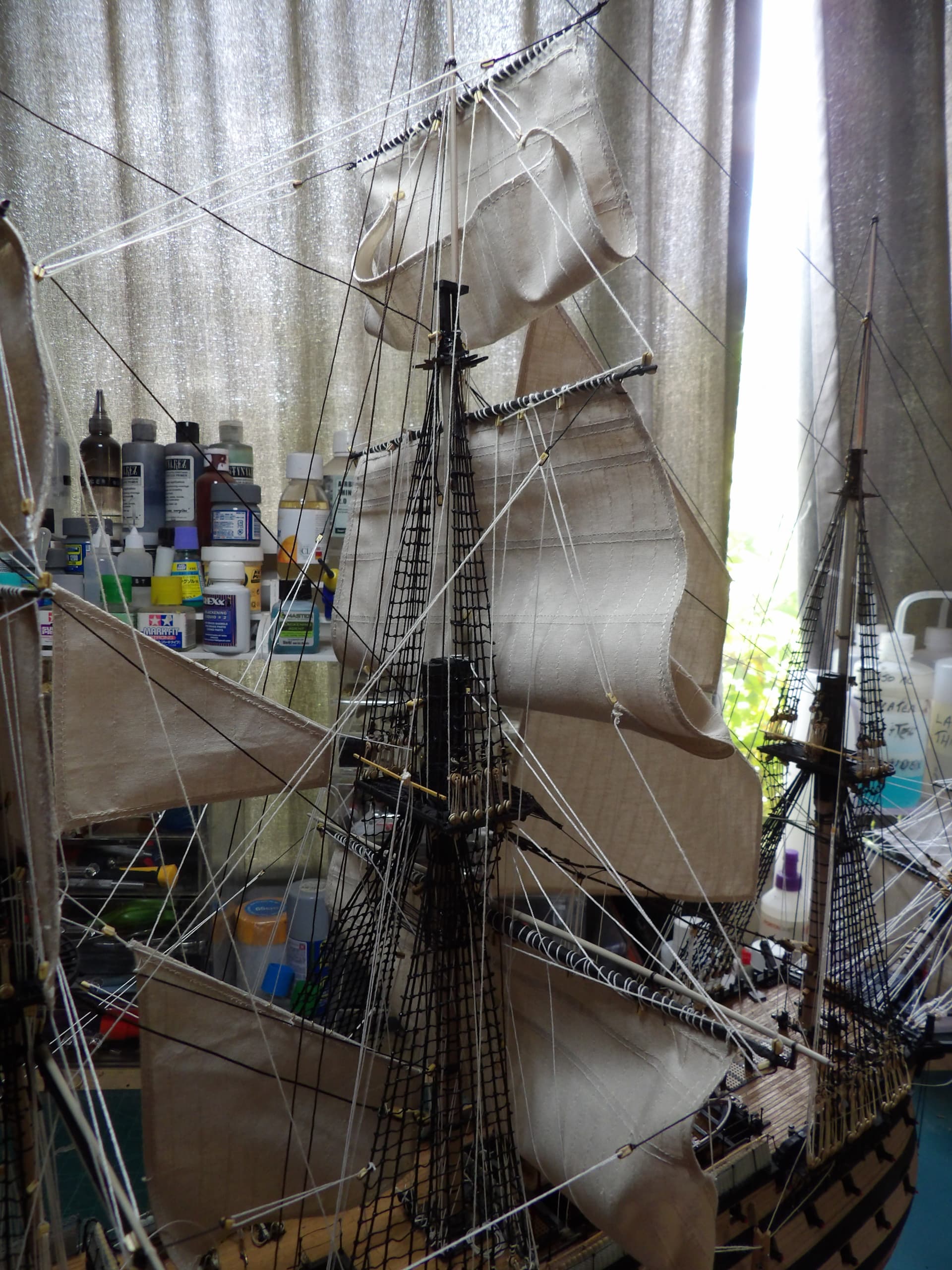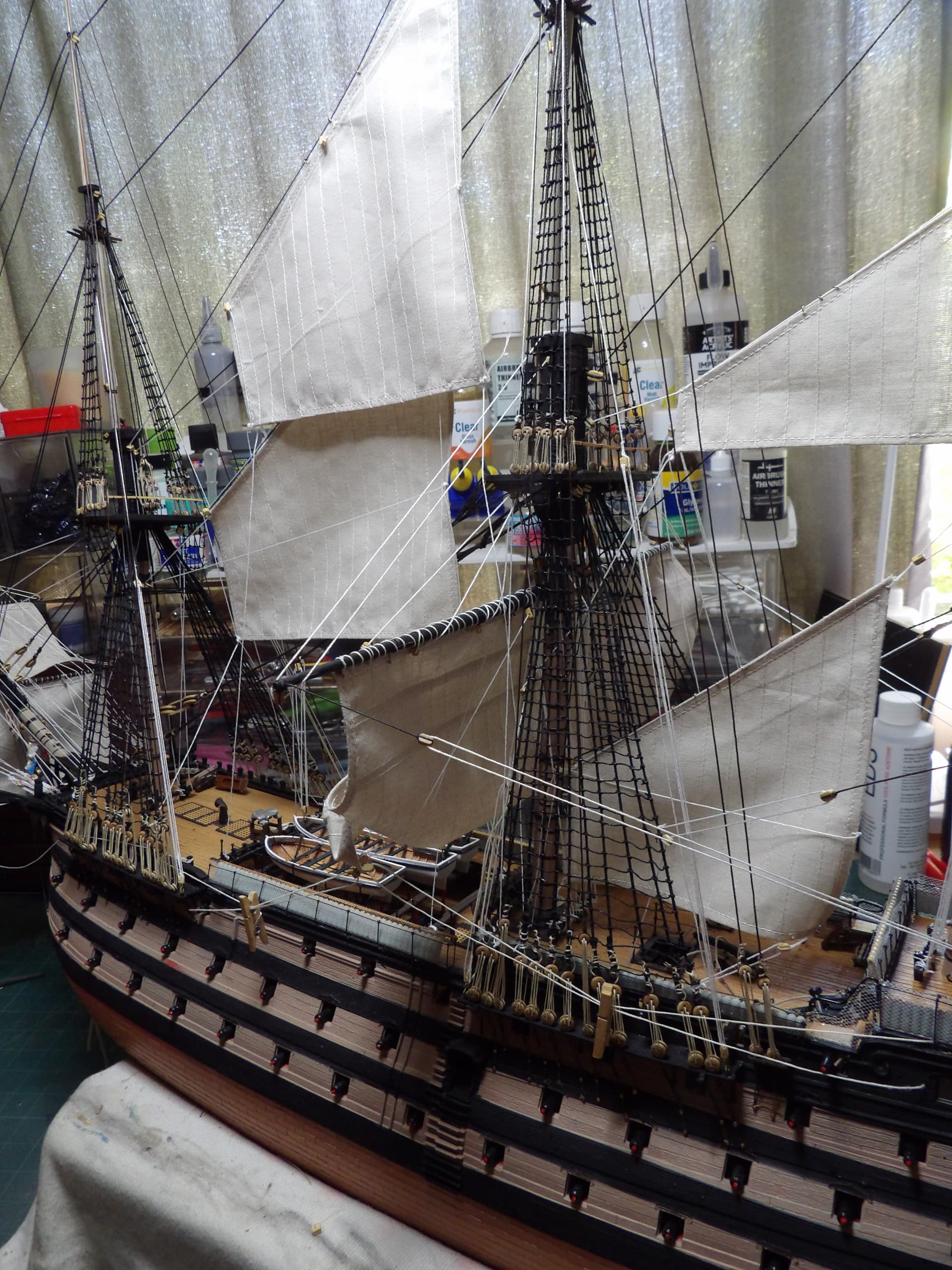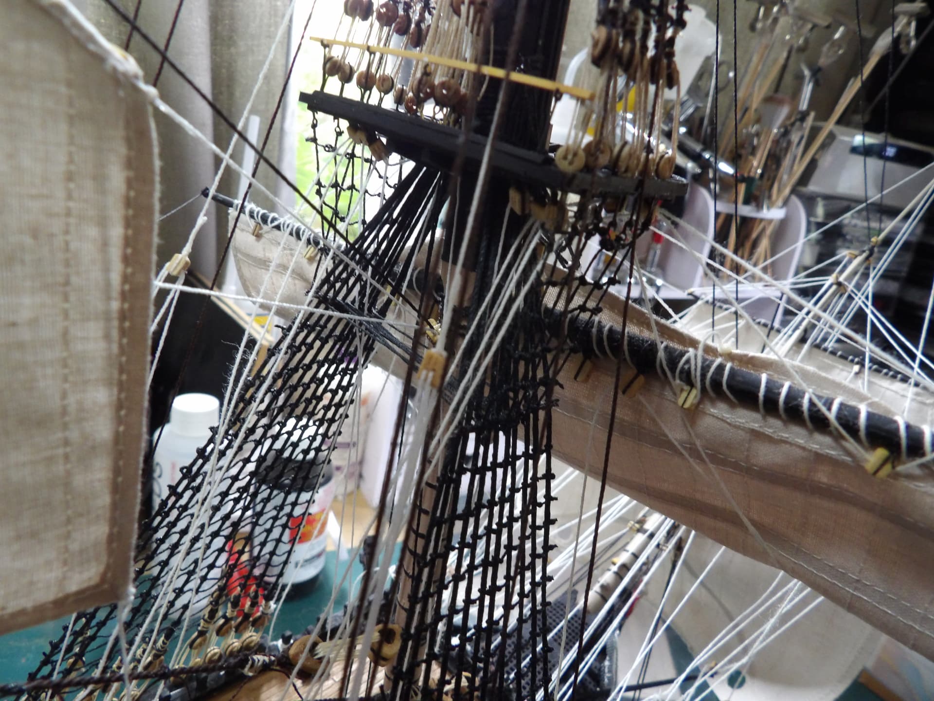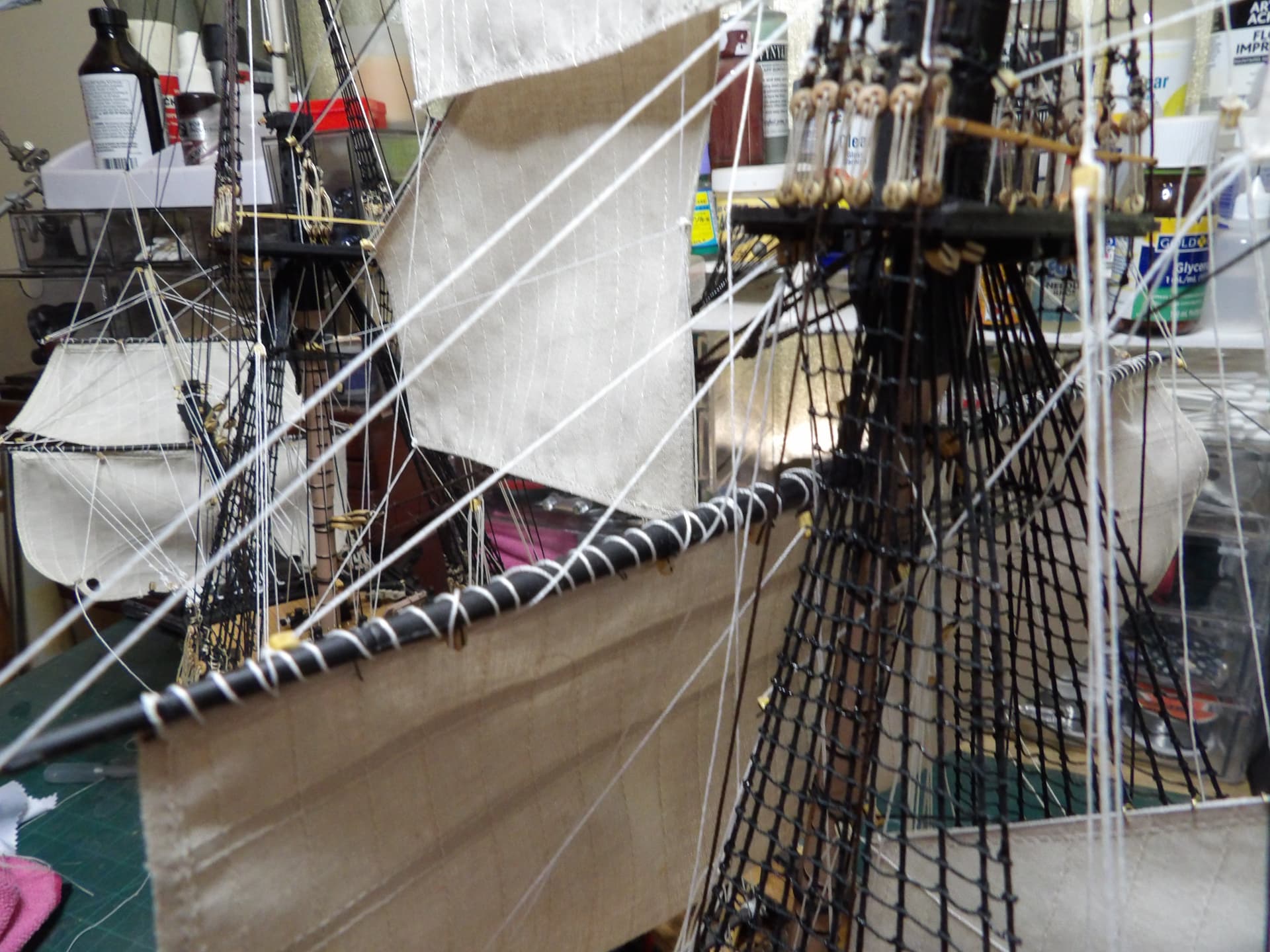I know one thing for sure , next time I start at the main mast , and work my way out , the tie off points were horrific to get at . but at least it’s done , onwards and upwards .