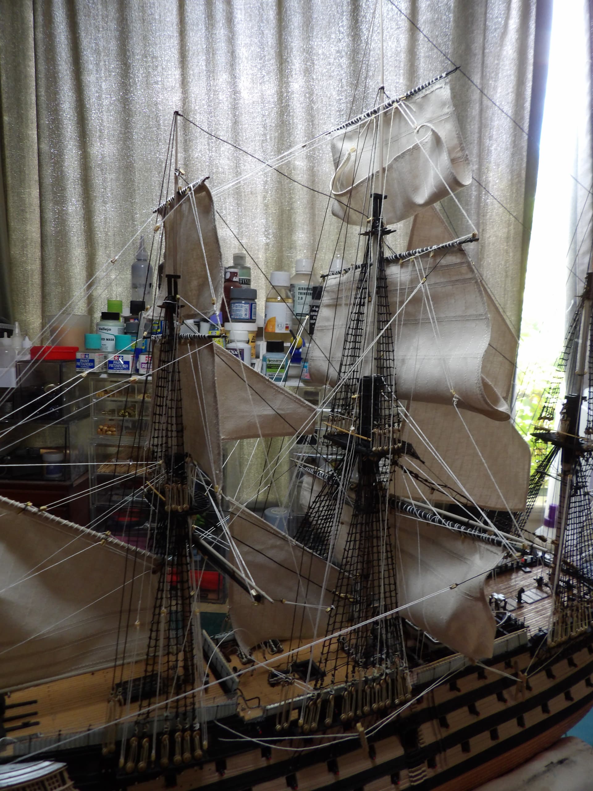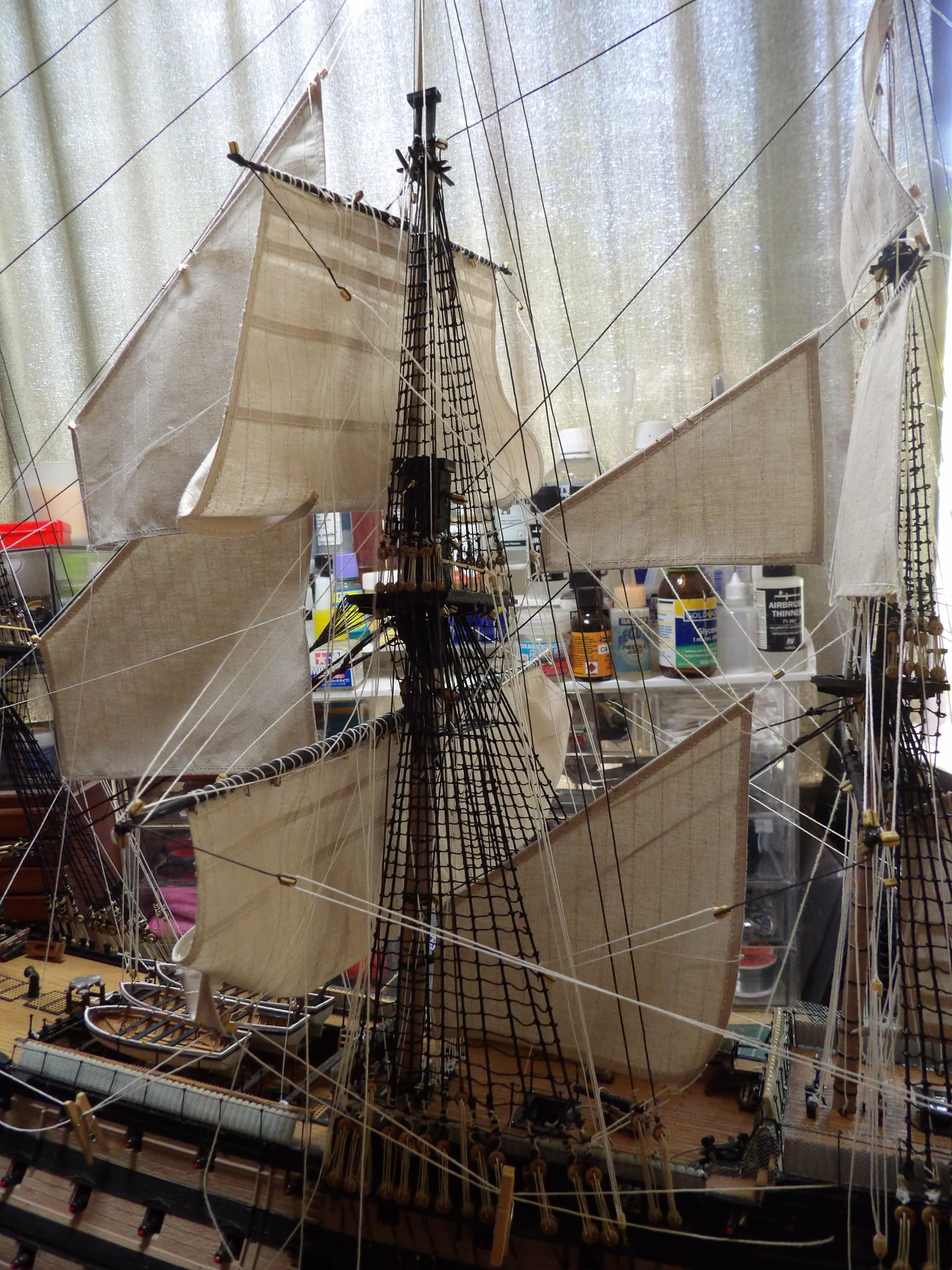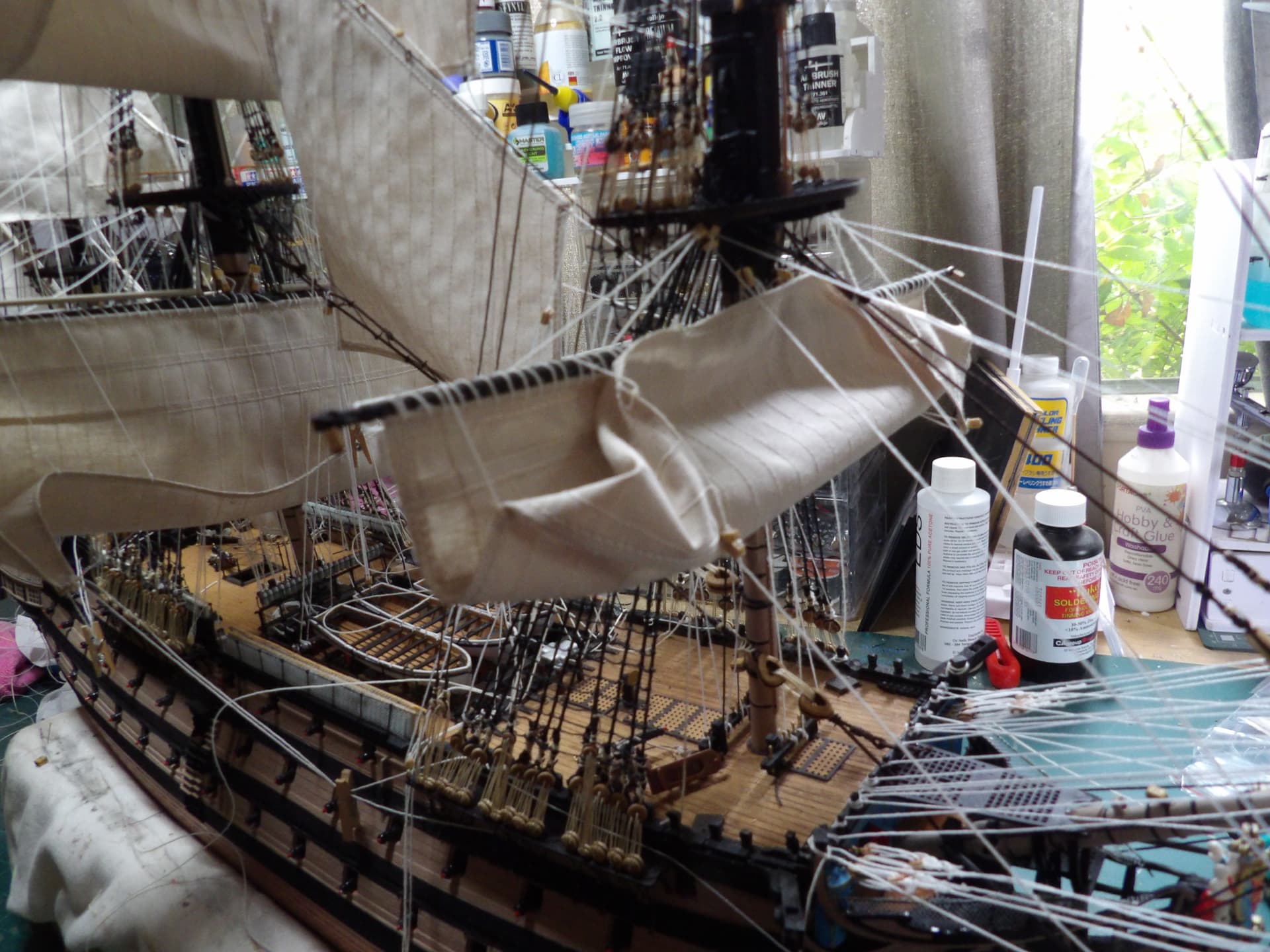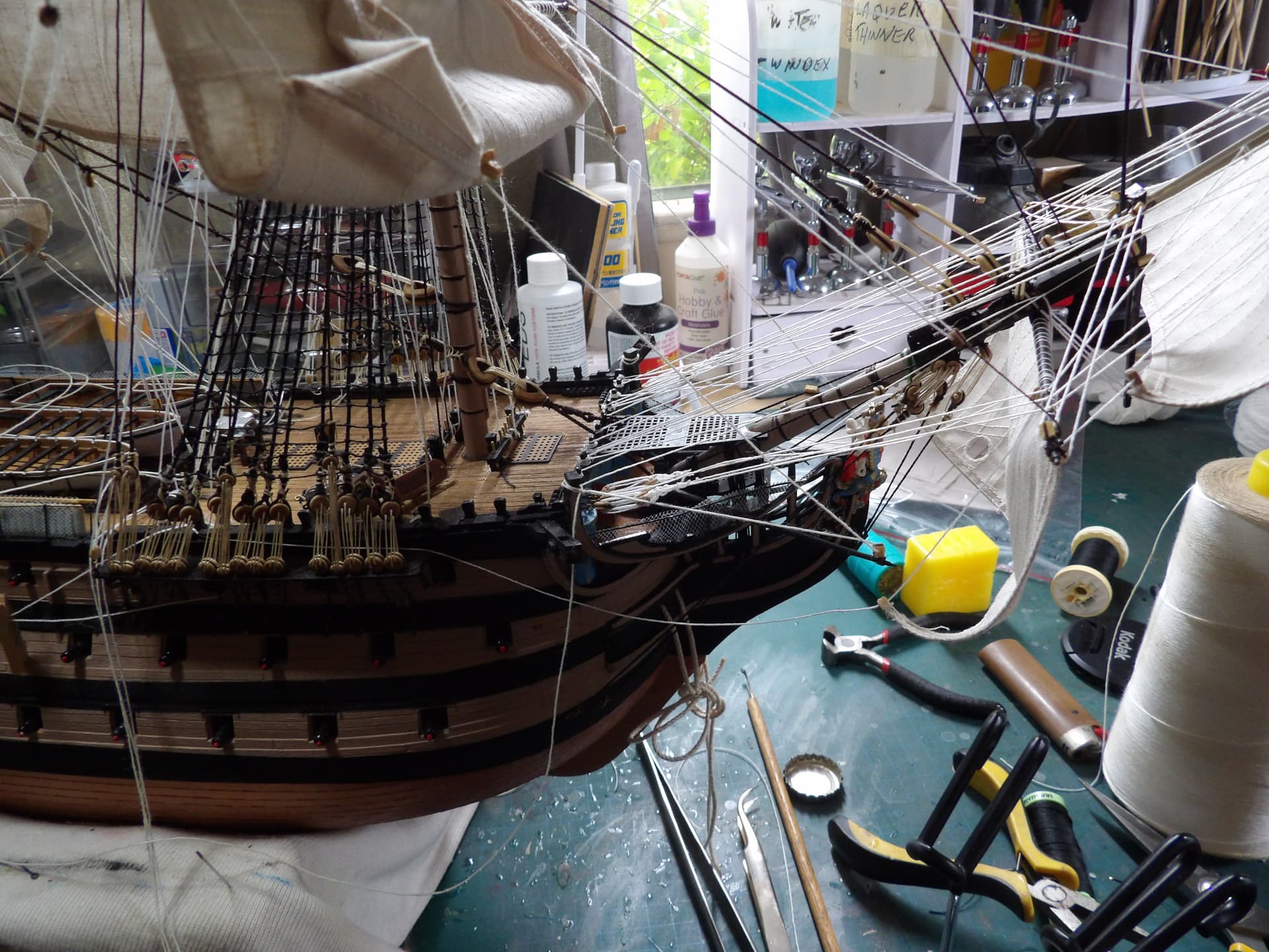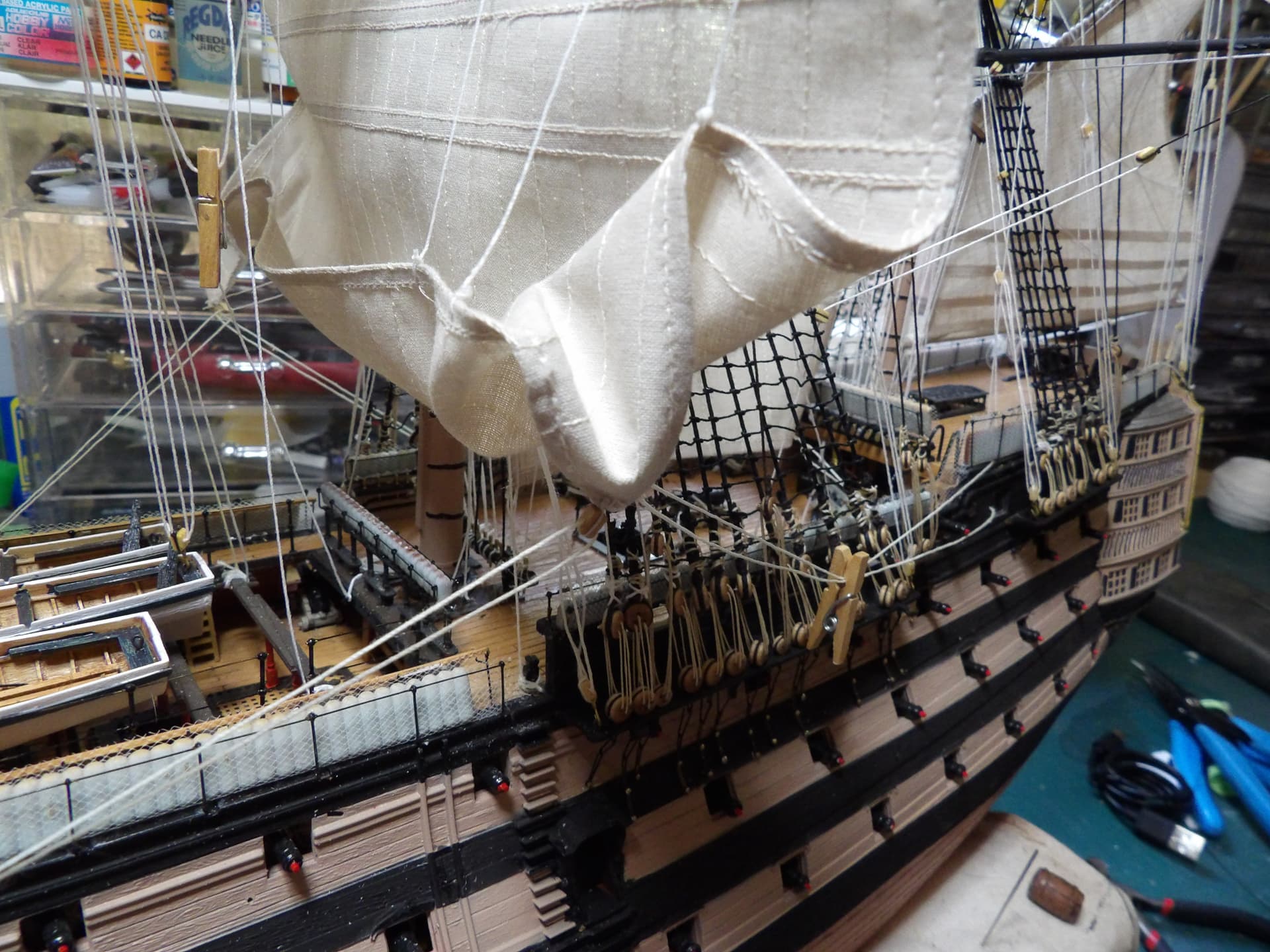 I know one thing for sure , next time I start at the main mast , and work my way out , the tie off points were horrific to get at . but at least it’s done , onwards and upwards .