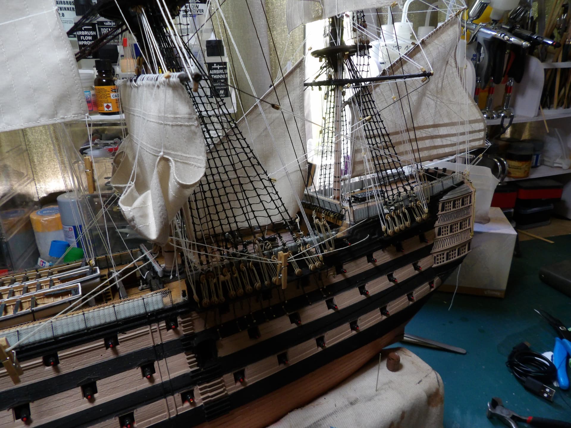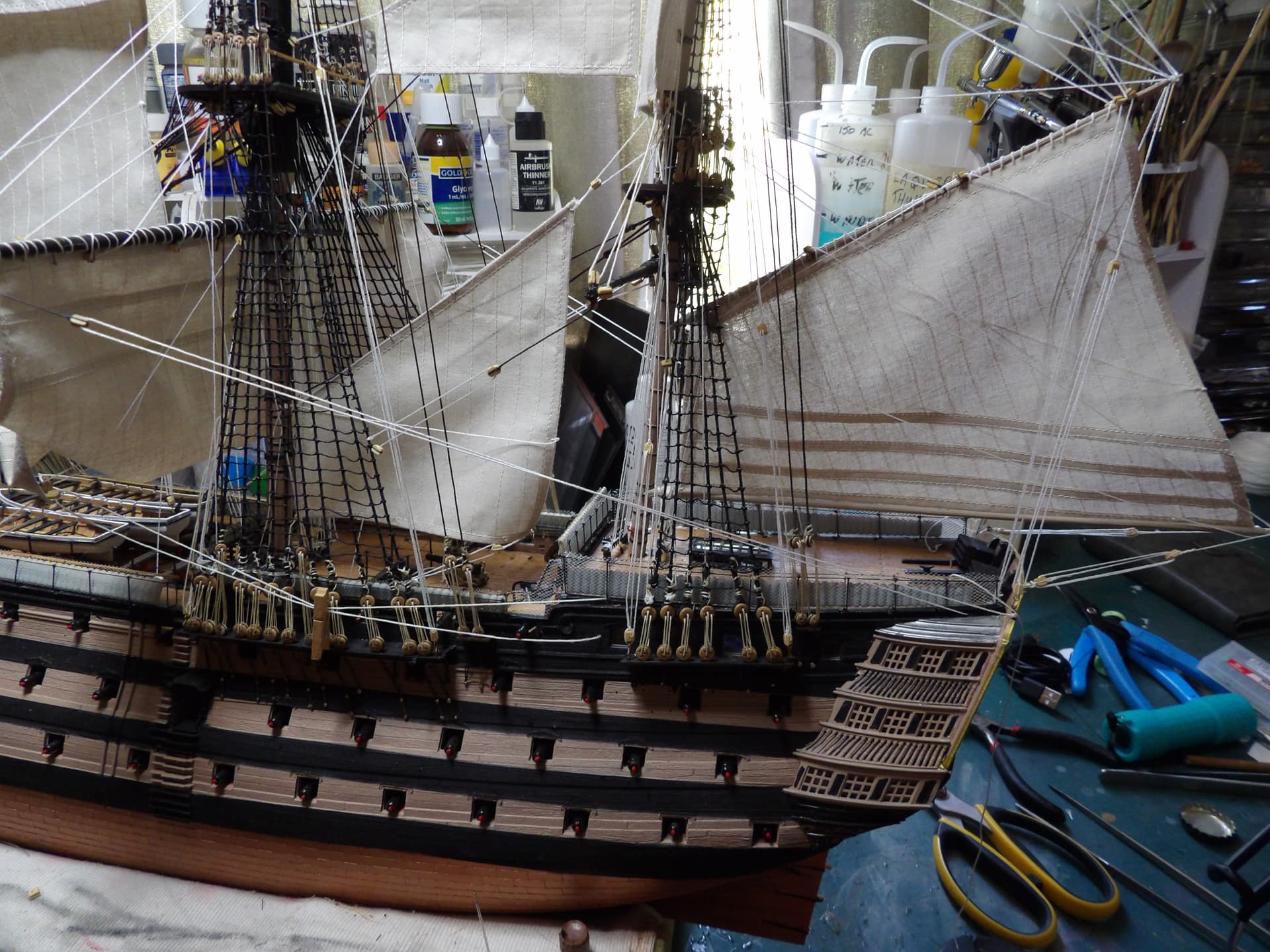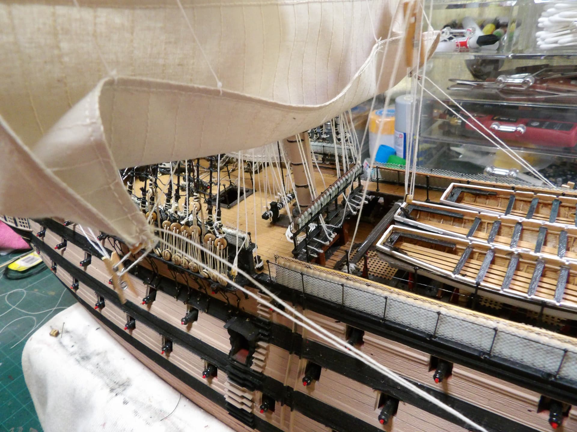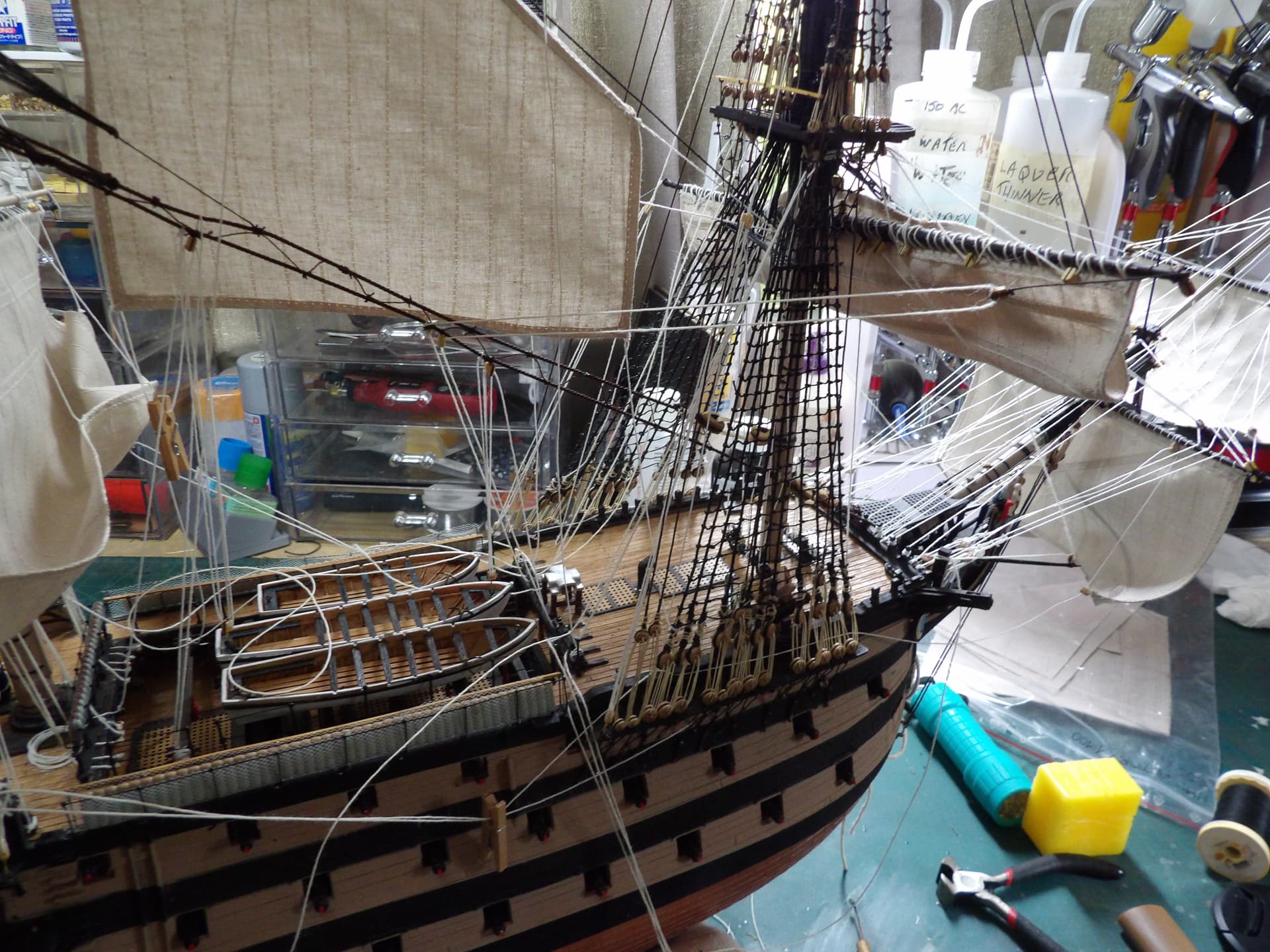 I know one thing for sure , next time I start at the main mast , and work my way out , the tie off points were horrific to get at . but at least it’s done , onwards and upwards .