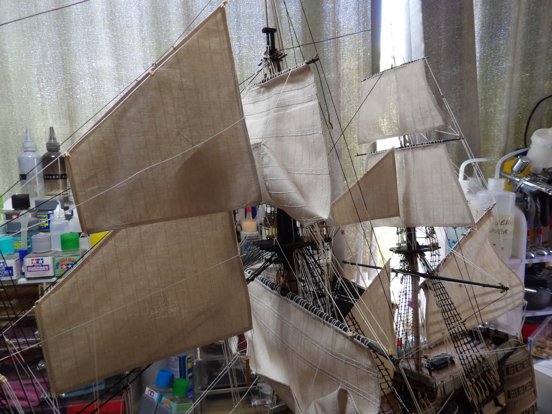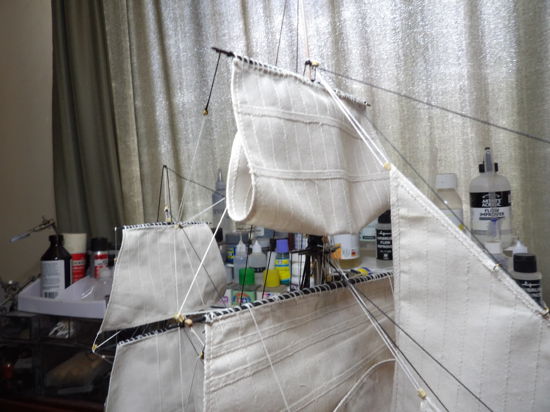 this is the first time I have attempted staysails , bob , I did them first , simply because I know what a clutz I am , sure as eggs , I would have torn a yard off otherwise ,