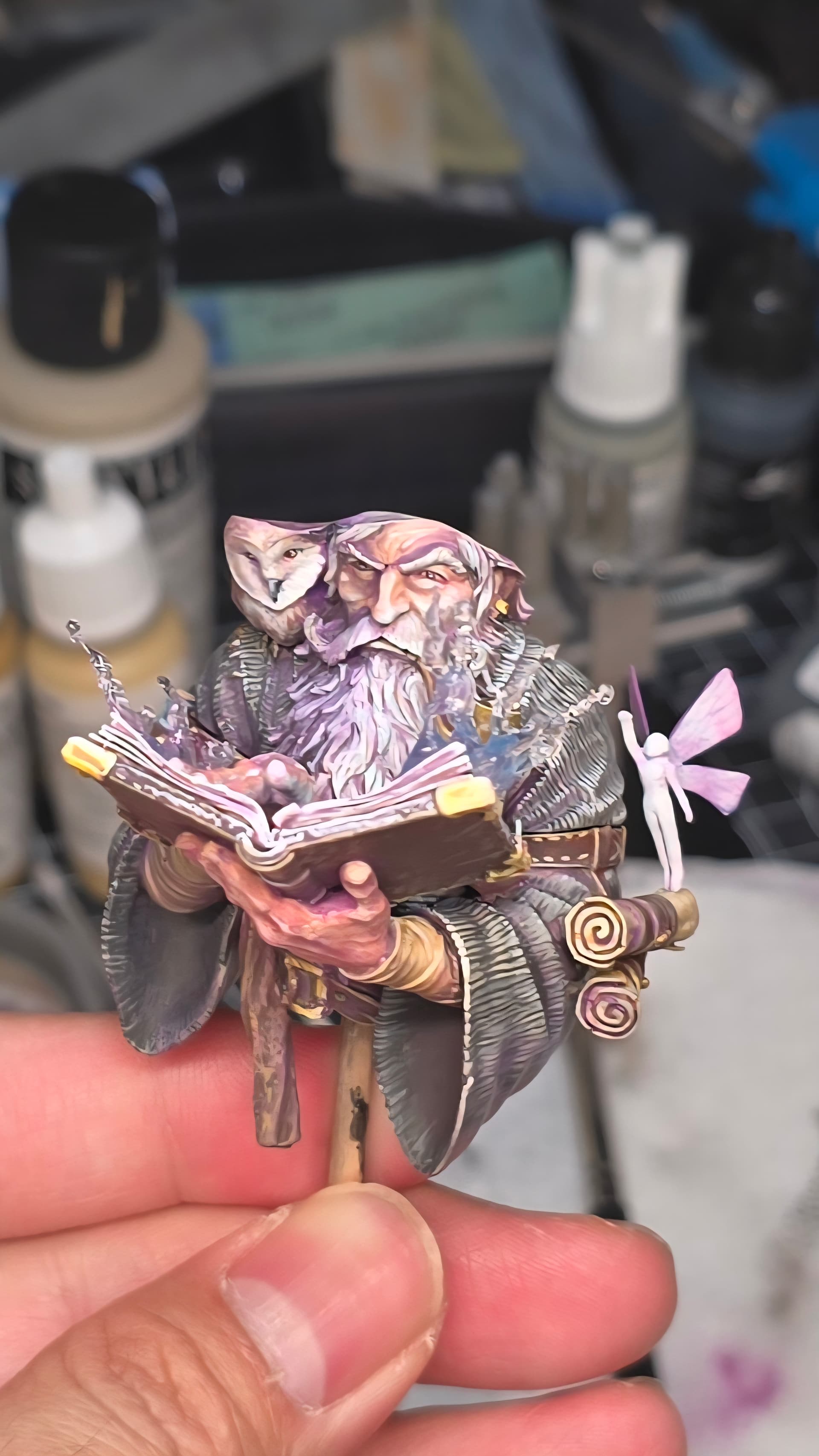 I must agree with what others have said and thoroughly commend your work on this figure- particularly your color choices. The way the pink-ish light falls across the right side of the figure suits the magical theme. I am particularly impressed by the effect you have managed on the glass vials- they have such a realistic and attention grabbing appearance.