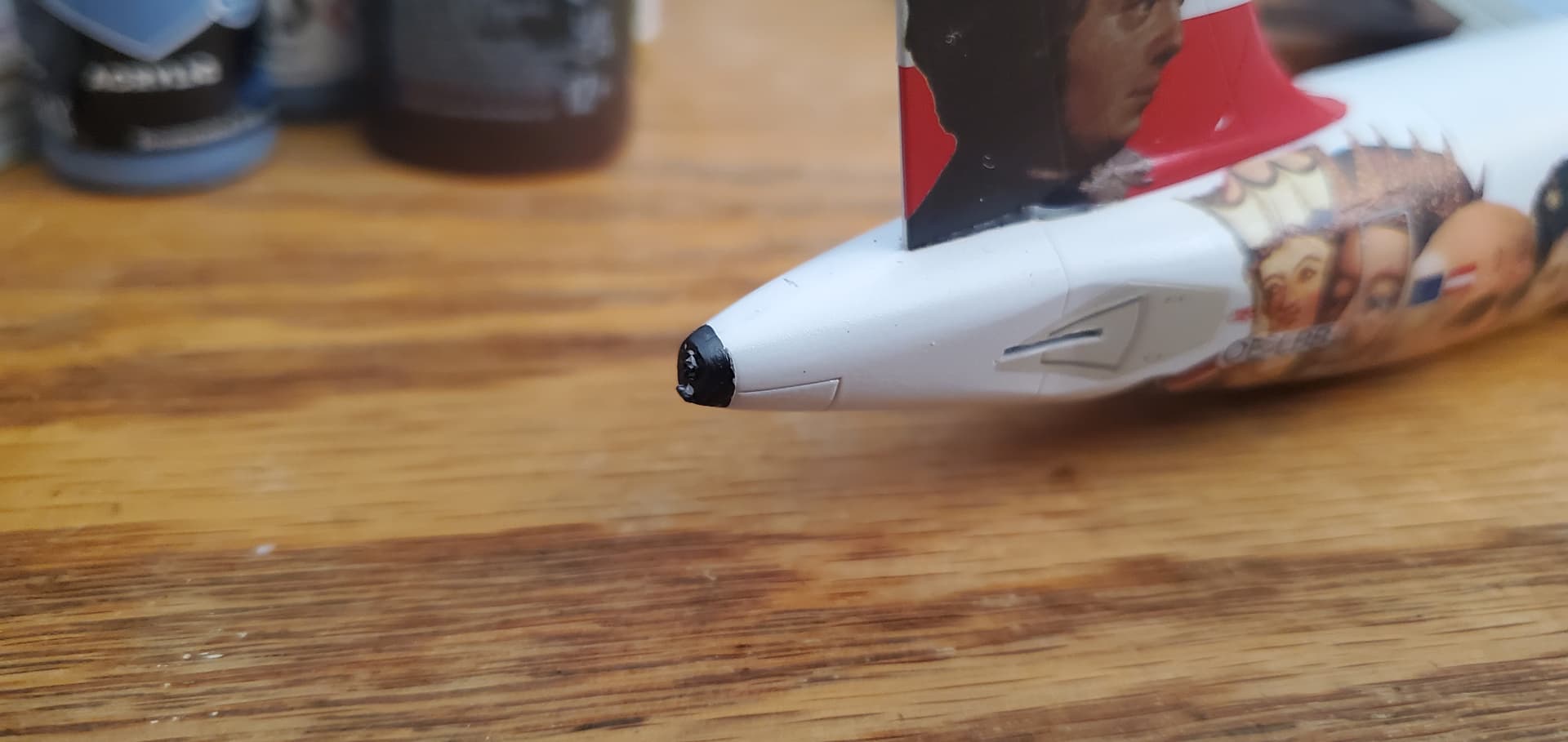 Getting closer to done. Added a pinwash to the wings to bring out the details. I also painted on the metal area for the apu on the tail which i forgot to do previously. I will add, i had read that a big issue with acrylics is that they frequently are not properly mixed. Even if you shake them vigorously they still will result in blotchy and bad looking. So to this end i got out my magnetic mixer and the results are night and day compaired to the fan blades I painted with paint that had been shakened.