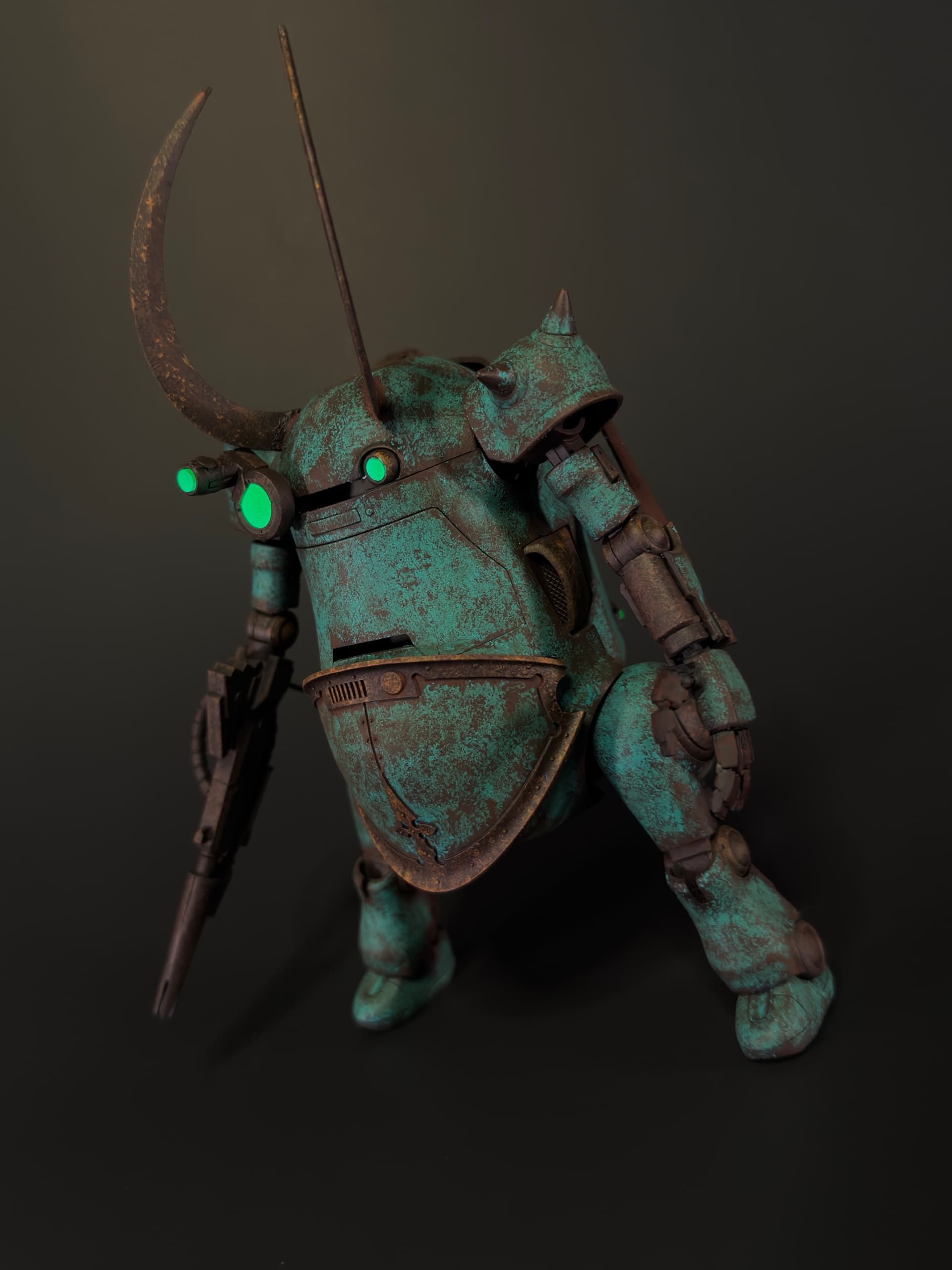 I wanted to do something with this quirky little mech design to make it a little more Grimdark. The goal was to give it aesthetic elements that were at the intersection of steampunk, cyberpunk and diesel punk. Went for an abandoned, heavily rust corroded look. Kitbashed with parts from different scales Gunpla kits as well as Warhammer parts with some light custom work and modifications. Stipple textured with Mr surfacer 500 and hand painted in acrylics.