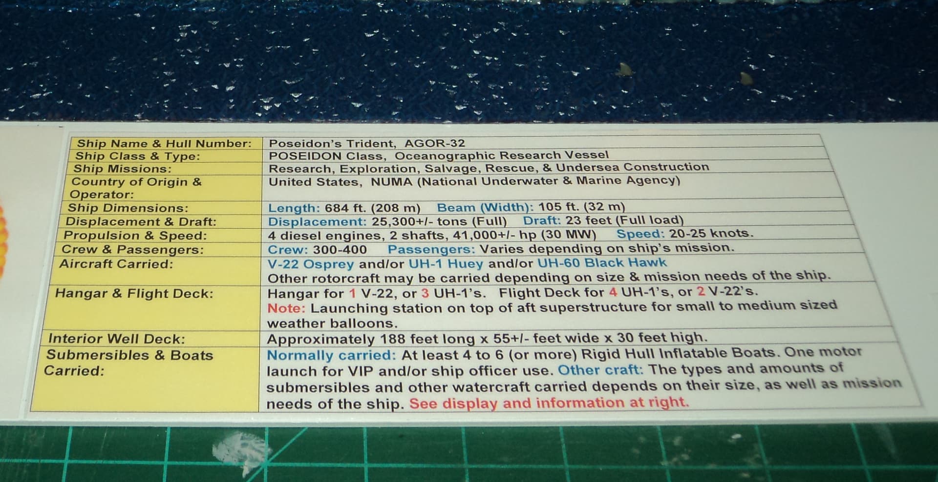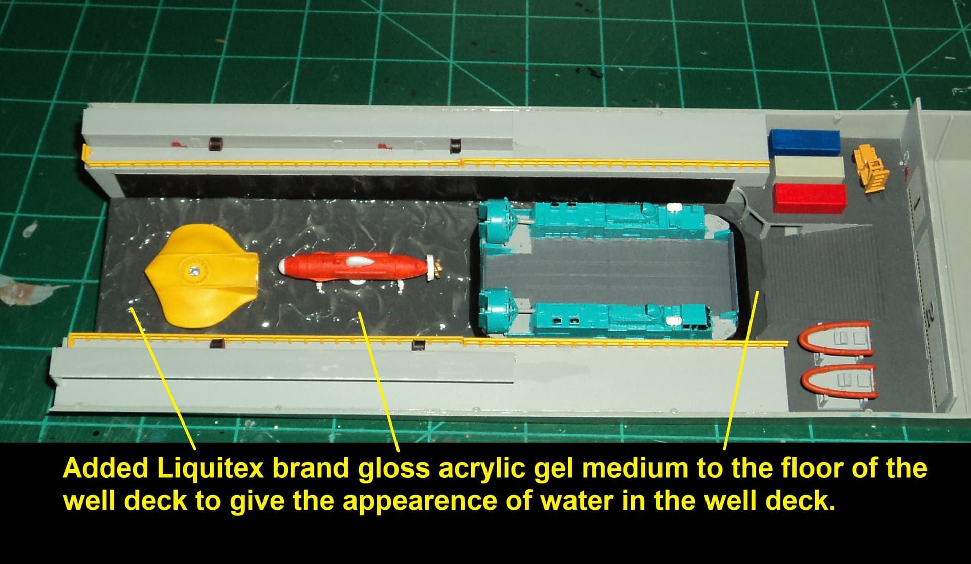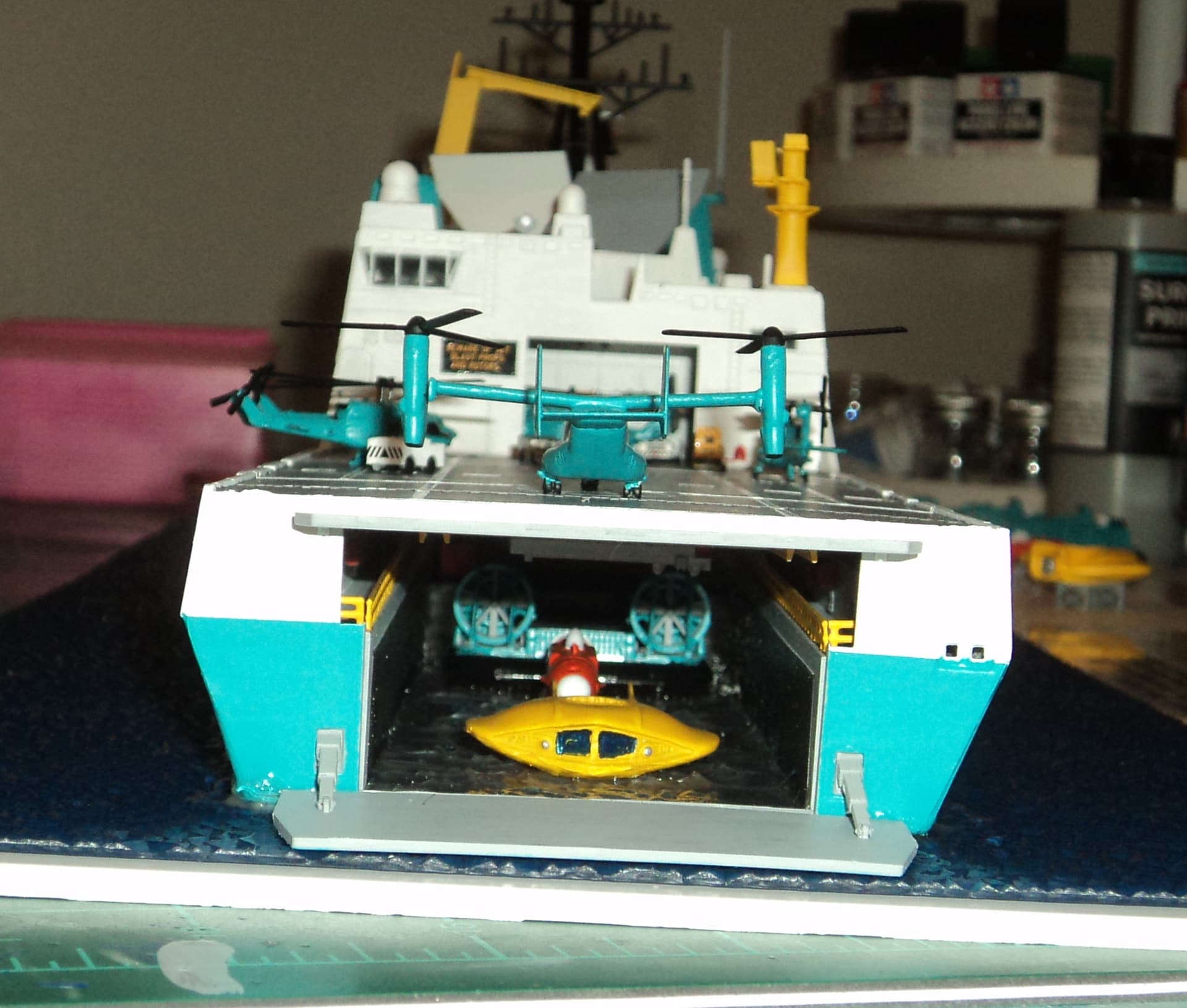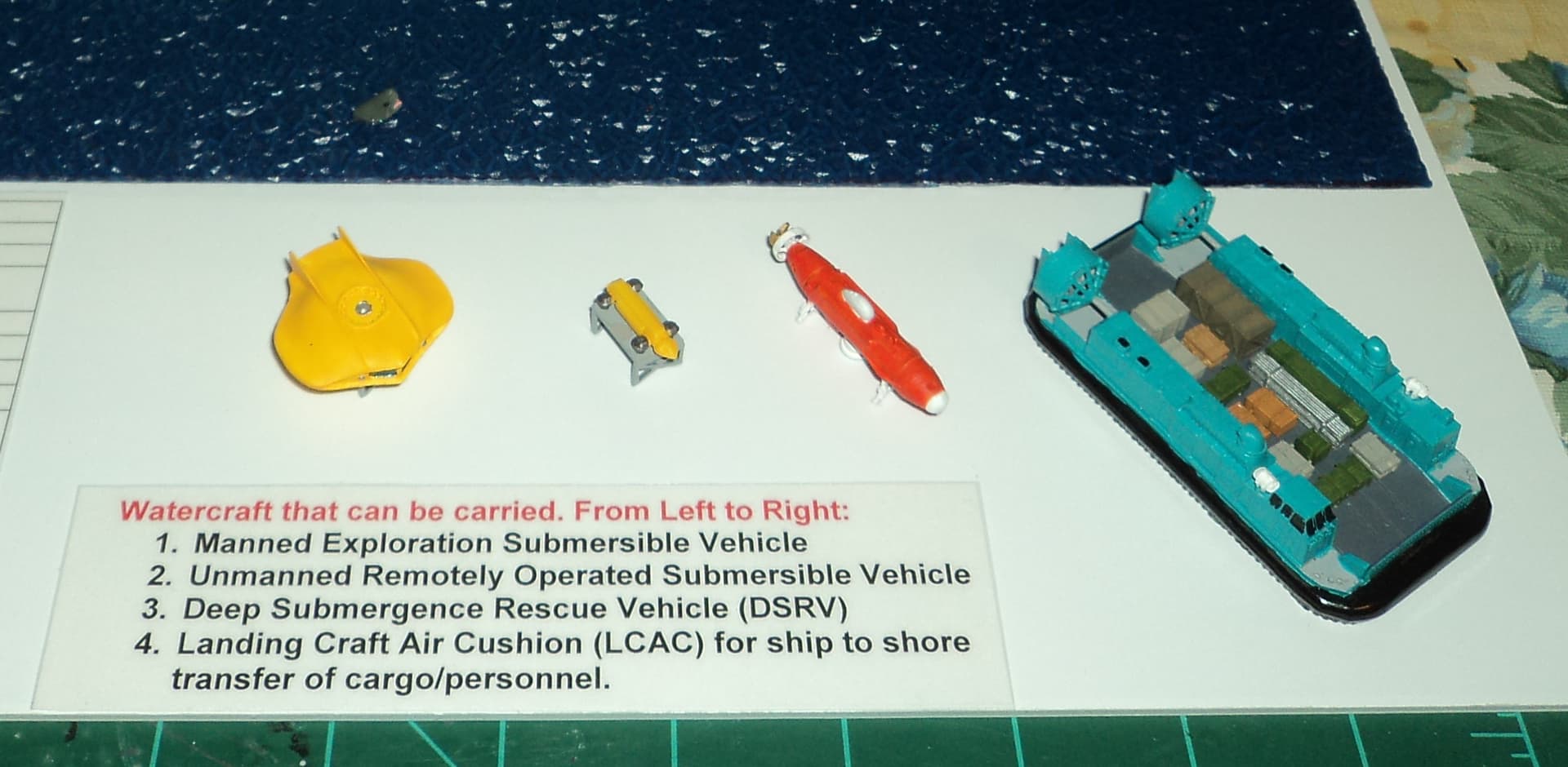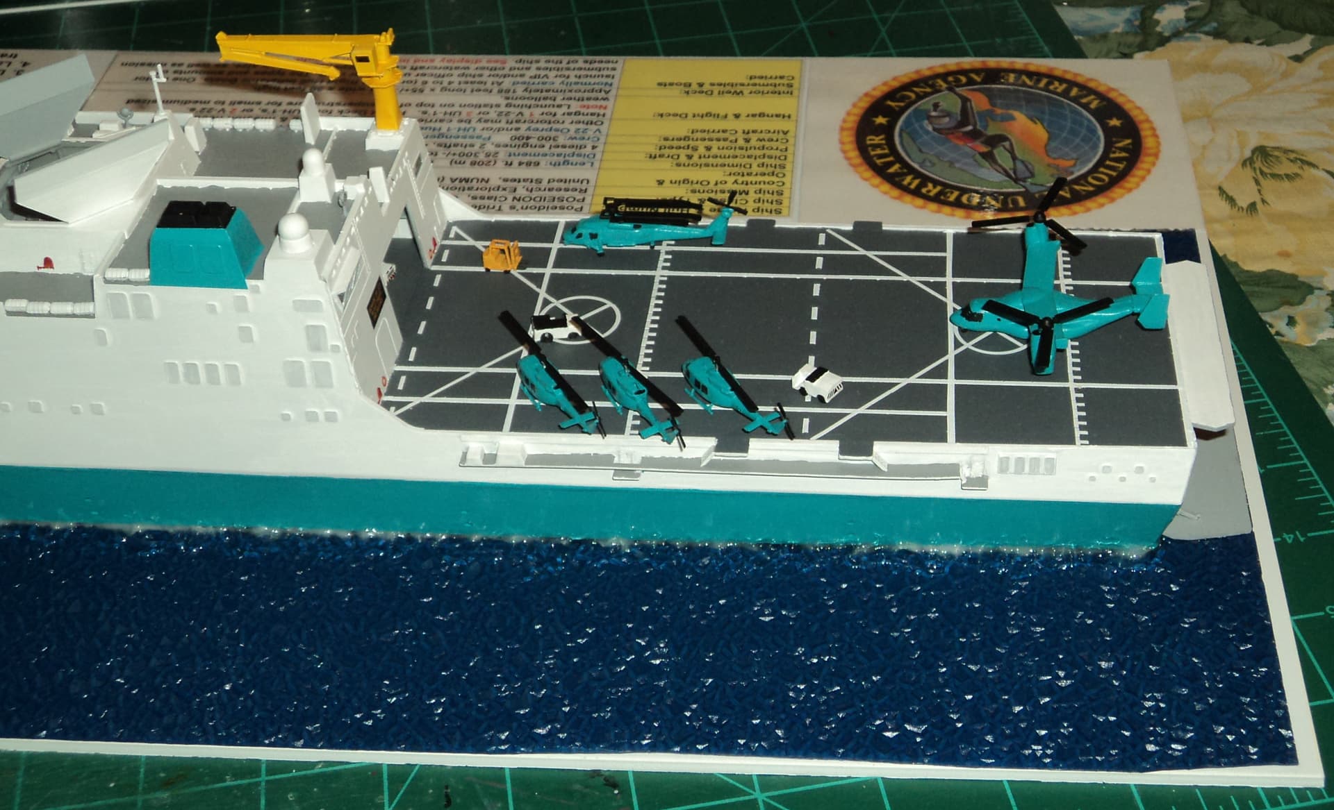 The main ship is a Bronco Models USS San Diego LPD-22 US Navy amphibious ship that was converted into an oceanographic ship for research, exploration, salvage, rescue, and underwater construction.