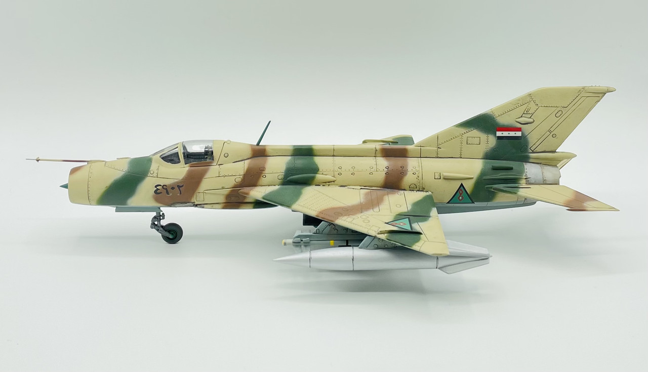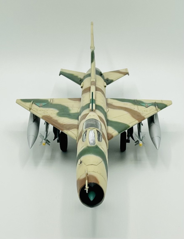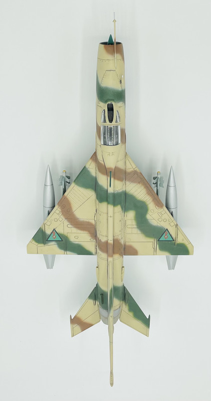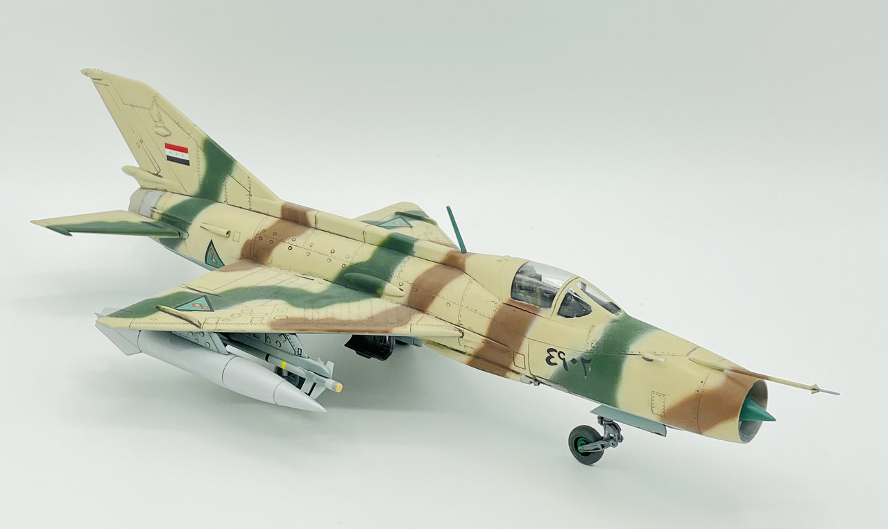 This one is finally done. I originally started this probably 10 years ago or so, then sidelined it due to a couple of moves and not being happy with my original start results. I pulled it back out a couple of months back and decided not to get all wrapped up in the kit’s errors. It’s a Chinese company’s modified clone of the Academy Mig-21 kit. There are plenty of goofs in the basic kit, so if you come across one yourself, keep on looking for something else. I used some SuperScale decals for the Iraqi markings and swiped a pair of Matra Magic missiles from another kit in my stash. It’s not my best work, but I’m happy to get it off the shelf of doom and onto display.