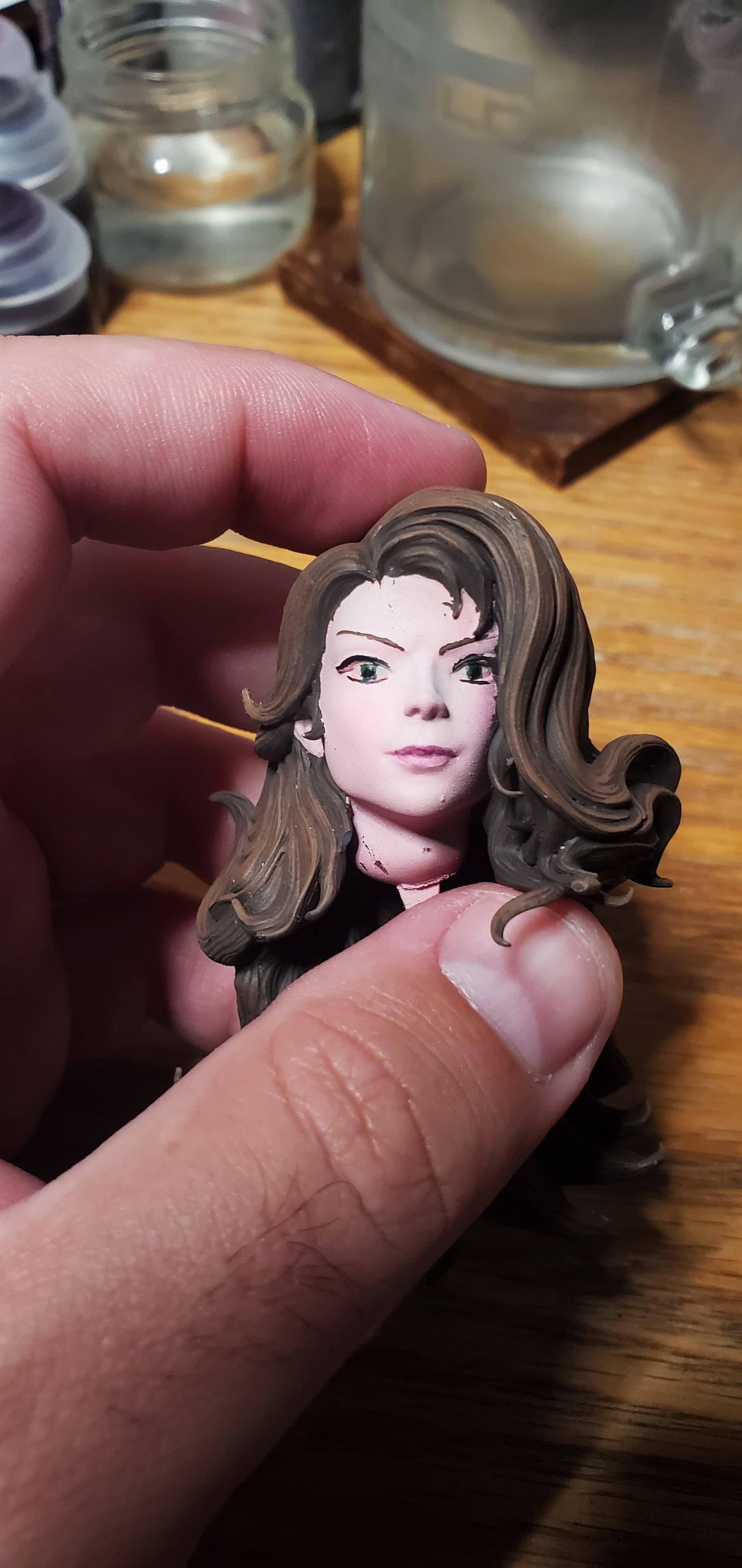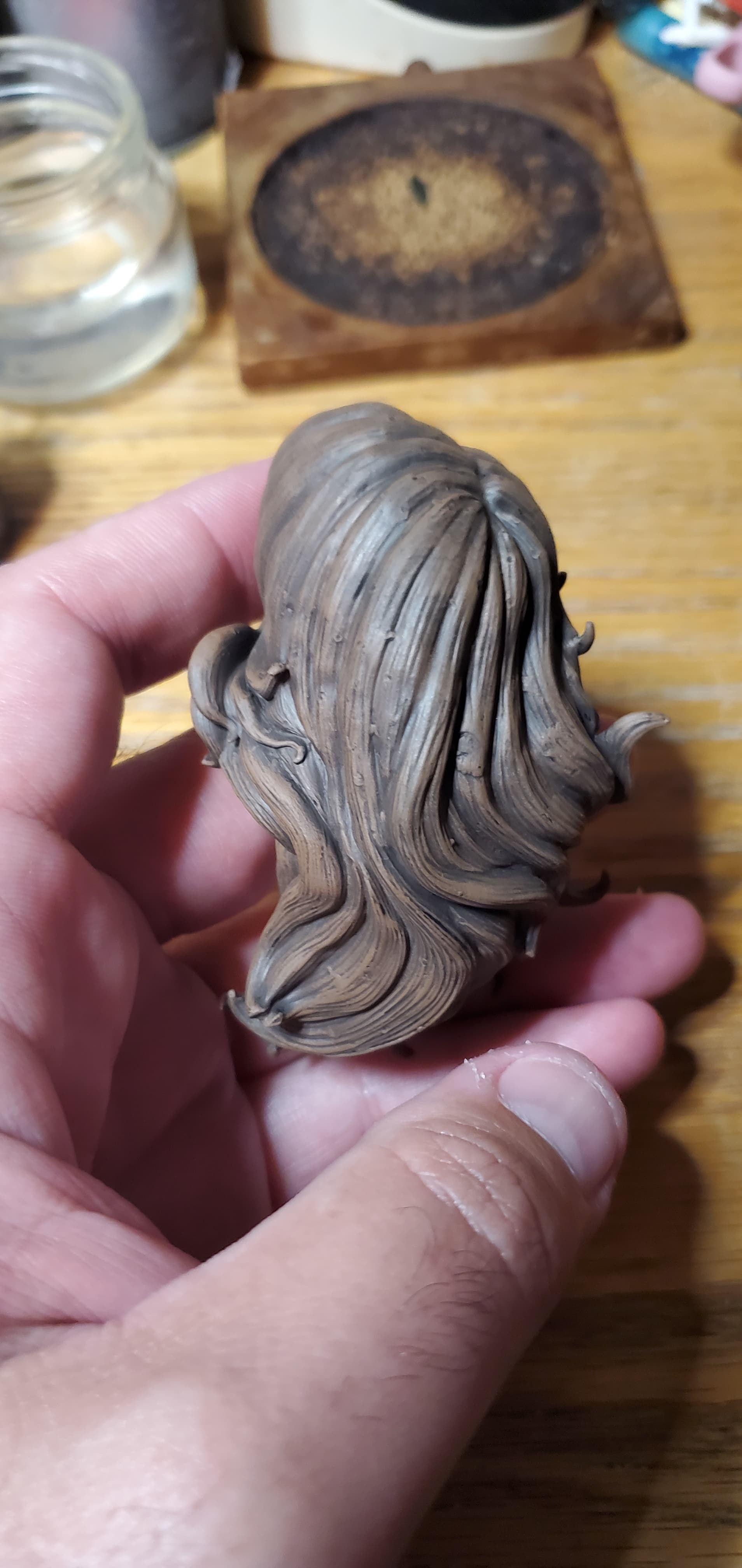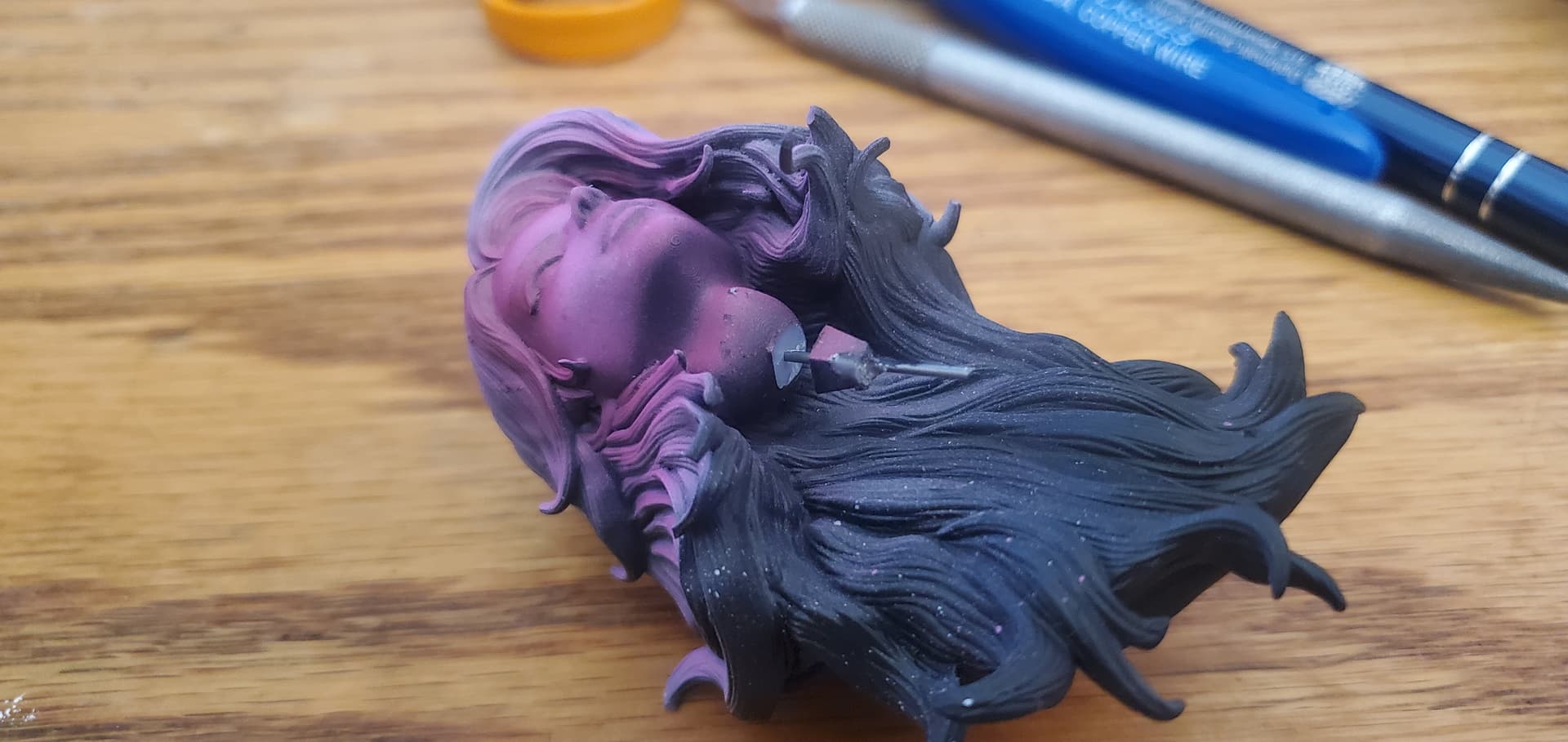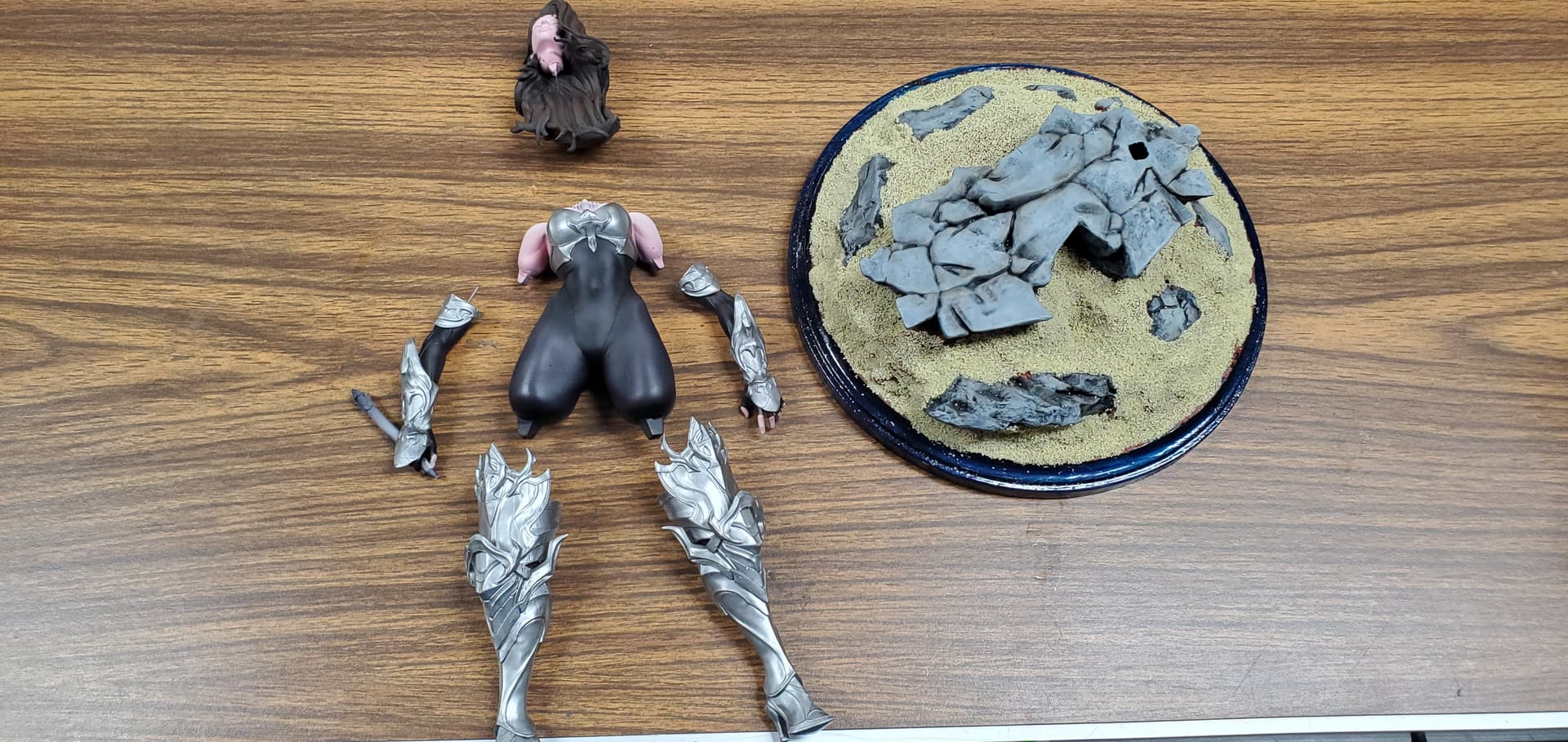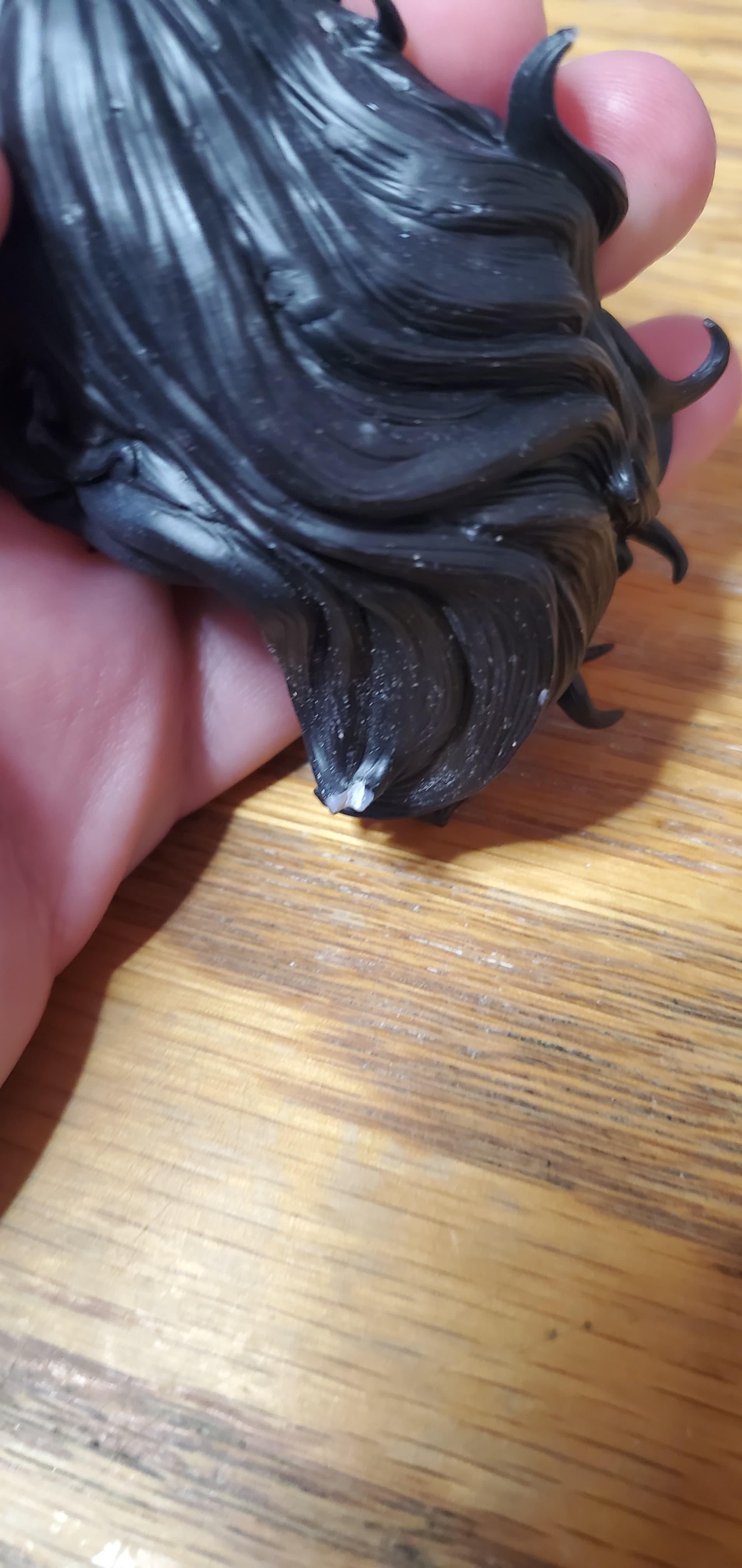 So first up, aside from the areas that will need repainting, a couple of the attachment point broke. These should be easy to fix with some CA glue. No real problem there. Where i have a more serious problem is the hair. The small breaks i can fix relatively easily to make then appear as natural terminations. Its this large break where i am unsure what to do. Its too thick to easily sand to an end, i really dont want to try and create a new extension (both for doubts on my ability to make it look natural and time constraints as i would still like to try and get her done by the 7th of June to make the contest). What i am leaning towards is using a dremel to reshape the end some first and then truncate it. However i would like to hear some other opinions first on how i might proceed, see if there is another solution i am not seeing.