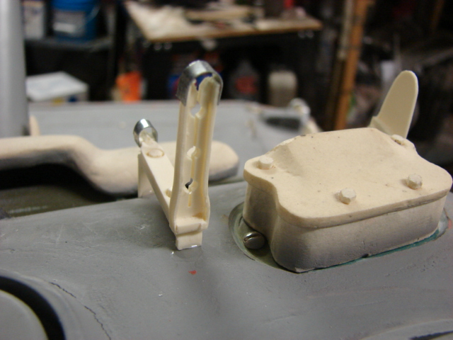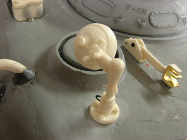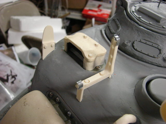To install the hatches some modifications were made to the tank’s hatch wells. Slots were cut into the wells for the hatch handle, and the counter spring arm. Panzerwerk US periscope bottoms were added to the hatch, and mounts for the pad lock and foul weather driving hood were also added.