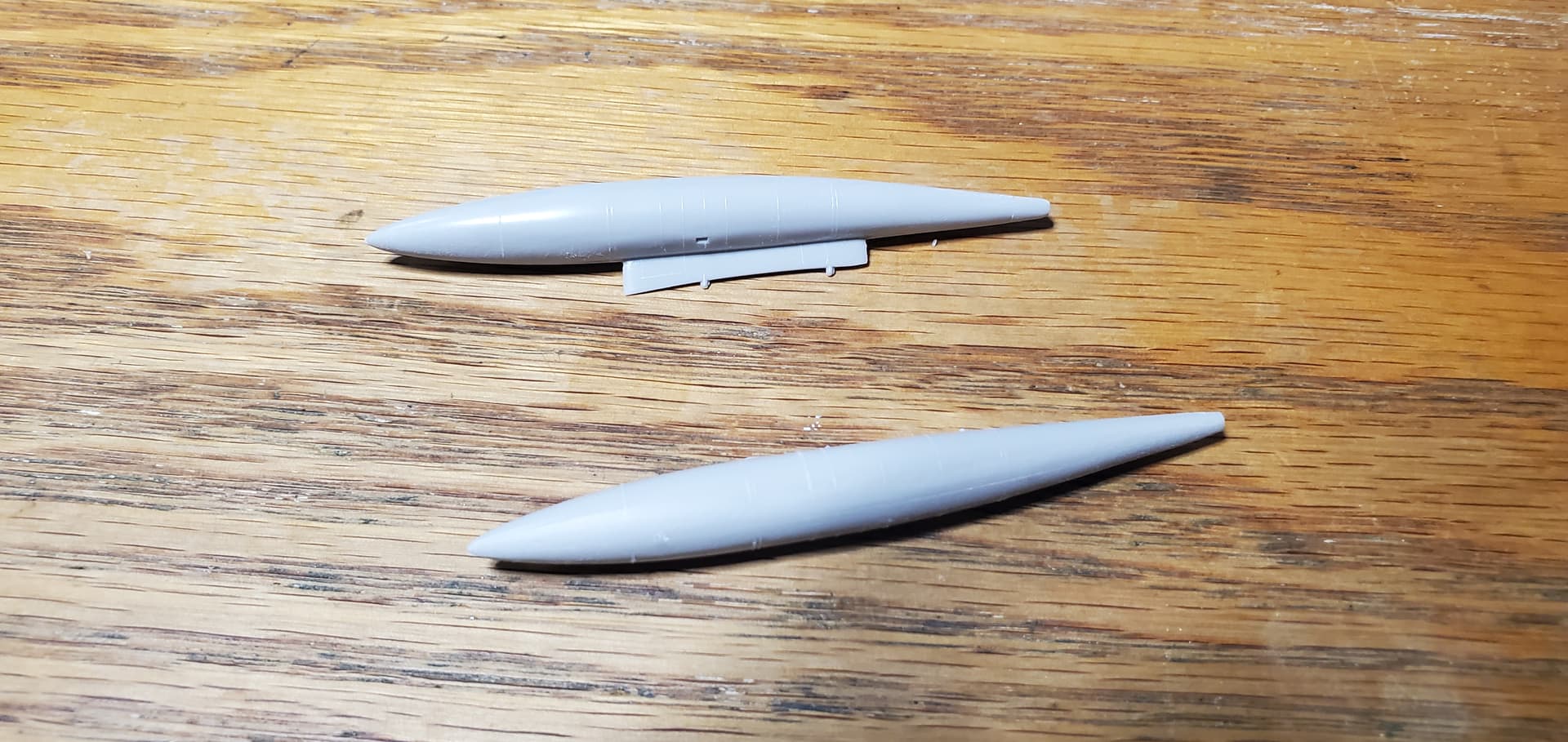 Next did the drop tanks, assembling the two halves on the sprue before cleaning them up off the sprue. Not pictured is the results of adding the tails.