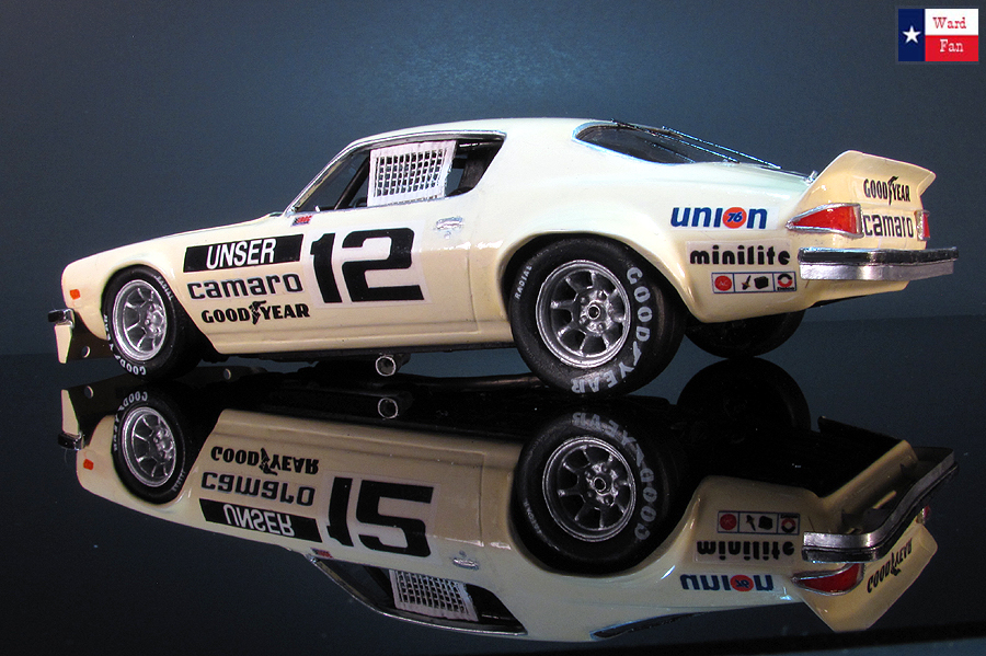 This model depicts the iroc 2 champion Bobby Unsers car. 1974 was the first year Camaro was used as the iroc car. It was basically a stock Camaro with a roll cage and a Traco 336 c.i. engine making 440 horsepower. they built 15 of them and raced 12 with 3 as reserve cars. If you google iroc 1974 you will find a lot of stuff on them. Thanks everybody for the great feedback.