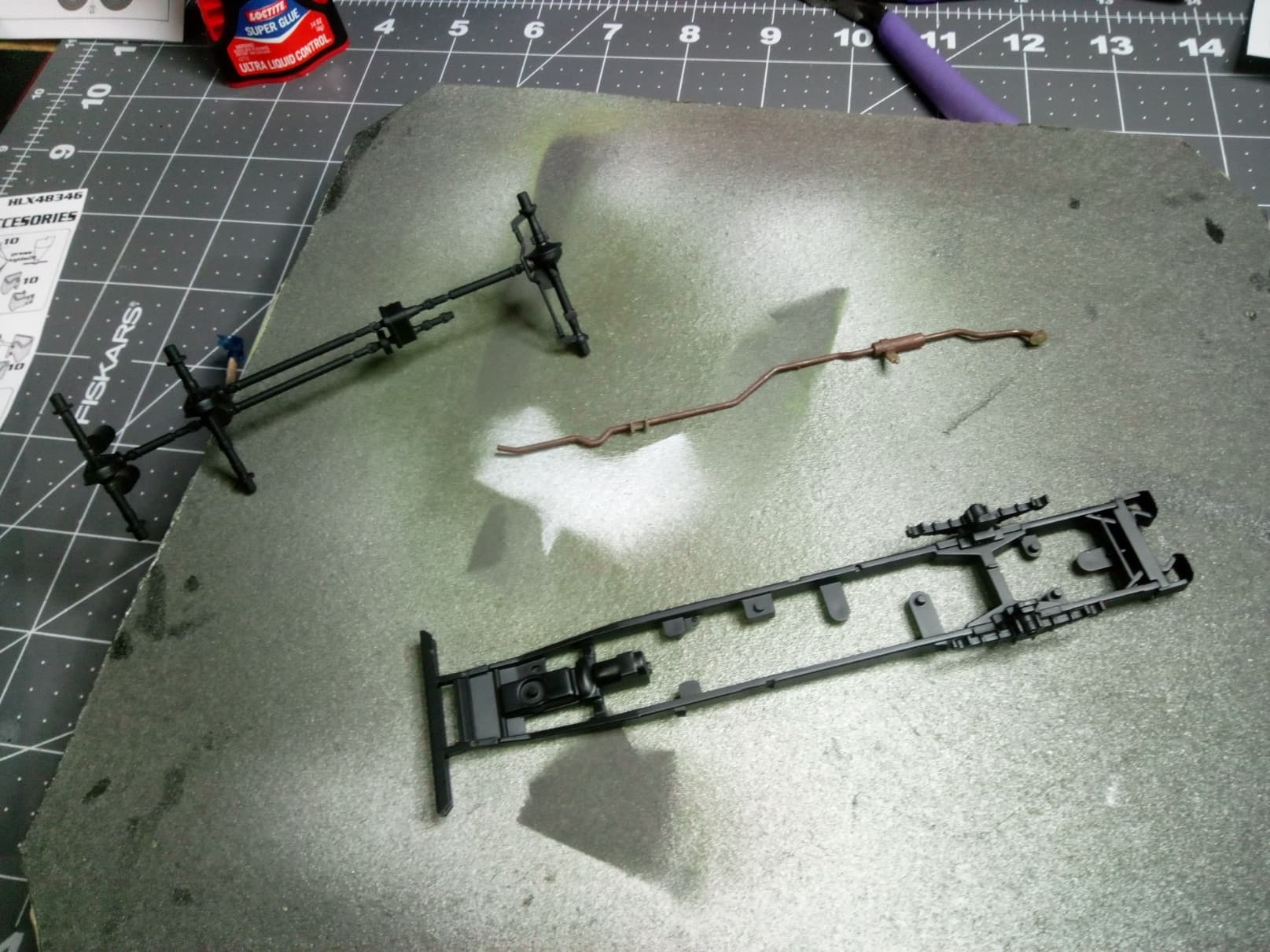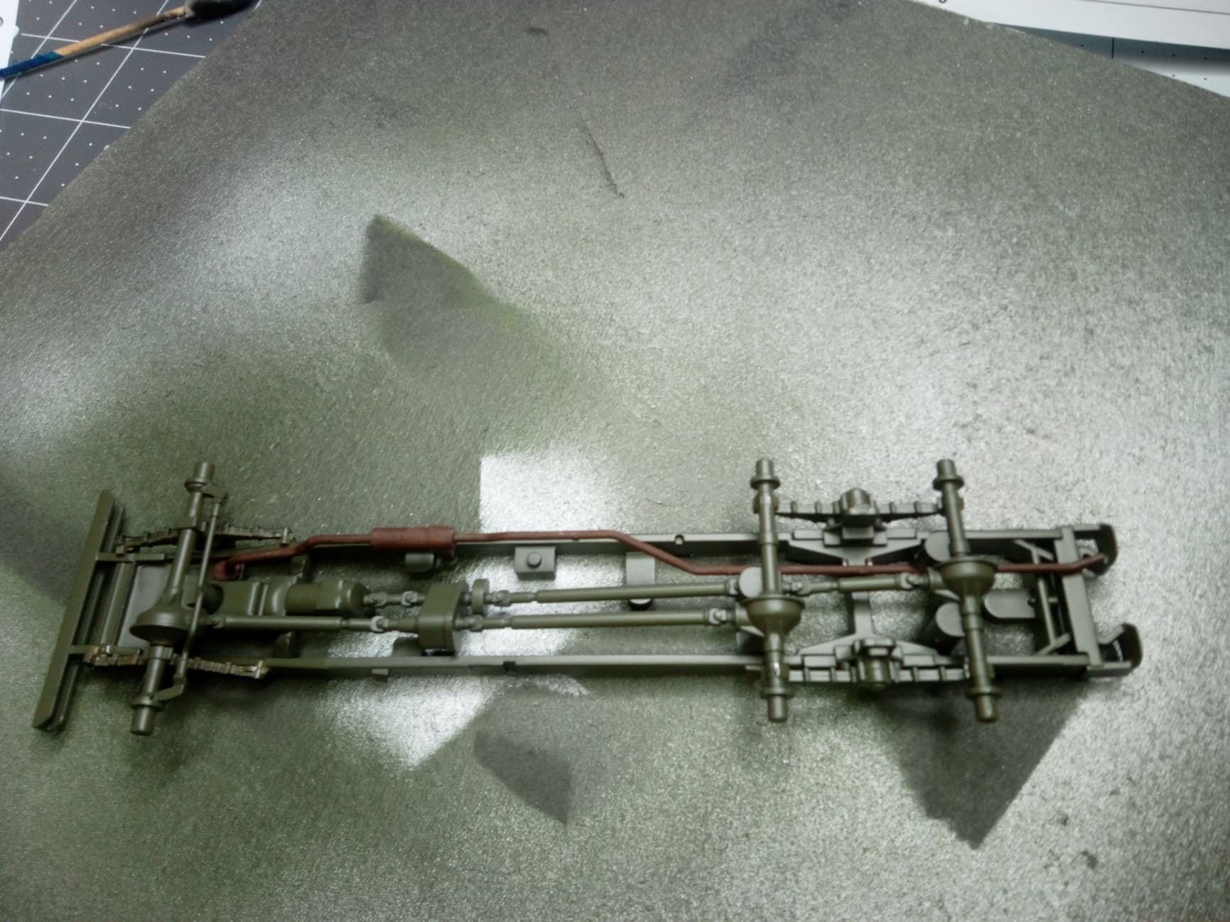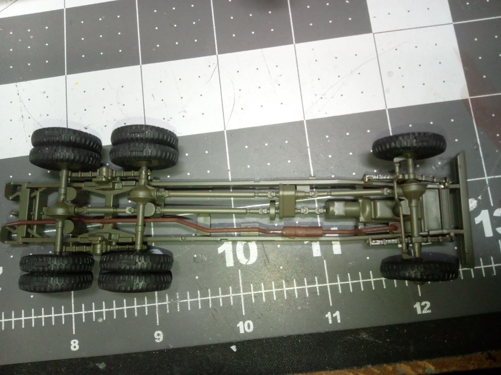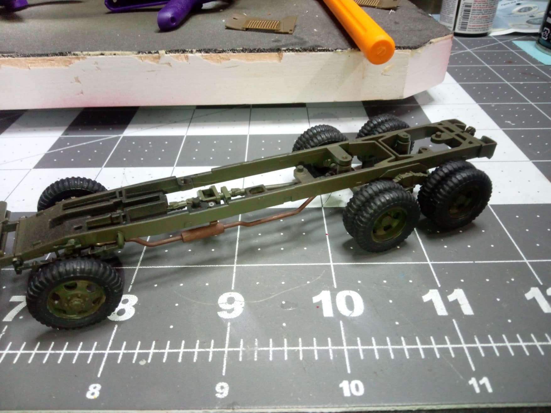 Back at the bench today. Lots of starts and stops due to dropping my dog off at the groomer and having to go get him, but a got a bunch done on the fuel truck. I got the rolling chassis completed. I added some aftermarket sagged wheels in place of the kit wheels. They look great, were made for the Tamiya kit I’m building, but they didn’t fit right out of the box. I had to drill them out to fit the axels. No big deal.