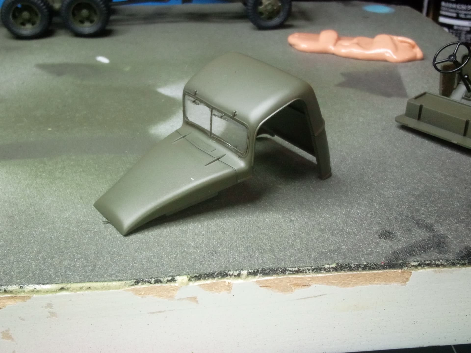 Started to assemble the cab. Got the roof and dashboard in. Fought the ill-fitting windshield all the way. There is very little in the way of tabs or supports for the windshield, on top of the fact that it is misshapen. I got it, but I’m not real pleased with it. Then the dinner bell rang, so that’s it for the night.