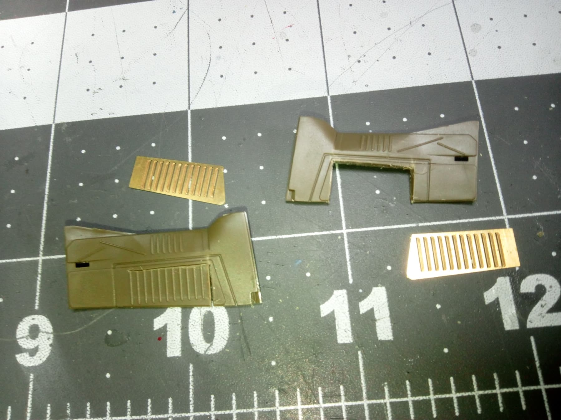 It took about five hands to get it all set and square. Before I show the completed unit, I upgraded parts E30-31 by cutting out the louvers and putting in PE louvers…big difference! If you zoom in you can see through them just like the real deal.