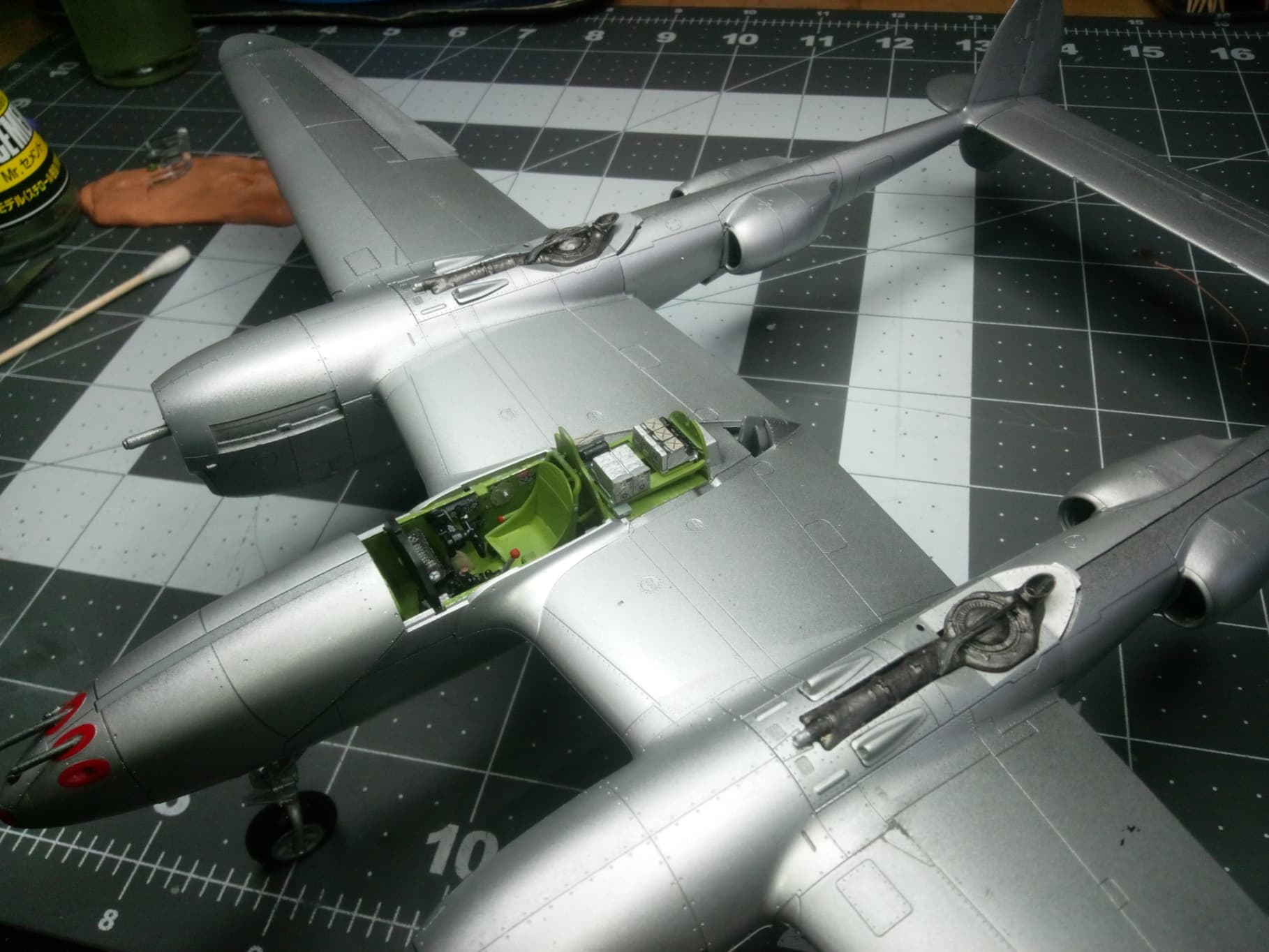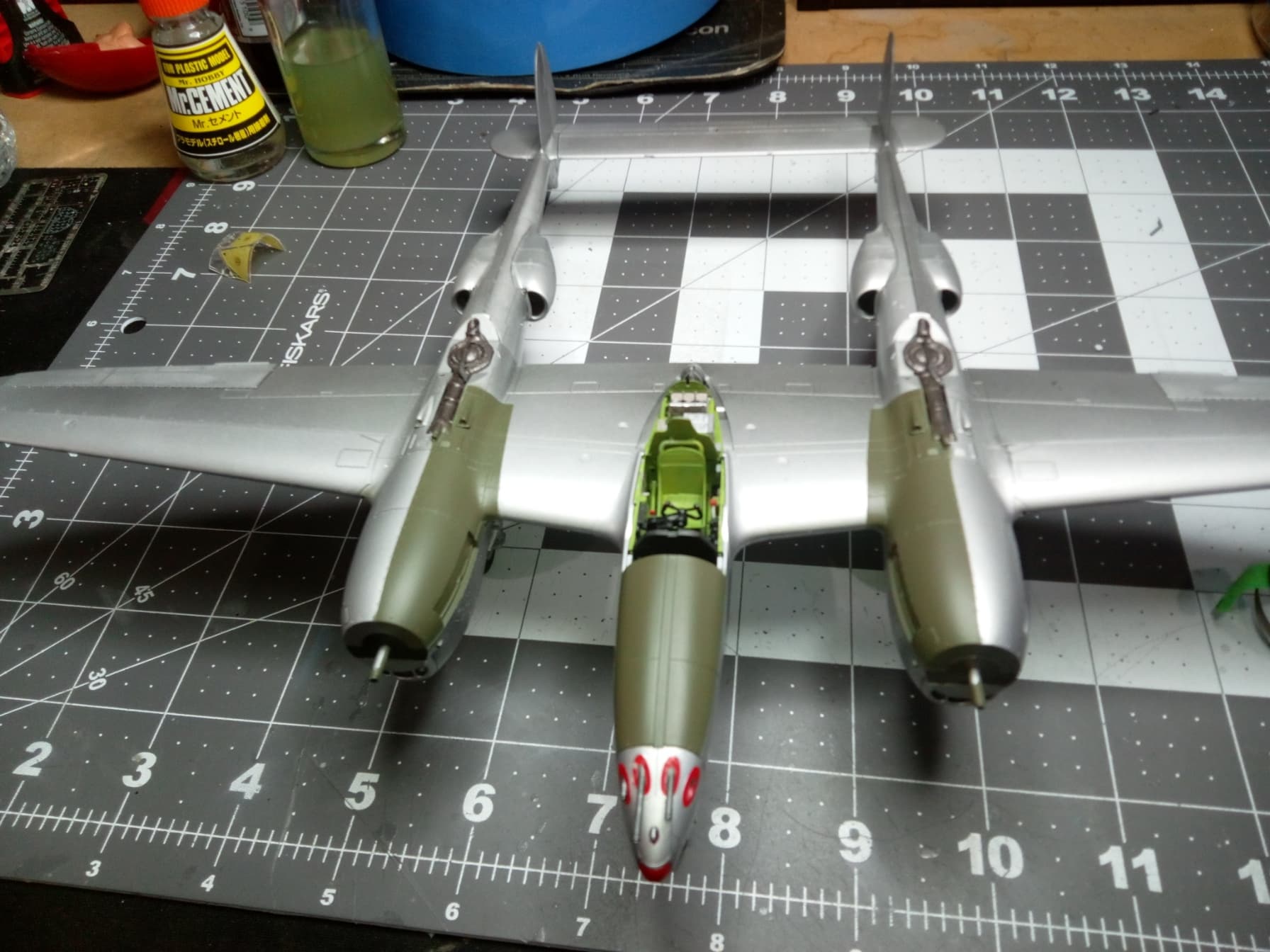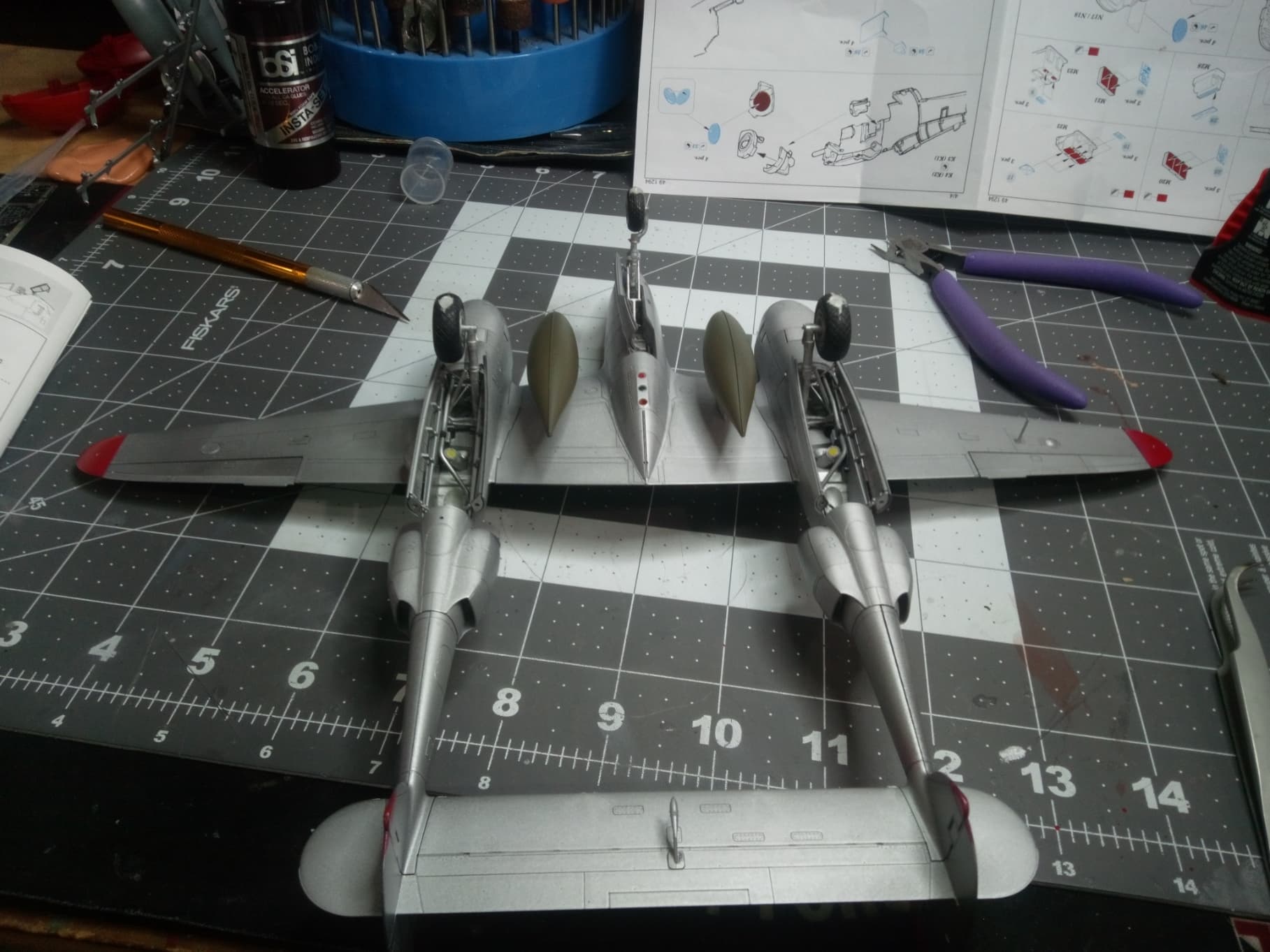 Got back to the bench this week and completed lots of stuff. Got the red painted on the wingtips and tails. Got all the canopies painted and their parts installed (gunsight and rear canopy stuff). Got all of the landing gear doors installed. Drop tanks installed. Nothing left but to install the props, paint the pilot, gloss coat, decal, dull coat and install the canopies. Inclement weather will prevent me from shooting the clear until next week unfortunately. Gives me time to paint the pilot.