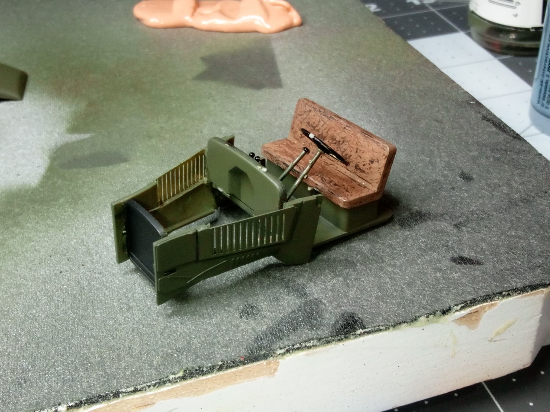 I then added the seat which I decided needed distressing. So, black primer, flat dark brown, chipping medium, and flat buff, and you get my very first attempt at making smooth plastic look like distressed upholstery. What do you think?