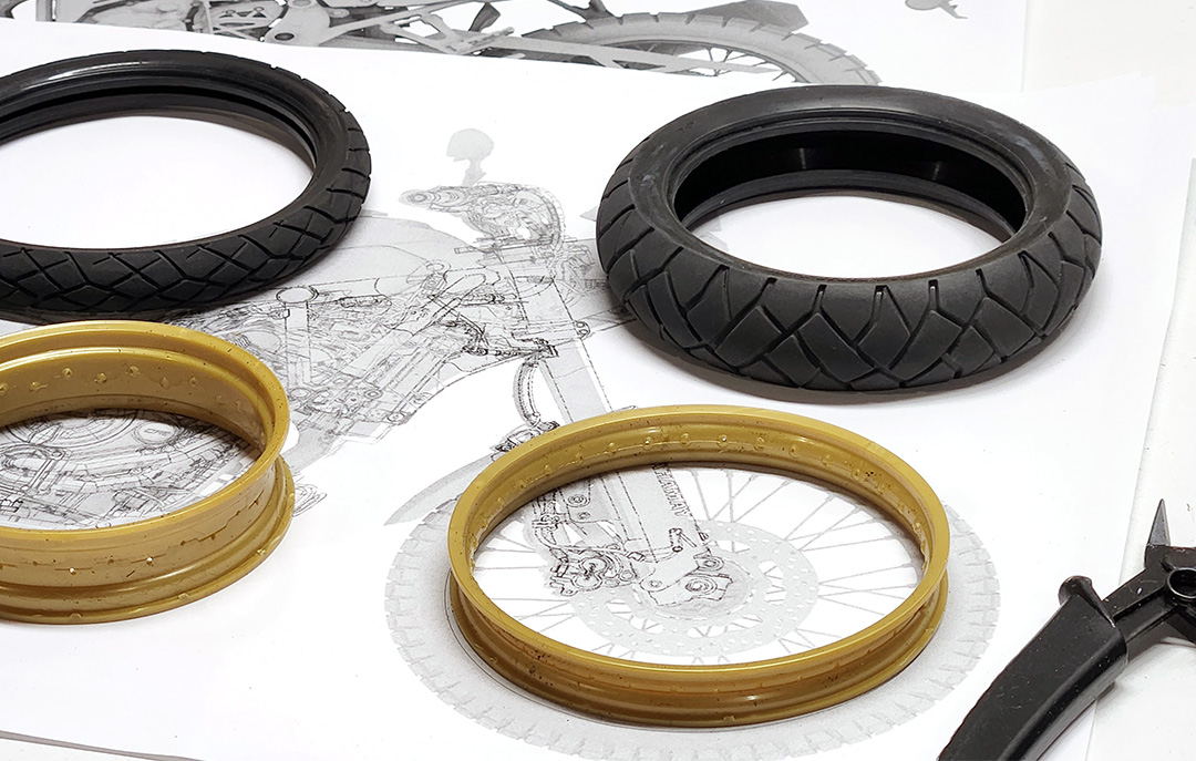 With the model checking out, I used the wheel rims from the Africa Twin model as size references, scaled the “blue prints” I had rendered, and printed them actual size. Here they are along with the rims assembled and the mold lines on the tires removed. The rim seams still need putty/sanding.