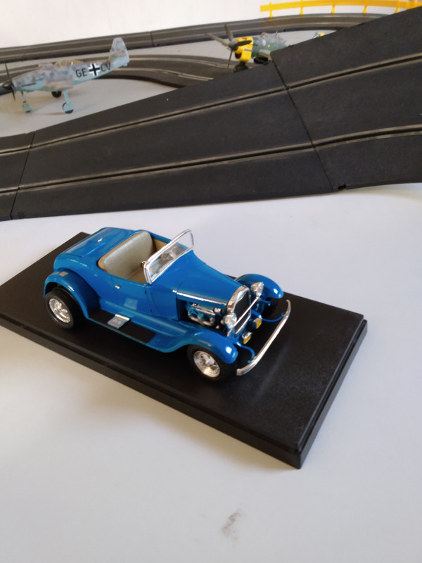 This is my '29 Ford Model A Roadster Lowboy. It is painted with Tamiya TS-53 Deep Metallic Blue. The model features a wired small block Chevy with three deuces with an automatic transmission, chrome mag wheels with spinners. It also has a '32 front grille and scratch-built radiator supports.
