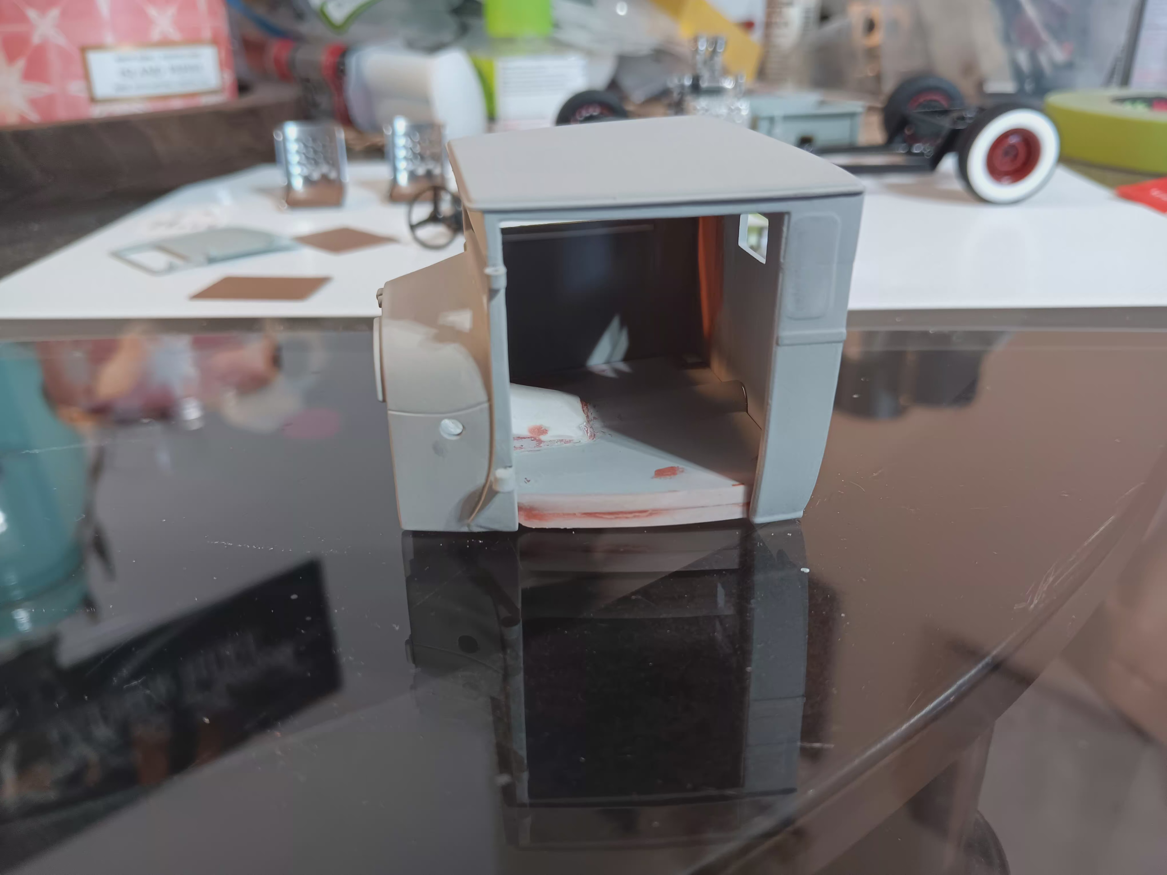 Making some more progress. I built a battery box for an old 6v I found. Drilled out the posts and added craft wire that perfectly fits the terminals. The body work was mostly completed, so I made some wood panelling from 5mm strip while waiting for the filler to set up and started the trans tunnel. I sculpted the bell housing area from epoxy putty and then heat formed .20 styrene for the driveshaft tunnel. Some filler work added to the floor as well as some strips to close up the body gaps.