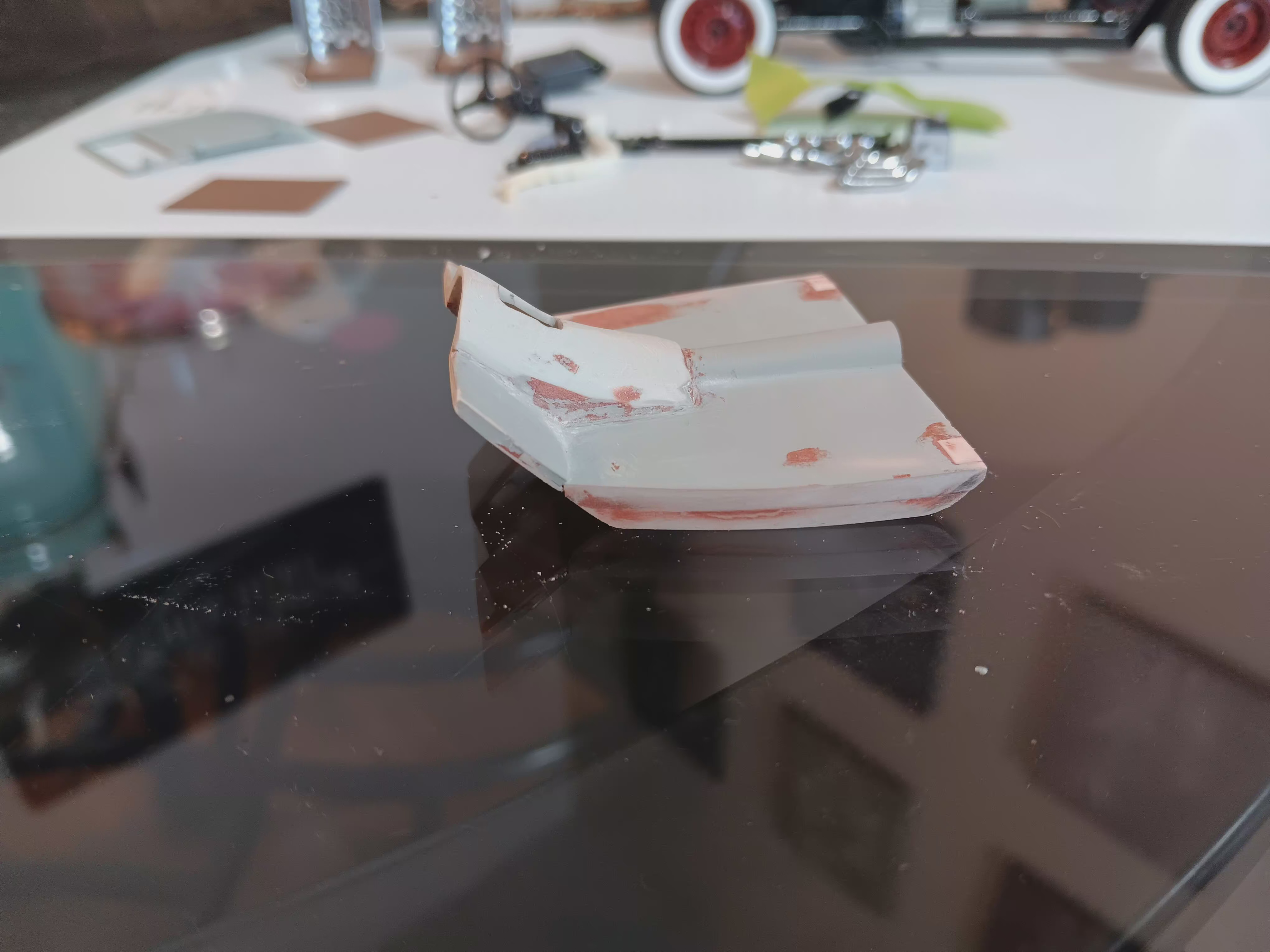 I haven’t posted in a few days as I have been busy with life… but I have been getting a little time in here and there. I got the floor about 95% some more filling and maybe an epoxy shift boot. When shaping the tunnel out of epoxy, I didn’t realize the shift mount added 1.5 mm in height at the base, whoops. I had to file the excess from the hole until it cleared and the floor sat flat on the chassis. I need to add another strip under the floor to close the rest of the door gap, but my new problem is the floor is already extremely tight fitting after adding the one strip to each side. I might just have to leave it as is and go with it. I also got the rest of the engine parts painted up and assembled. I am going to have to source a 6v starter. The 3d engine came with a 6v generator and a 12v starter… make that one make sense.