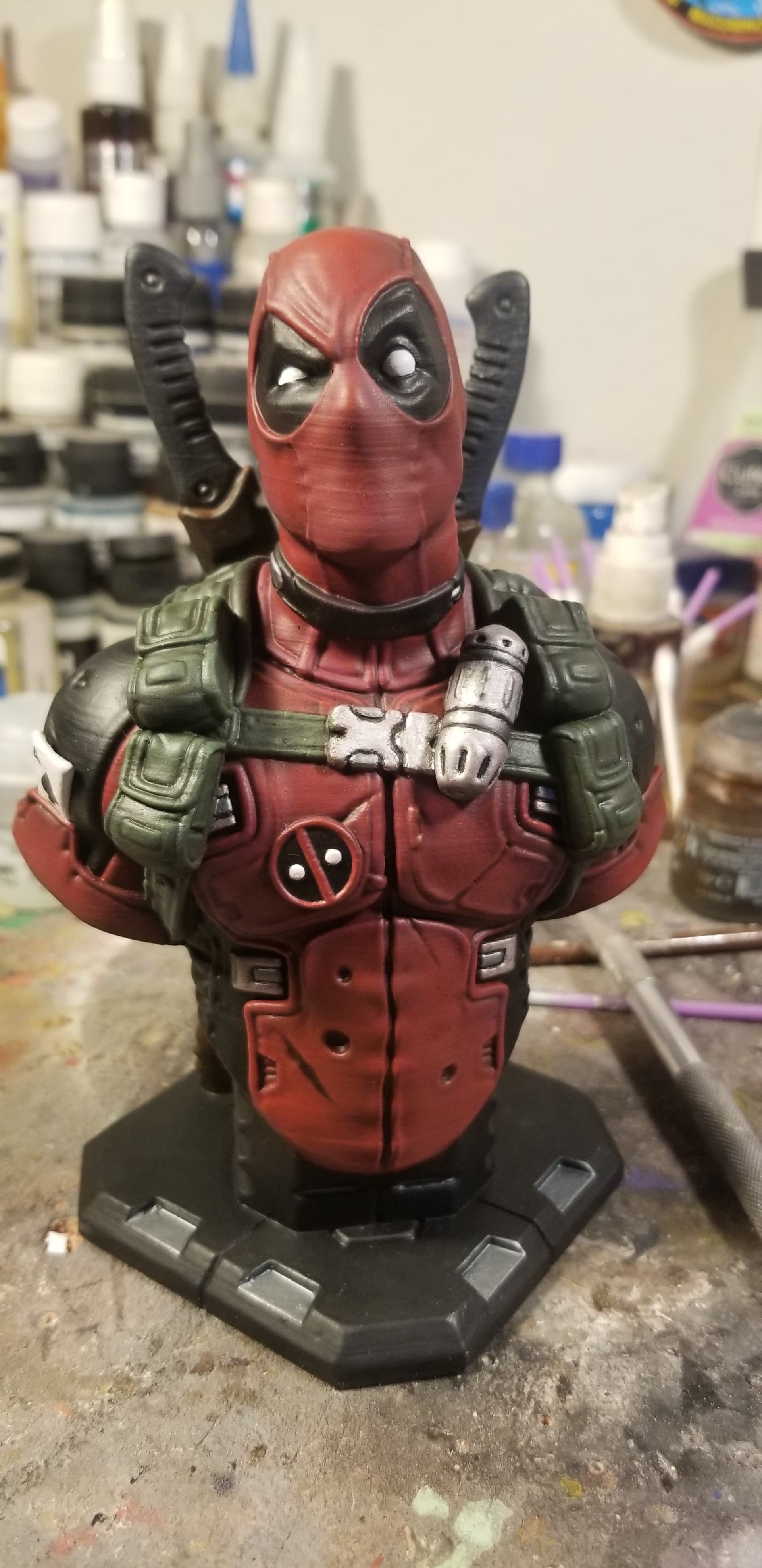 A friend asked me to paint his Deadpool bust. It’s a FDM 3D print with some significant print lines. Nevertheless, I blocked in the colors and now moving on to the shading and weathering. Using a combination of acrylic and oil washes. Should have it done in time to give it to him next week!