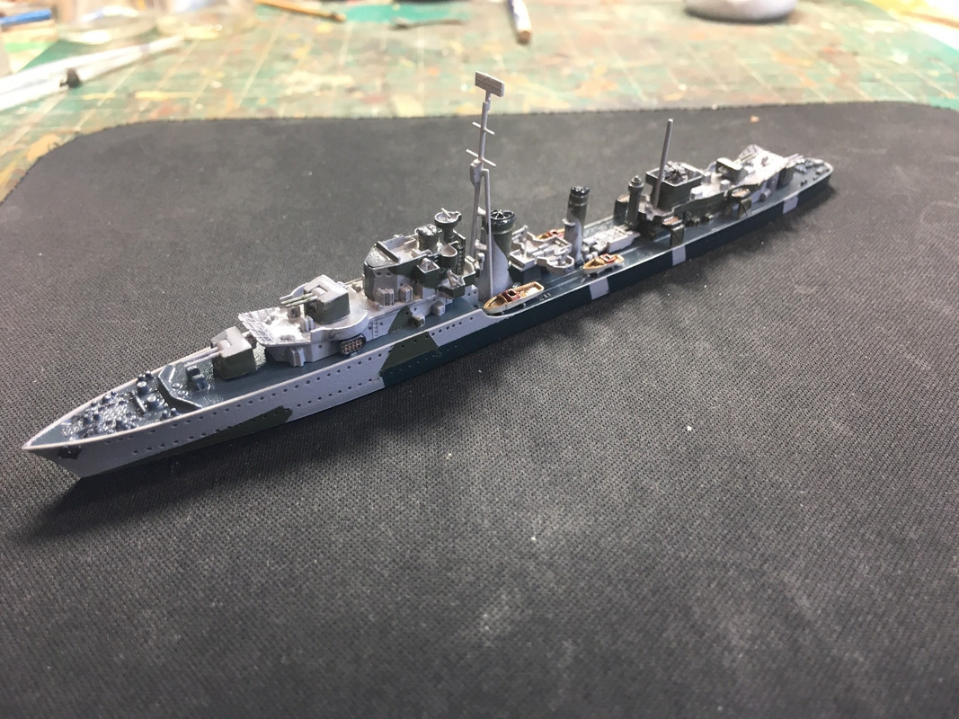 I should have painted camo colours on the superstructure and funnels with them off the deck. Much harder to do once in place. Got a gloss coat of Vallejo gloss acrylic varnishon it to prep for decals and washes. Seems to go on smoother and shinier than the alclad aqua gloss