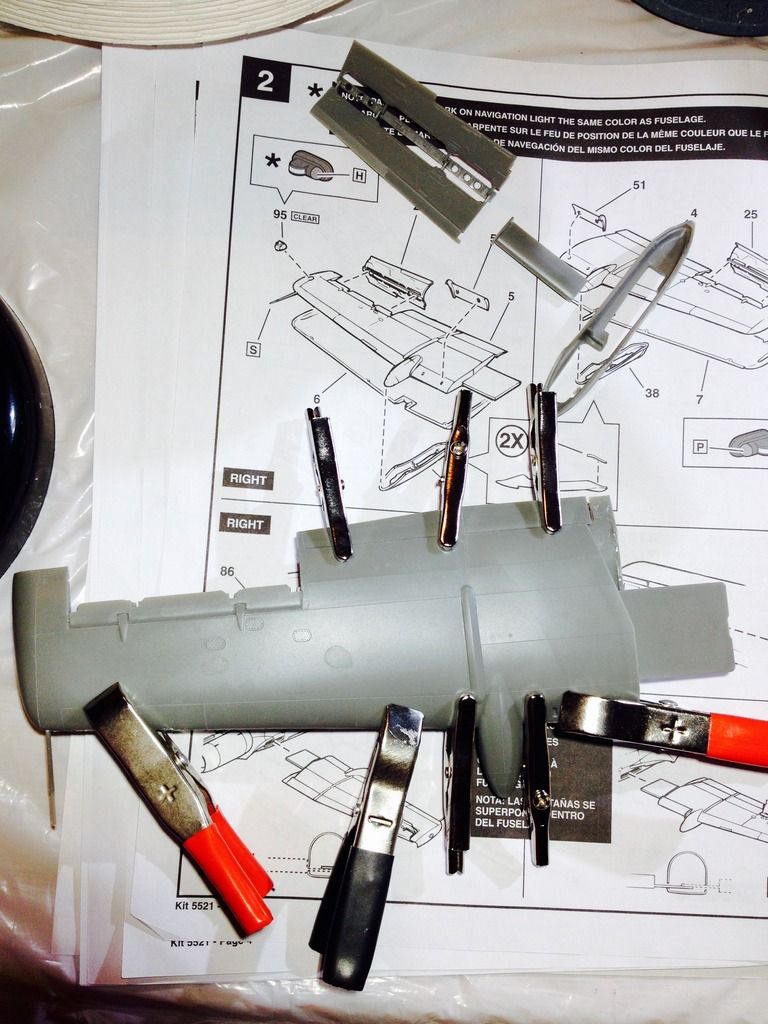 I must admit that with each addition of a part, seams and gaps were constantly an issue. I was fore warned by a forum member. Thank goodness for alligator clips, clamps, sanding material, and Tamiya extra thin cement! In the end, I showered three times yesterday just to get the plastic dust off of me. LOL! Amazingly, I used very little putty. I only needed to putty the two gaps of where the twin engine connects to the fuselage.
