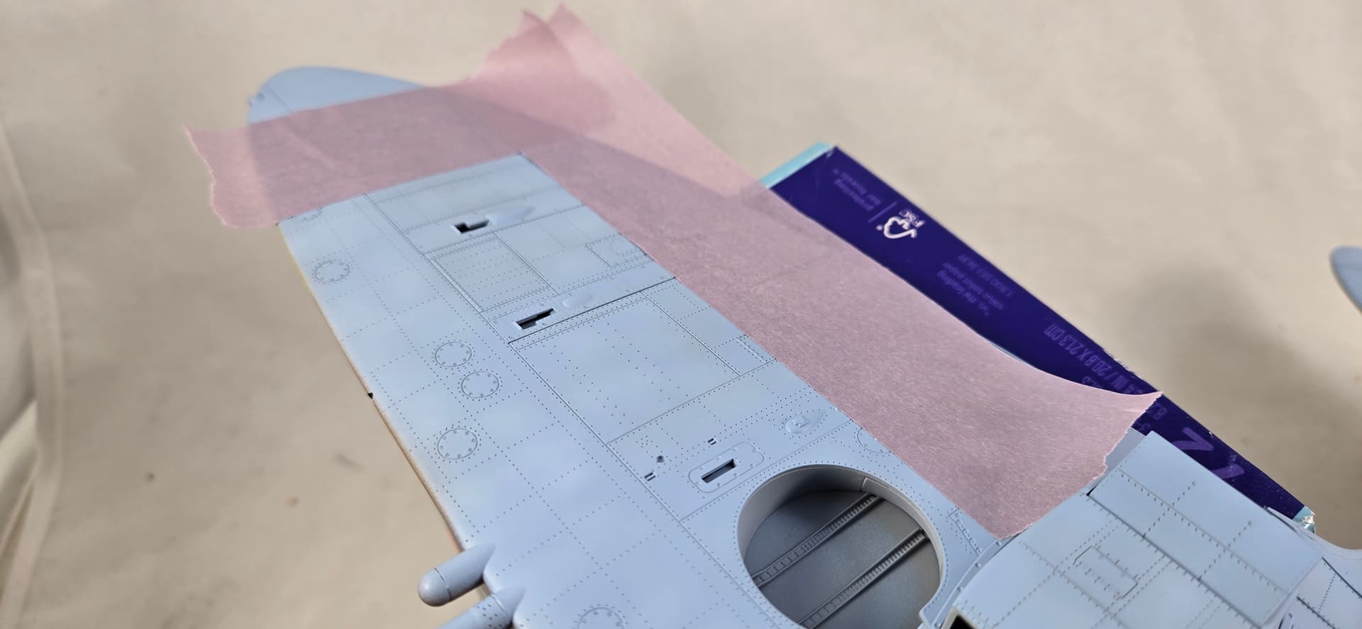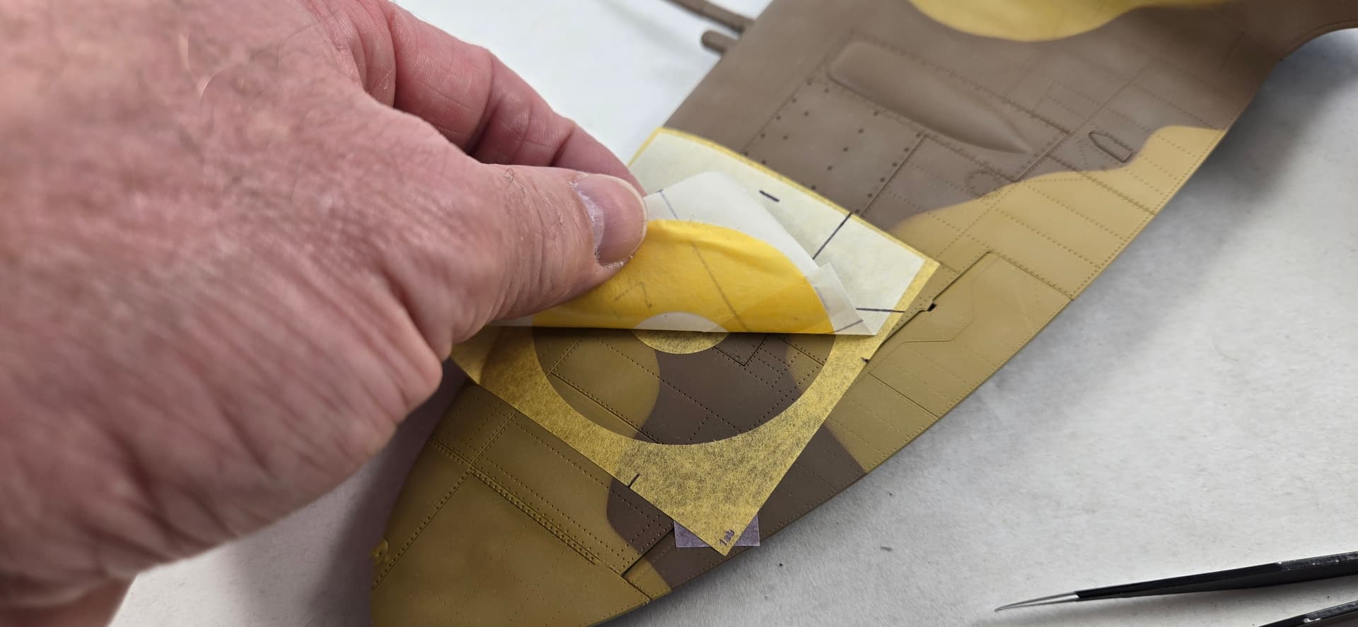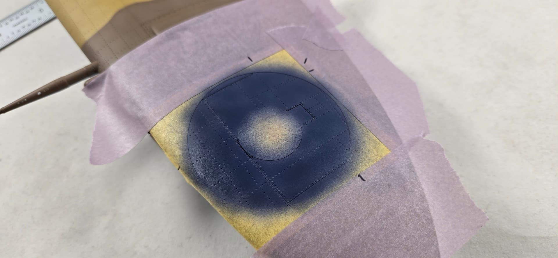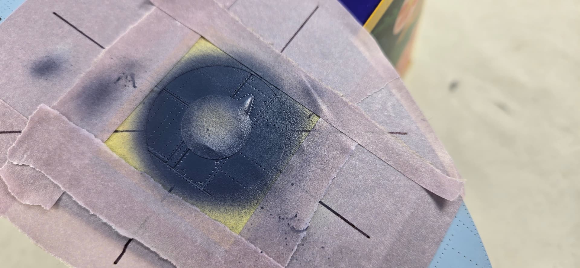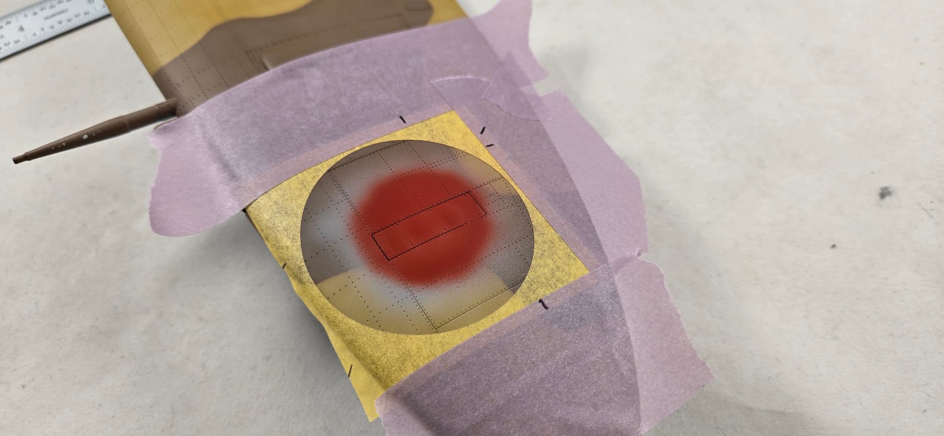 This same position was transferred to the other wing as well, and the corner of of the outer-most mask was placed in position aligned with the right angle tape pieces - the “blue ring mask”. This mask then stays in place for the entire painting process. I cheated and put alignment marks on just in case - don’t tell anyone