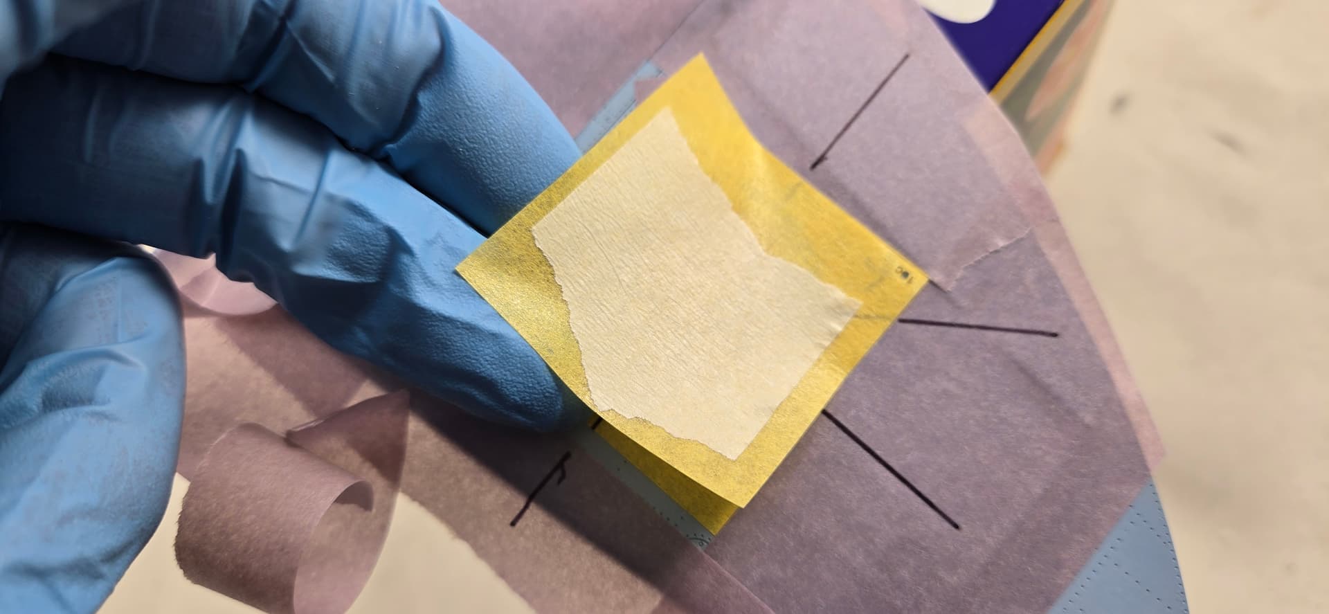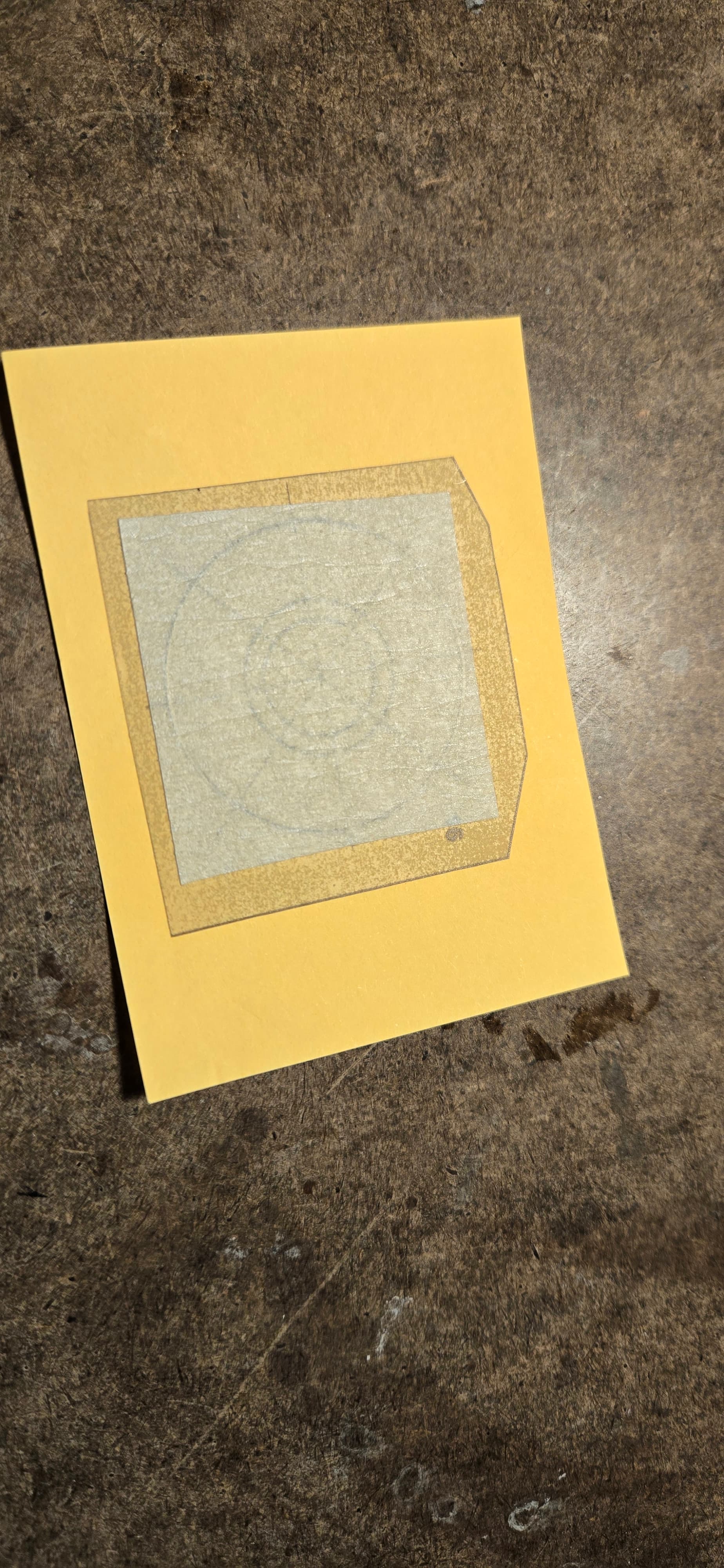 Pull off the “red ring mask” leaving the center dot and and re-tape all four exposed edges.