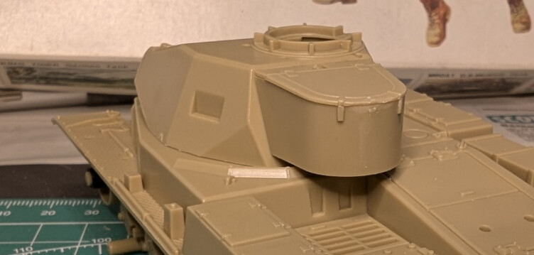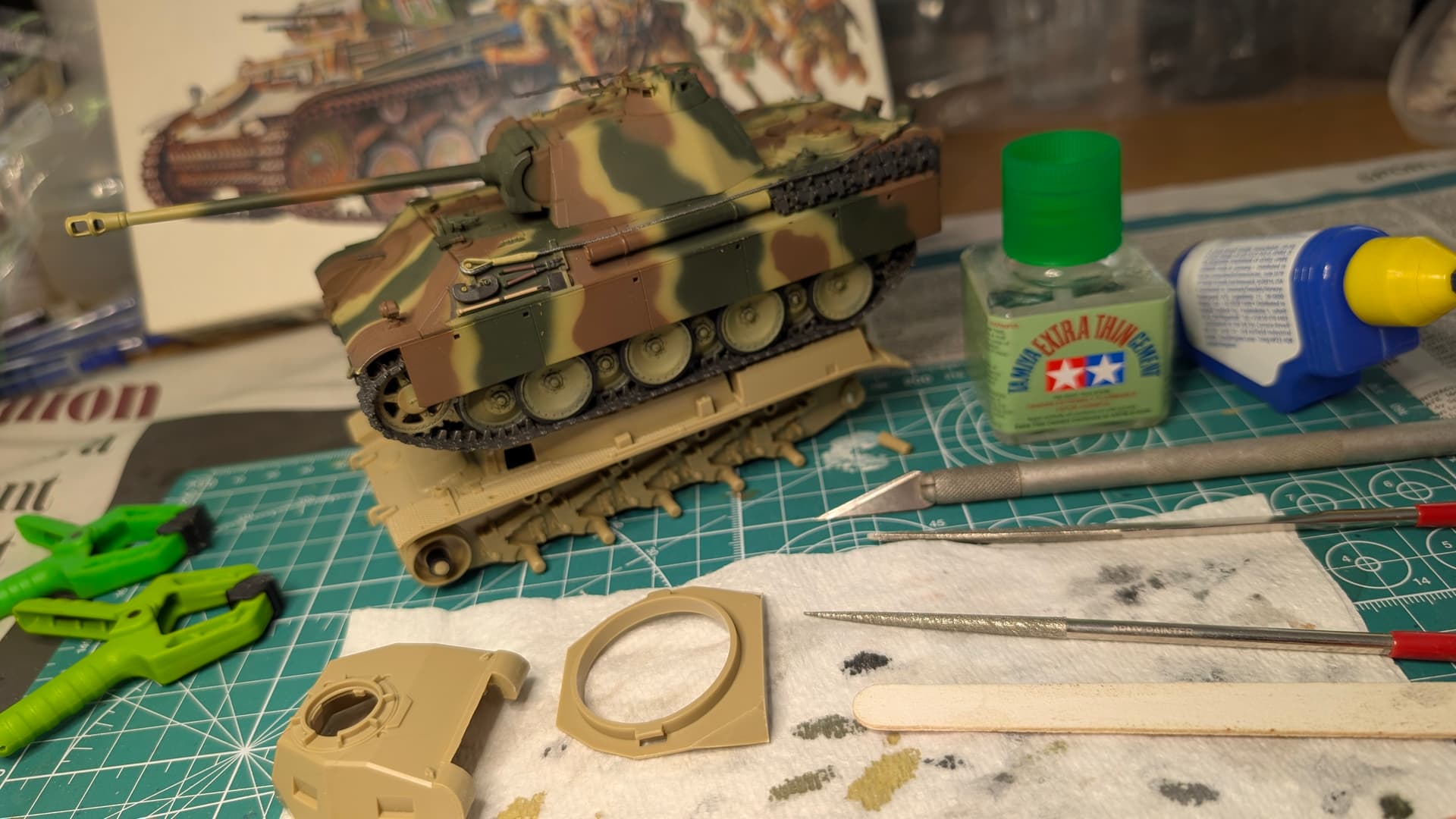 This is also a kit in a new scale for me, so I like to compare with what I’m used to. To assist in clamping the upper and lower hulls, I’ve employed the very 1:48 scale Panther whose decisions on weathering technique will ultimately be informed by this kit.