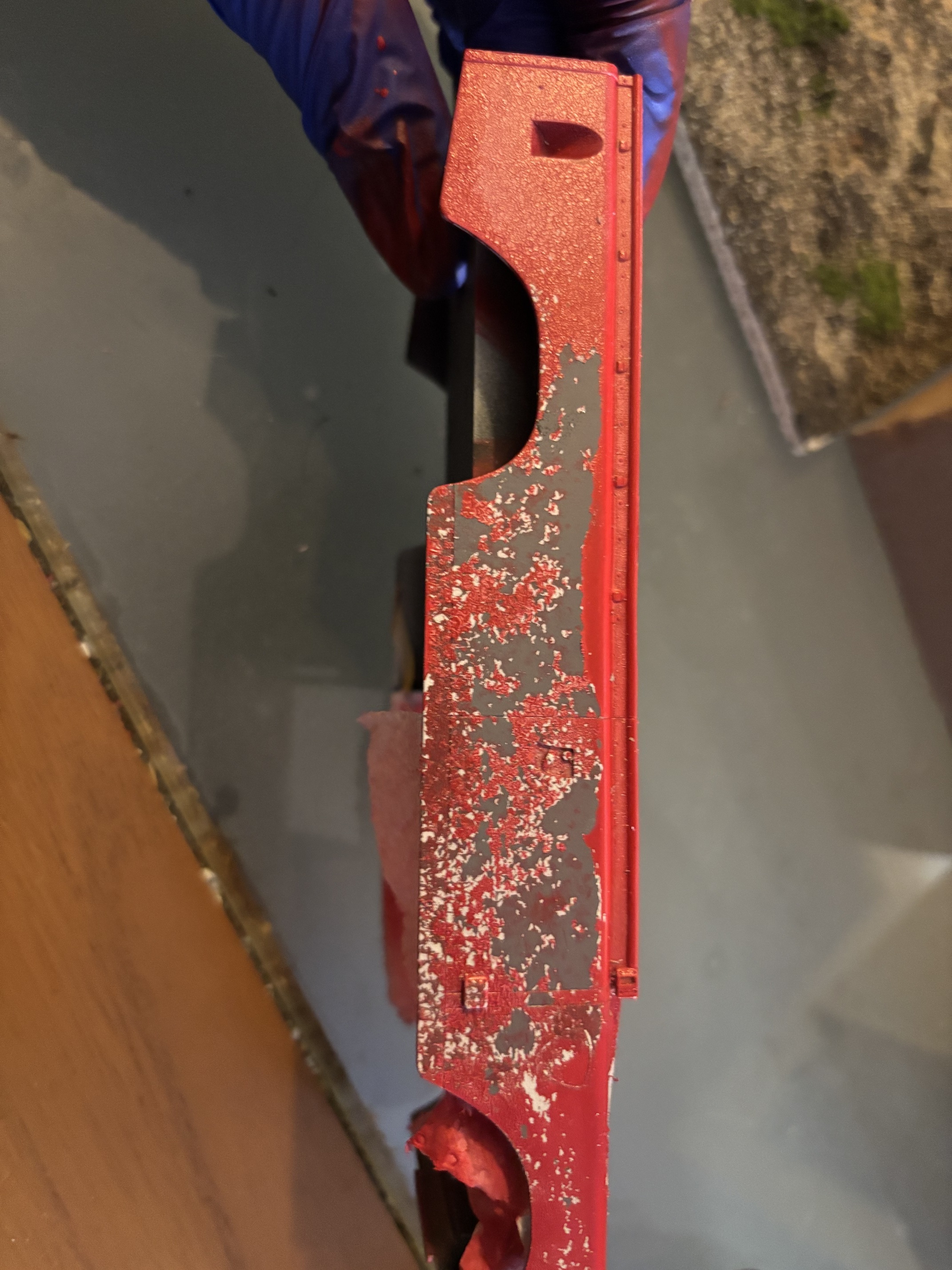 I have found when I sprayed the top layer of humbrol acrylic gloss red over my base coat of plastikote enamel gloss white the acrylic had stripped the base coat and I’m unsure why?