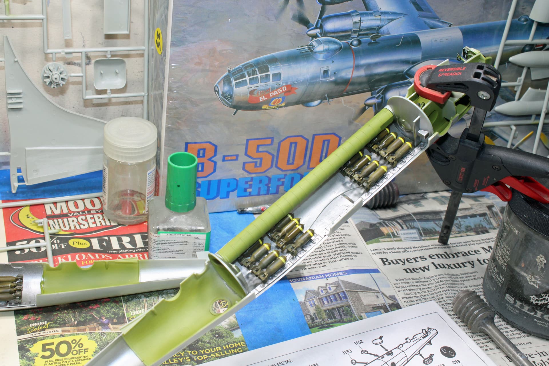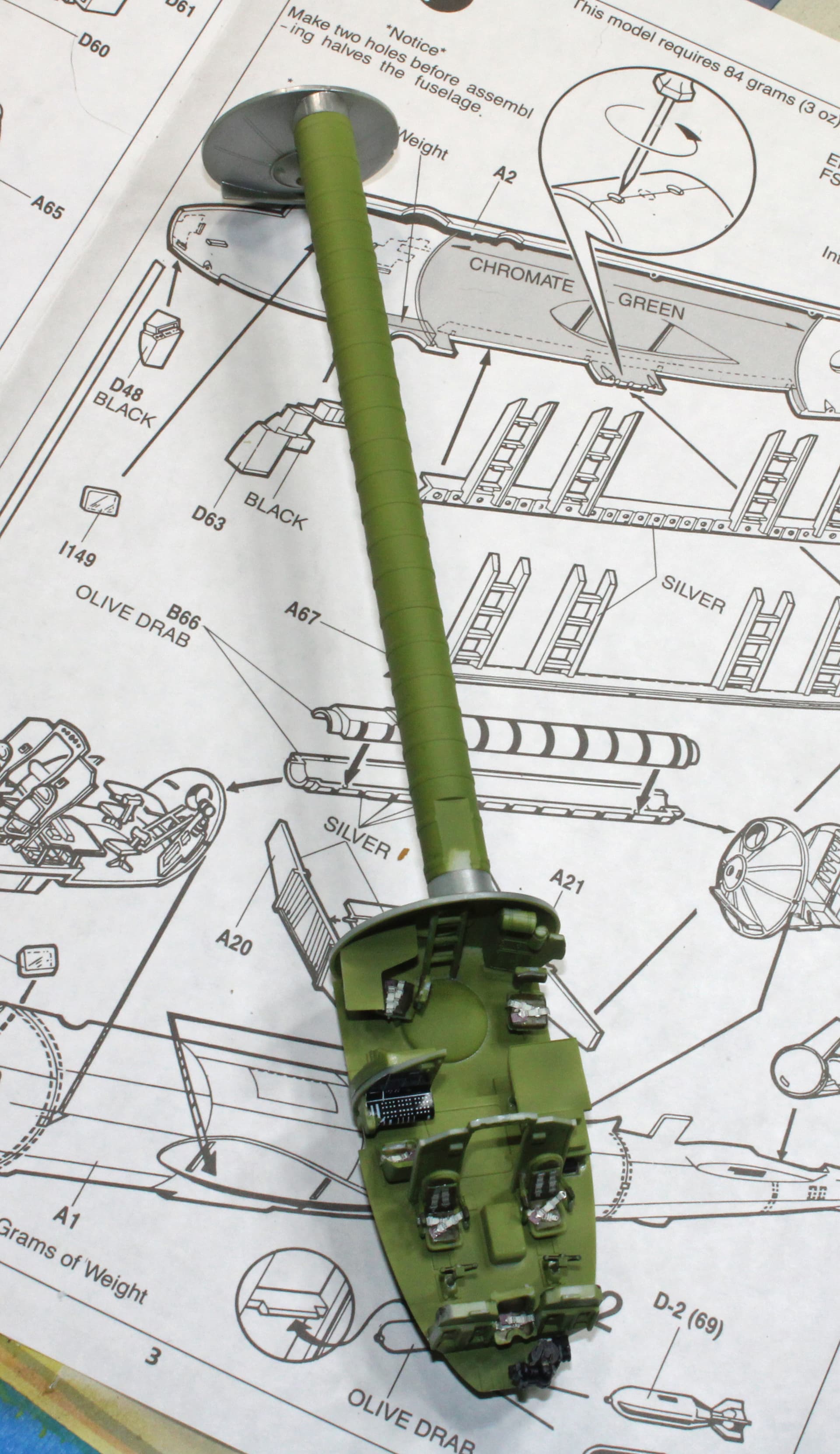 Being iced in today has given me ample time at the bench. I am beginning to see the B-50 come into proper shape here. My goal today was to determine where to put weight so that this big girl won’t be a tail sitter. The instructions call for 84g of weight with the suggestion to add that weight below the cockpit floor and above the location of the lower forward turret. That was not going to work for my available weight source (BBs). Plus, the fuselage is giving me fits just getting it together reasonably close along the seams.