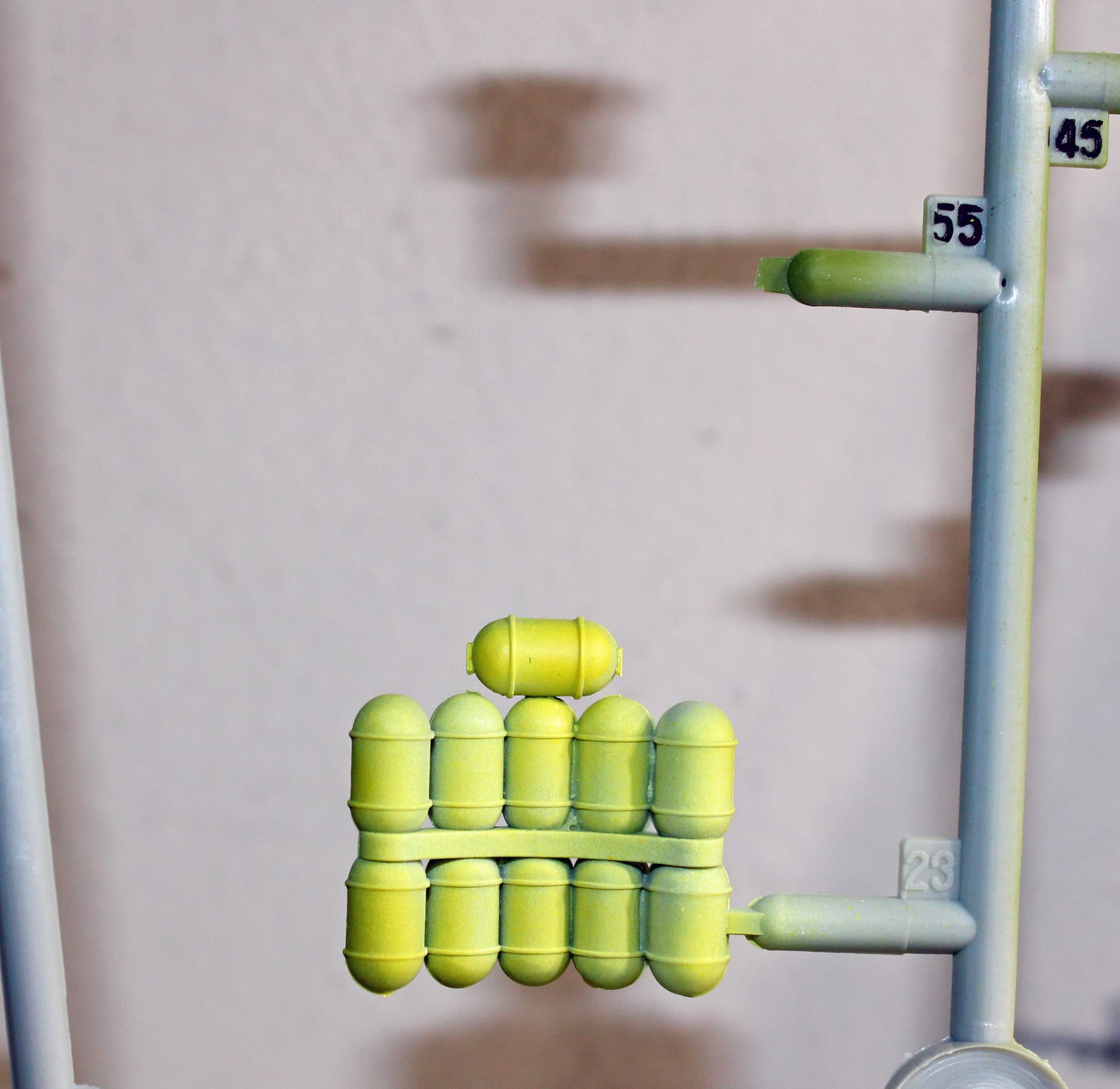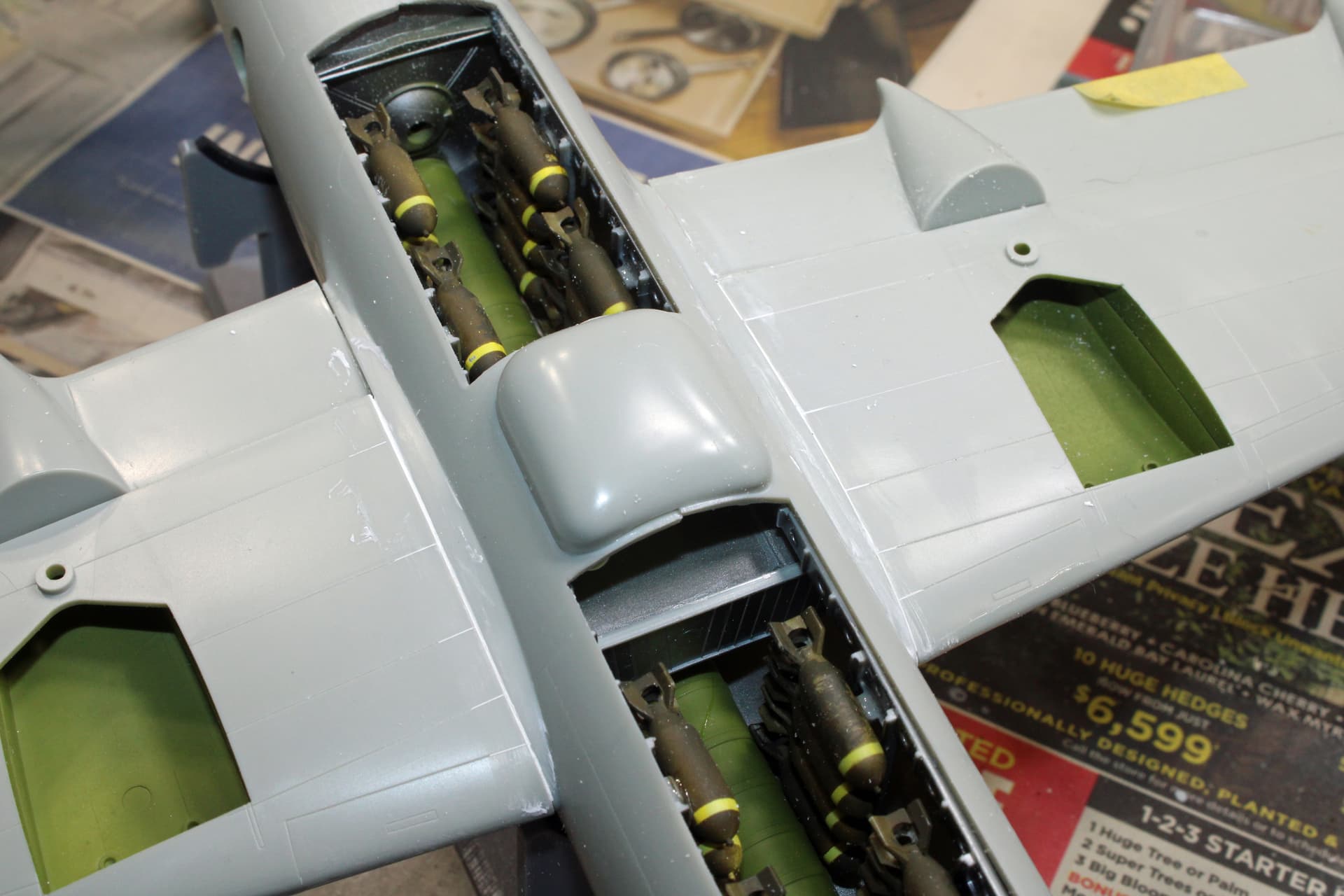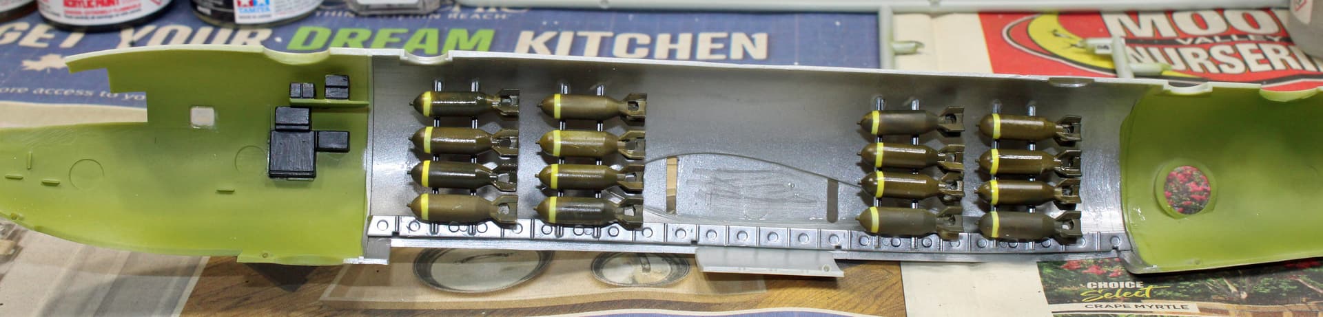 Been working from my office this week until today, so was not able to get any significant bench time until now. I had finished painting the bombs earlier this week, with an additional paint session to go back over them to touch-up areas that didn’t cover the yellow overspray sufficiently.