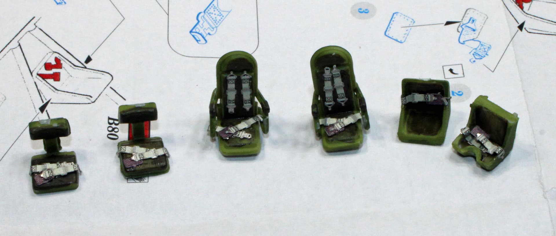 I used Gator Grip white glue to install the belts, so I set them aside to dry overnight. Tomorrow, or whenever I get back to the bench, I will need to finish folding down some of the belt connectors to the edges of the seats and then start building the cockpit.