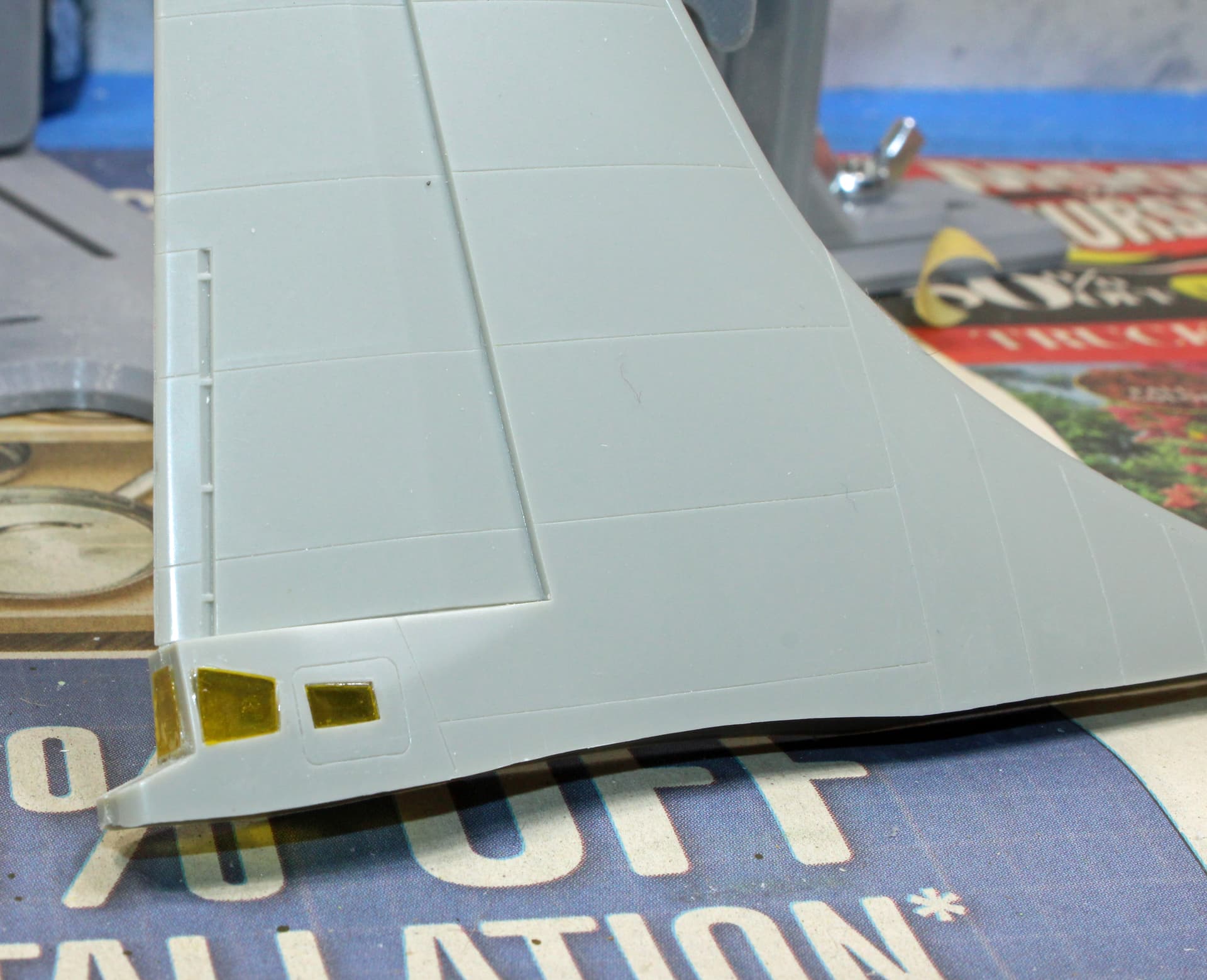 The big rudder and stabilizers were simple to install and get into proper alignment, although the photo of the rudder reveals a small gap I will need to fill with putty.