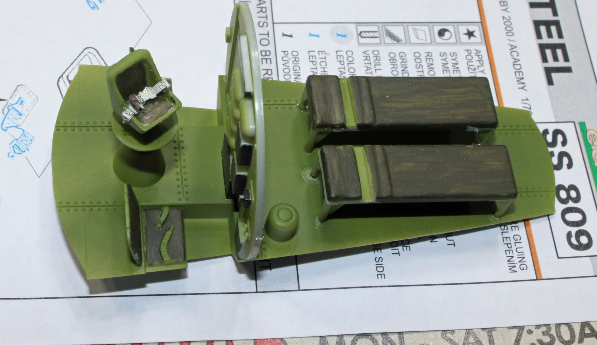 Seats are completed with the addition of the Eduard PE seatbelt set. The rear compartment is complete. I painted it just so there can be some color visible if one is to look through the observation blister, but otherwise I opted not to add PE belts to those seats as I doubt the effort would have been worth it. Other interior parts are painted interior green, with decals added for the IPs.
