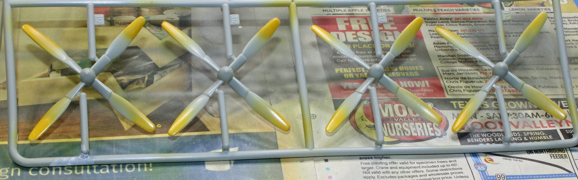 The paints were AK Interactive Xtreme Metal dark aluminum in the bomb bay, bomb bay components and inside of the bay doors, and the rear gunner’s compartment. AK Interactive Xtreme Metal jet exhaust for inside the cowlings and intakes. AK Interactive Xtreme Metal duraluminum for struts and actuators. AK Interactive Real Colors interior green for the engine bulkheads and the pressurized tunnel the crew could use to traverse the bomb bay. Tamiya lacquer flat yellow for the bombs and the tanks (not sure what those tanks contained, O2?) The bombs will later be masked for a yellow stripe and painted Tamiya acrylic olive drab. The prop tips got a coat of Mr. Hobby orange-yellow (which looks like straight orange in the bottle but sprays far closer to yellow).