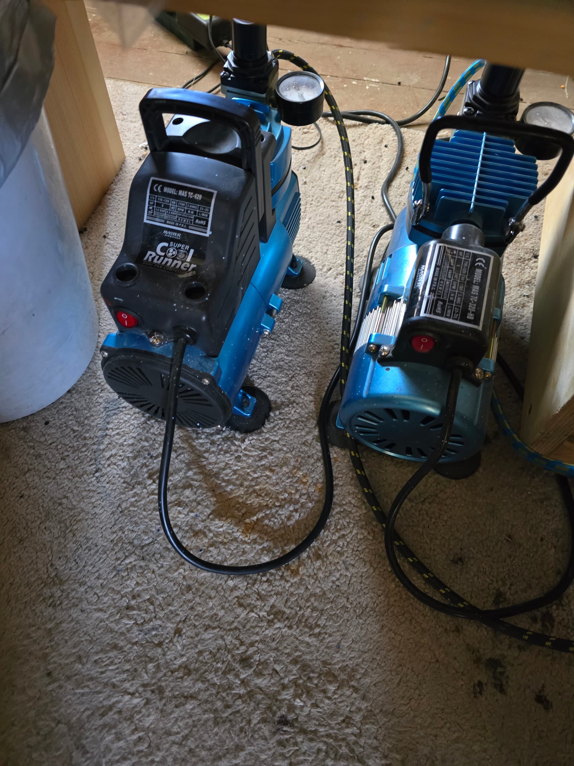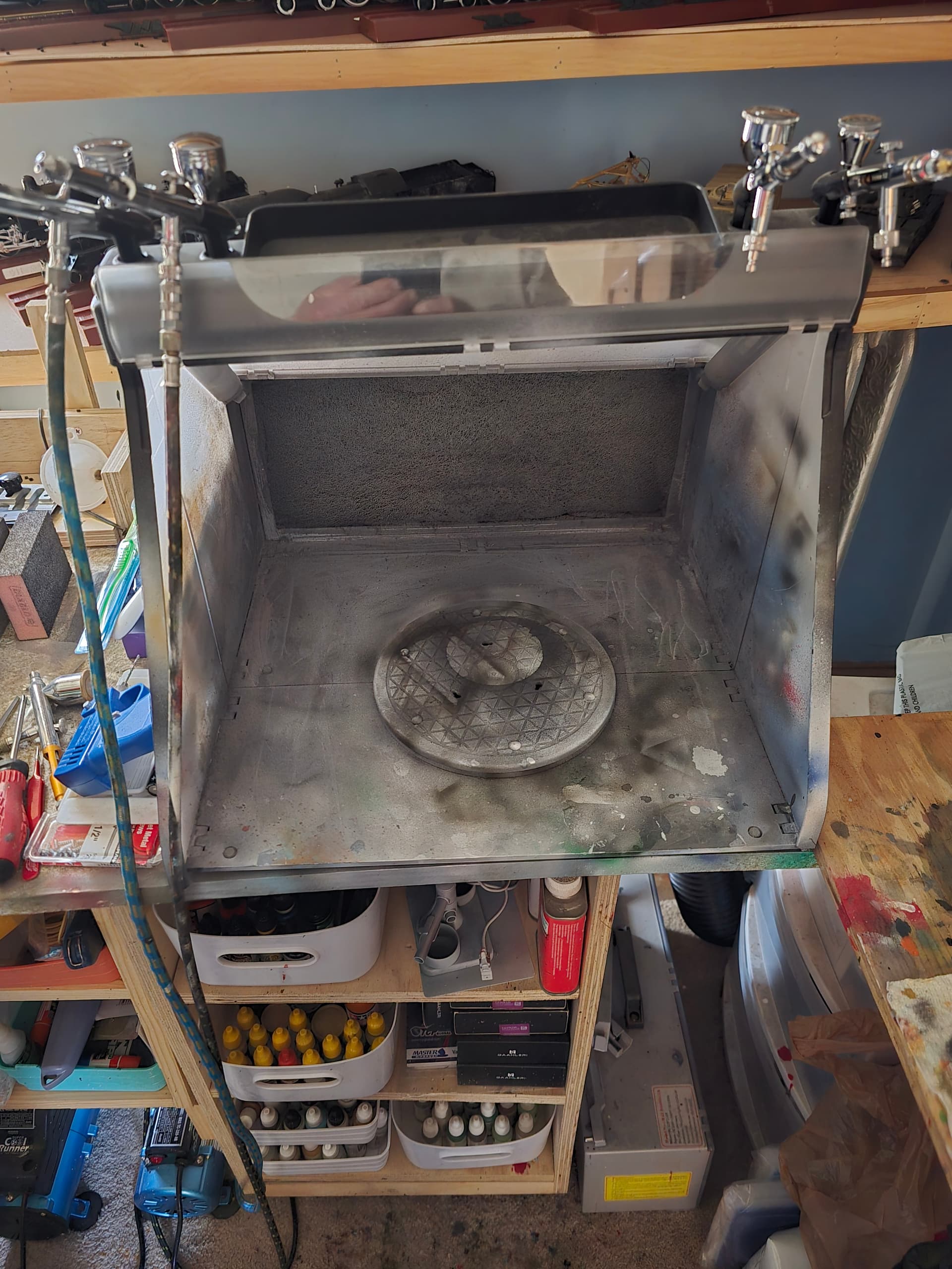 Just wondering how everyone cleans and maintains their airbrushes. Me personally i hae 4 Gaahleri airbrushes. The cleaner s i use are USA Art cleaner and restorer, Tamiya airbrush cleaner once in a while. I pull my needles every four uses, every ten uses they go in a ultrasonic cleaner with 90% Isopropyl Alcohol in it. When i do that it gets totally broken down, lubed up after its done. Here are my compressors, airbrushes, spray booth, cleaning area. The compressors are Masters brand.