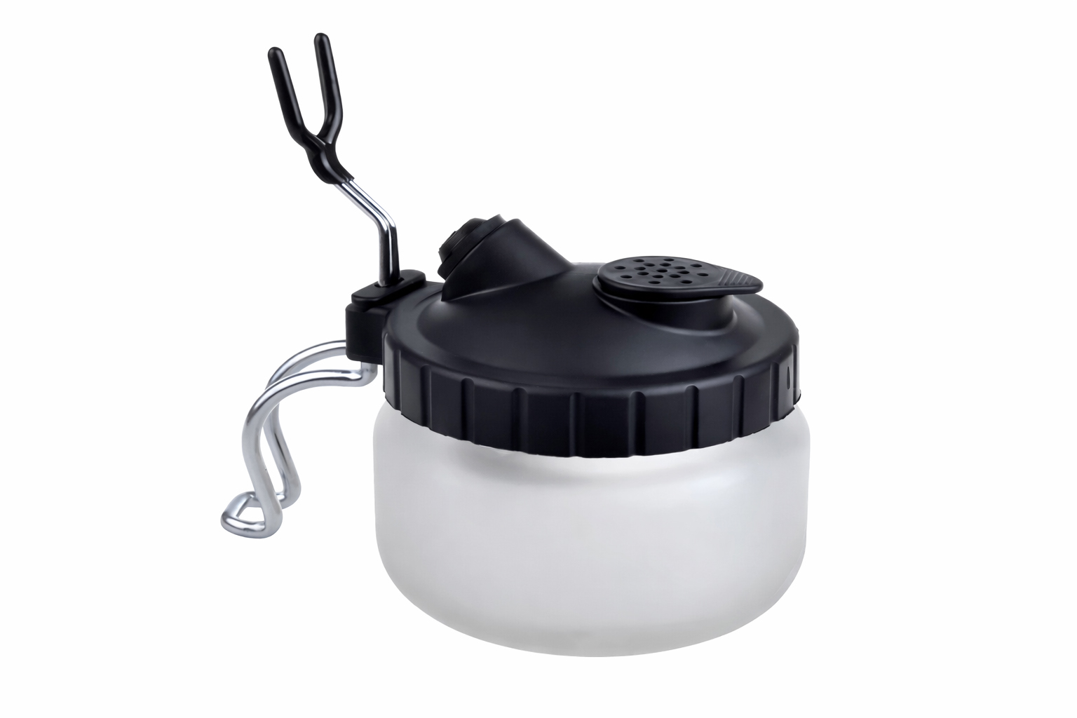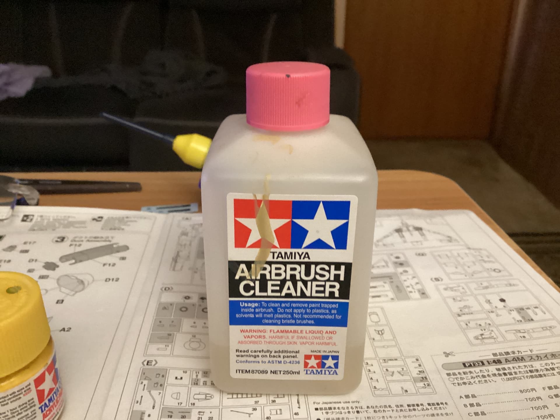 I spray mostly acrylics but sometimes use Tamiya’s lacquers. For acrylics, first I rinse out the cup with water from a squeeze bottle. This gets rid of most of the leftover paint. Then I’ll run a cup or two of water through it, followed by lacquer thinner. Every 3 or 4 uses I take everything apart for a thorough cleaning. For lacquers, I just use lacquer thinner for cleaning but will disassemble and give it a thorough going over.