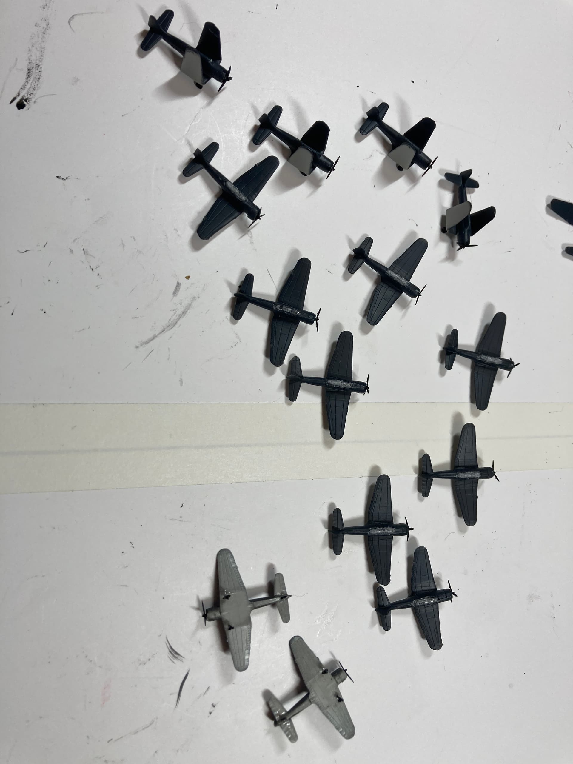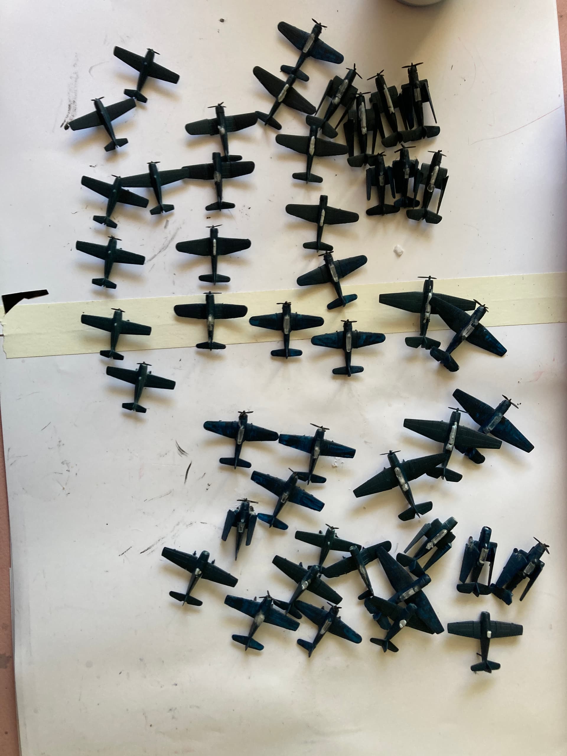 Put together a few more from various kits. Folded wings are a bit of a challenge; paint i think is latter WWII. In hindsight after painting, i could have added the insignia’s but they keep sticking to my fingers; lost a couple of propellers, and elevators, to who knows where. Landing gears keep breaking off. I’ll need to come up with a better plan.