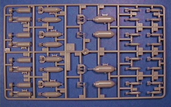 Must a) respecfully disagree with DaveB.inVa. and b)apologize for offering to give away something turns out I did not have. The weapons on the far left of Dave’s photo are air-dropped sea mines. Tail would contain a parachute. I looked at the identifcal sprue that comes with the B-25G kit and those mines are for the Shark-mouthed anti-sub plane featured on the box top. Keep in mind, incendiary bombs tended to be quite light, and the most common ones were in triangular bundles that came apart shortly after leaving the bomb shackles. Film of planes make inceniary strikes look as though the a/c are spreading giant road flares all over kingdom come. But again, I should have looked and done my research before offering non-existent incendiaries.
