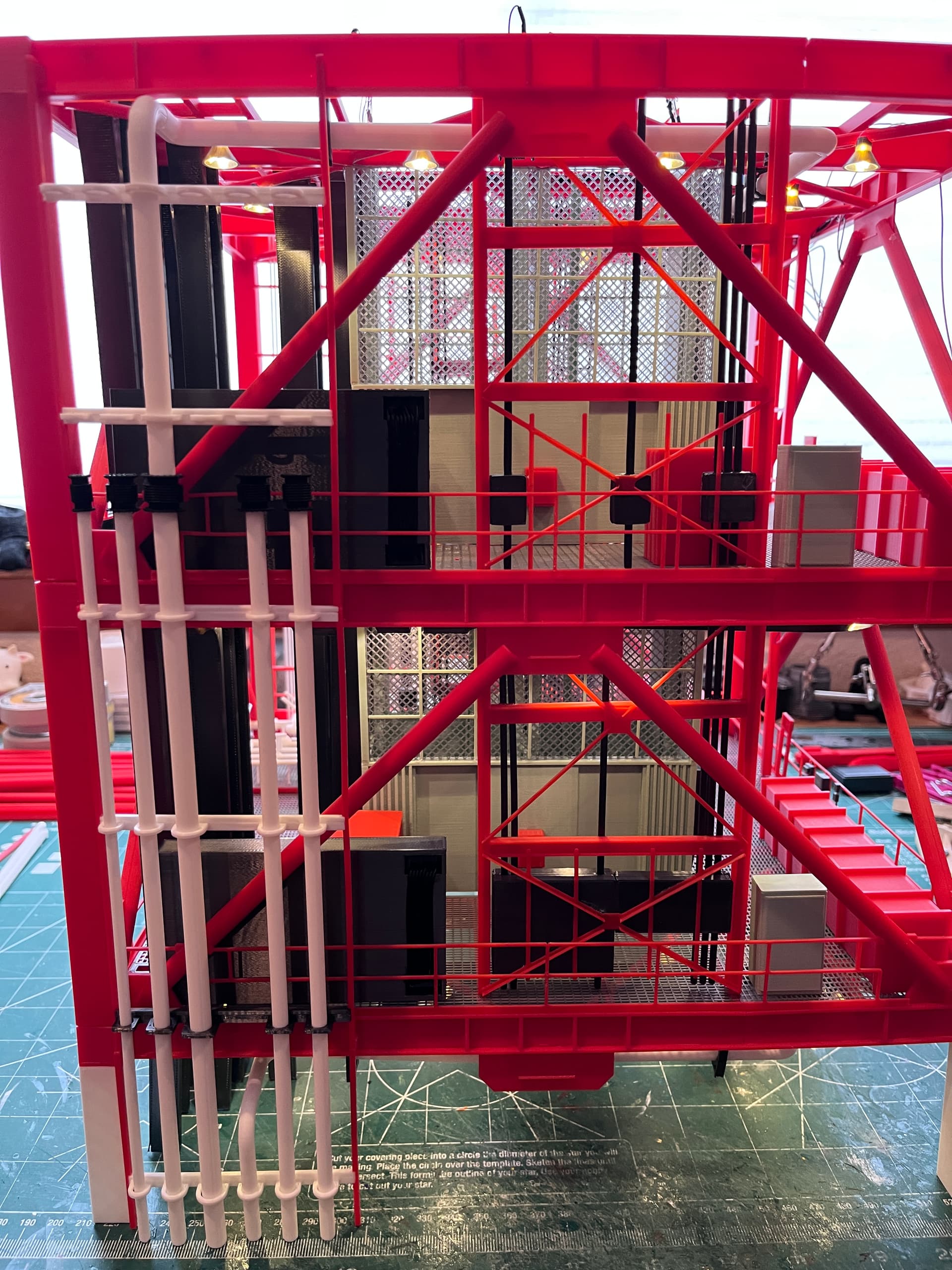 And here it is on the base board with the Saturn V section. Next up are all the pipes and platforms on the outside of the tower. You can see the wires that will go out the swing arms for those lights.