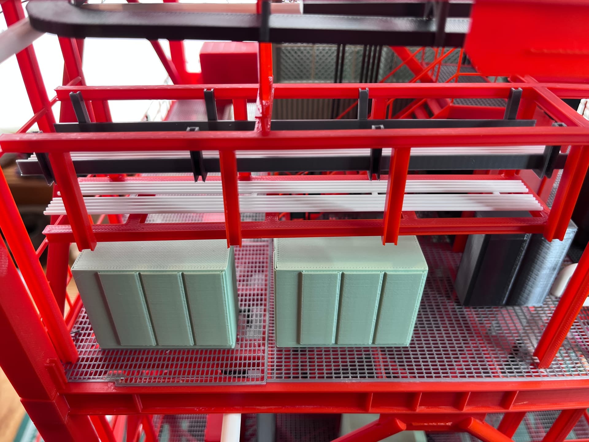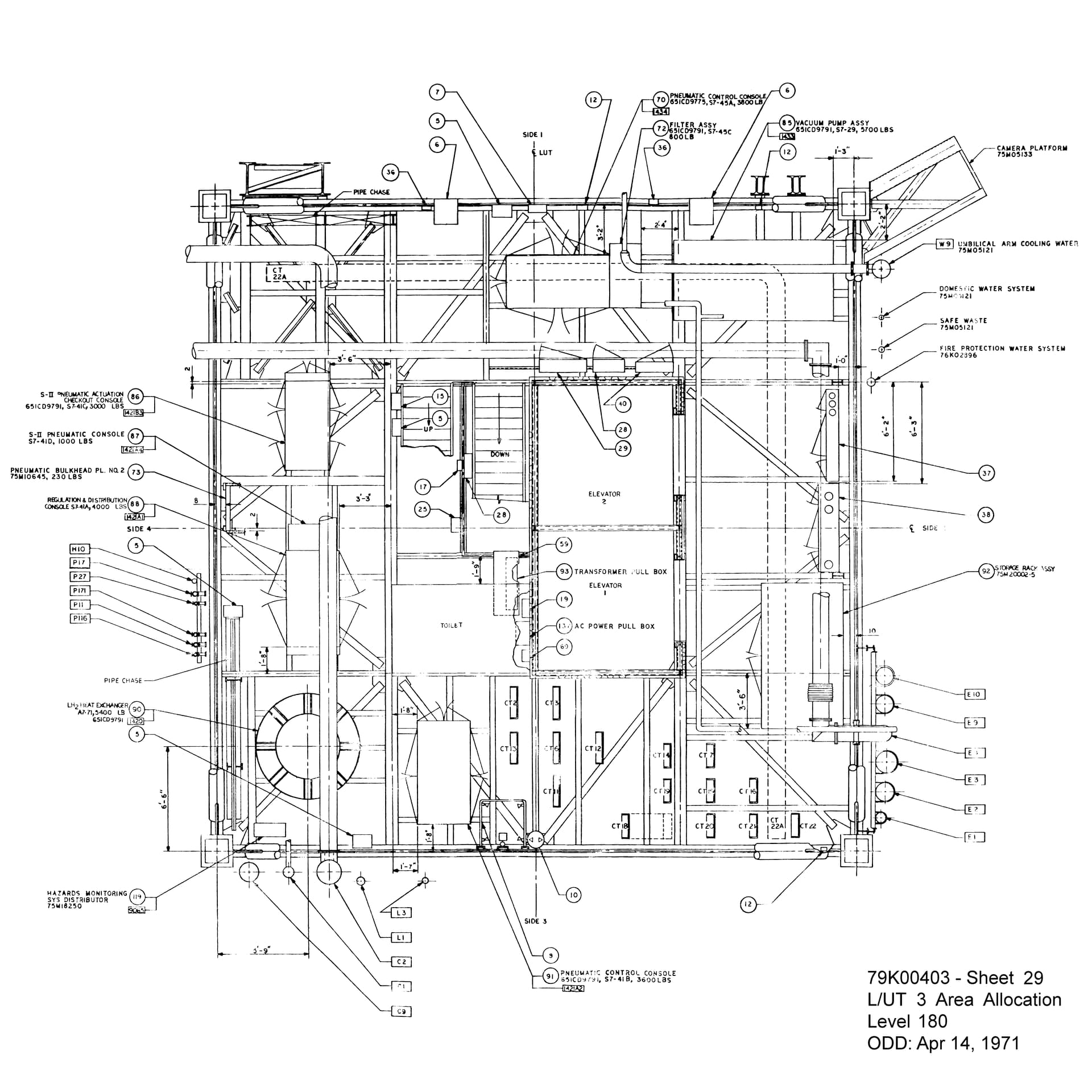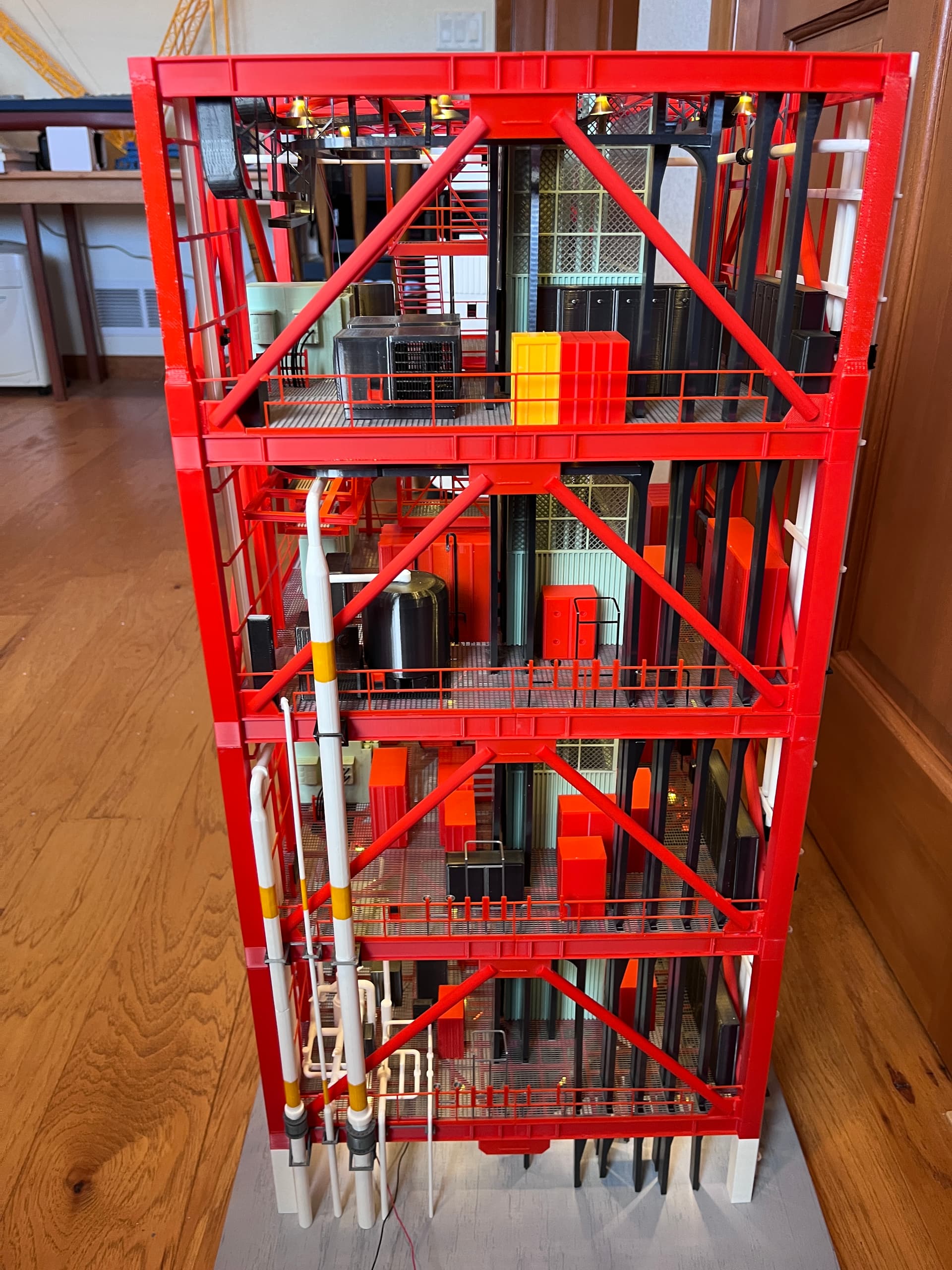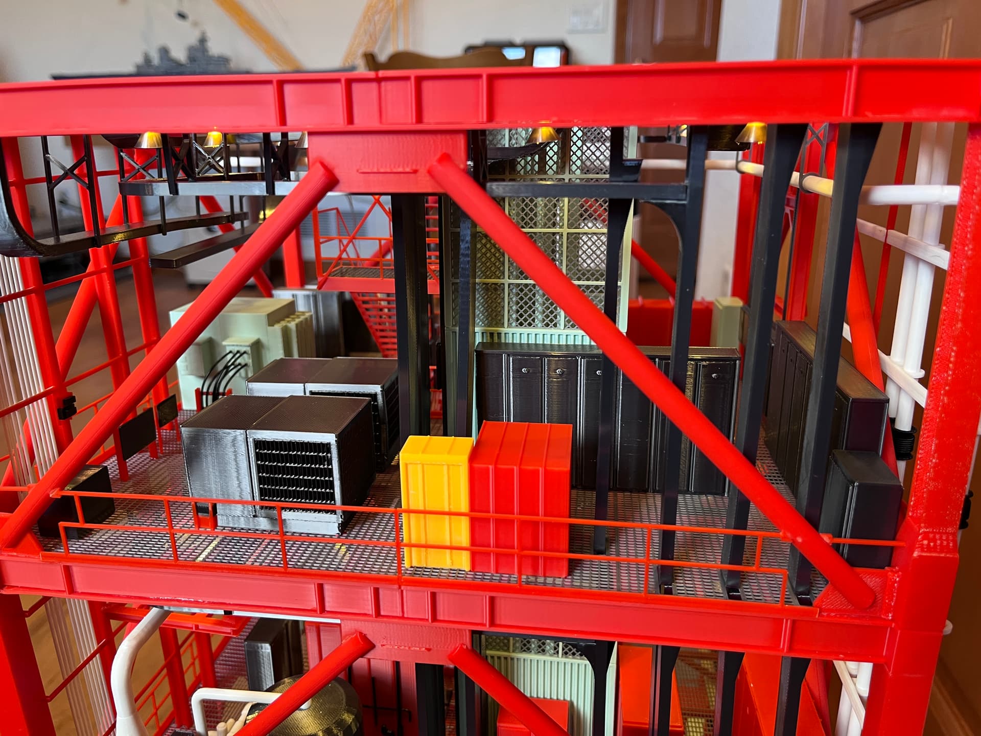 Back to the model at hand… I have most of the inner equipment for level 220-240 installed. There is also an inner rack going up the right side of Side 4. There will eventually be some outer hydraulic pipes that also attach to these racks. One of the pipes feed the large green boxes which are hydraulic devices that drive the swing arm retract mechanisms which are the long boxes on side 1. Some of those parts are the same as the next level down since both these levels have swing arms. The valves for both swing arms are the next level down. This level has a whole lot of cabinets.