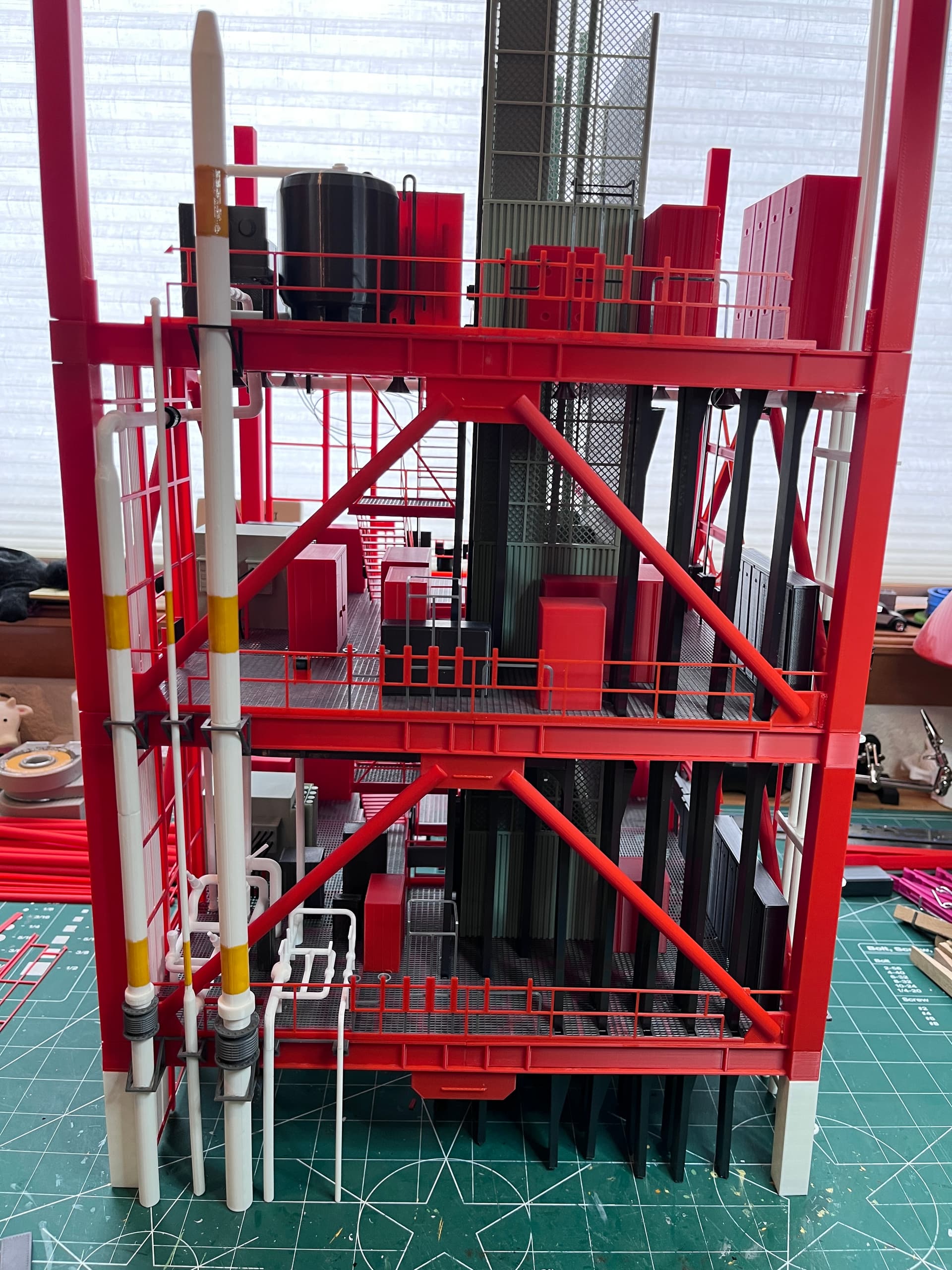 Here is side 4 with the various pipes. One is hydraulic fluid, the large one on the left that has pipes going to the big green boxes that help retract the swing arms. The other pipes are non-cryogenic gases such as helium, nitrogen and other gases used to fuel the rocket. This side still needs the swing arm walkways that wrap around to side 1.