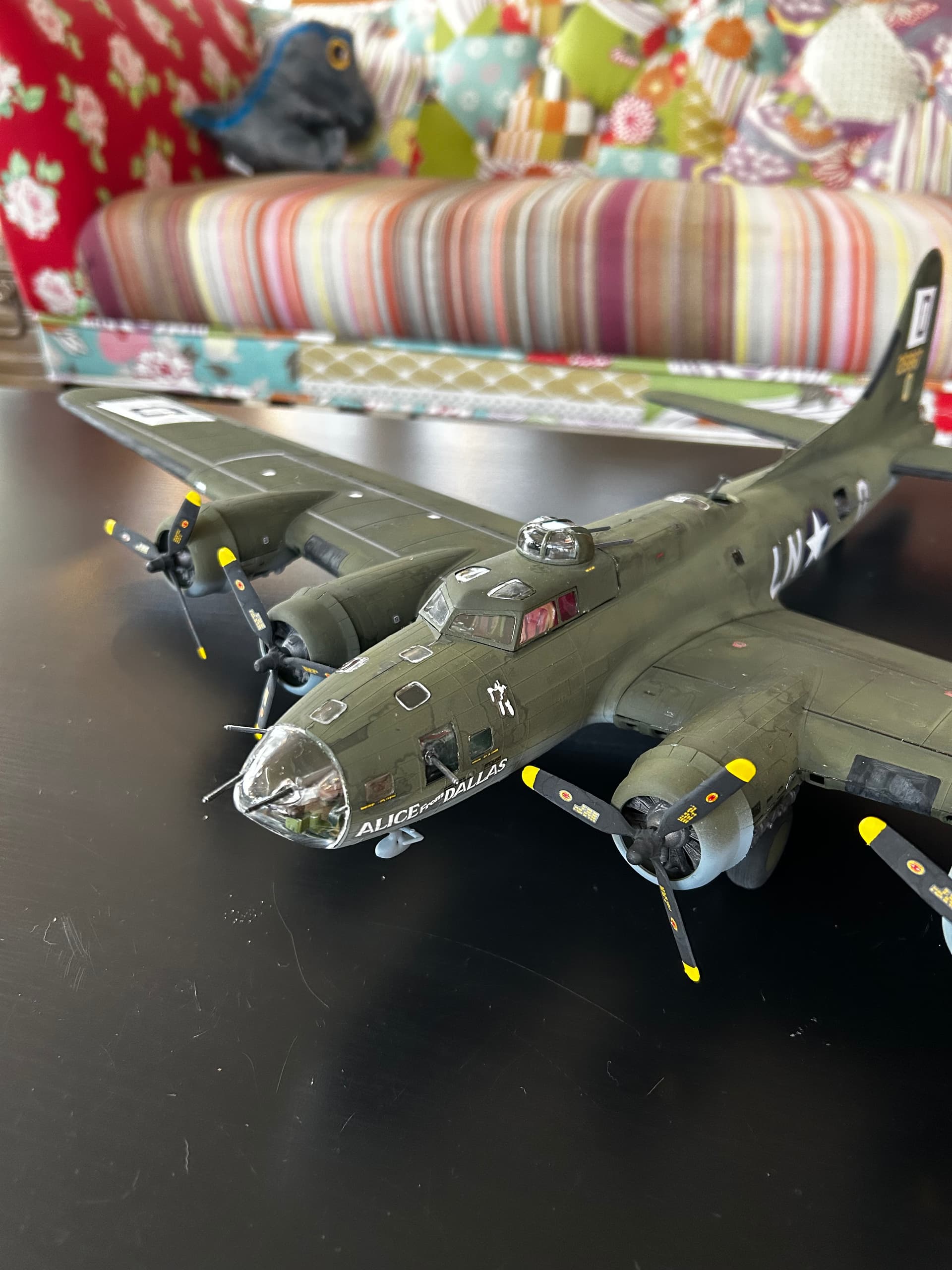 I wound up buying 2 B-17F kits from a local hobby shop; an open box Revel Memphis Belle, and the limited edition Eduard Bloody Hundredth kit. It took me almost 10 months of slowly building to finally be done with the Belle, done up as “Alice From Dallas” using decals from the Eduard kit.