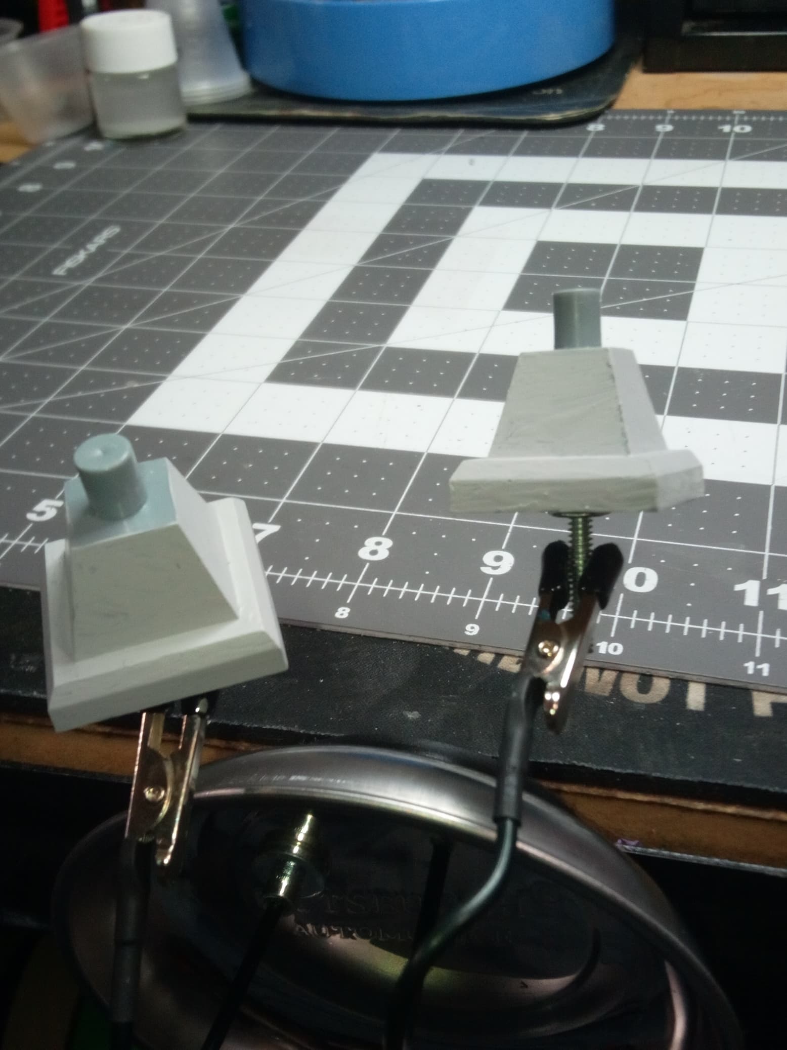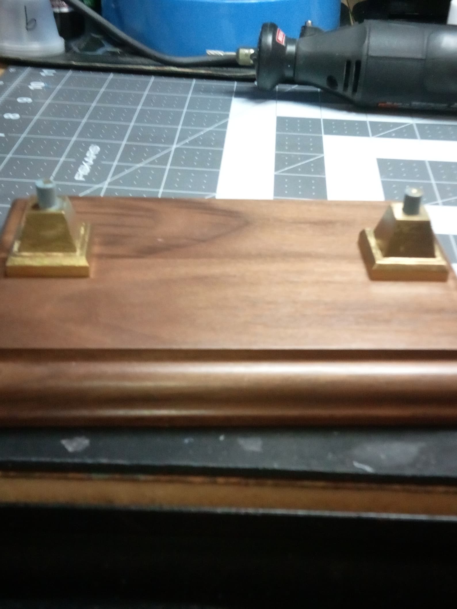 I sourced a walnut base from a trophy shop and had to figure out how to attach the pedestals to the wood without messy glue. The ships hull has two holes in the keel which the pedestals fit into. I have to use them, so I fashioned some internal “floors” out of a paint stir stick, affixed the hardware with Gorilla glue, drilled and countersunk the walnut, and voila, a functional base.
