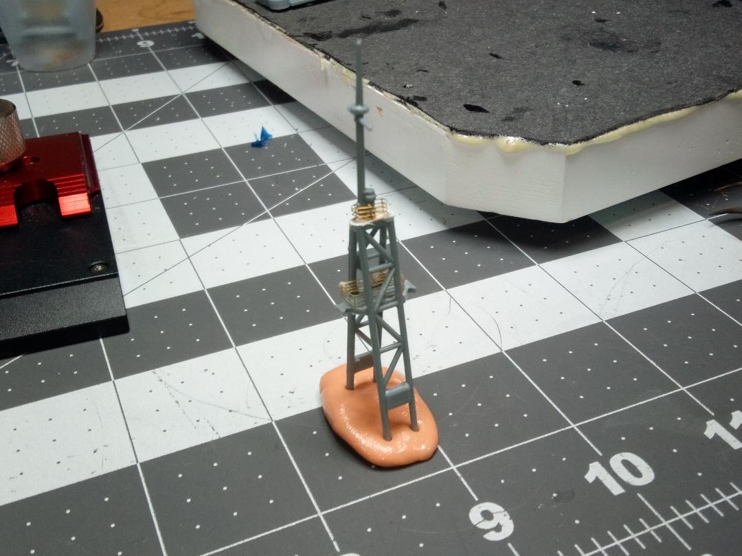 Oh well. Nothing really sexy in the build to report on. I basically spent the afternoon bending photo etch, puttying, sanding, and applying primer to a few pieces. I did end up assembling the crane hoist towers, as there was no way the PE railings would fit into them unless it was all assembled at once. These things are a pain. They’re angled, and since I cut off the molded-in railings, there are no tabs or pins to hold them together. Thank God for Insta-set CA glue accelerator. So the mid level PE is installed, the uppermost PE around the mast is merely mocked up. The radars will be replaced with PE. Adjustments had to be made to the bottom of the masts so they would fit the towers. I’m finding out that every piece of this kit needs hand fitting. I would have been better off scratch building it!