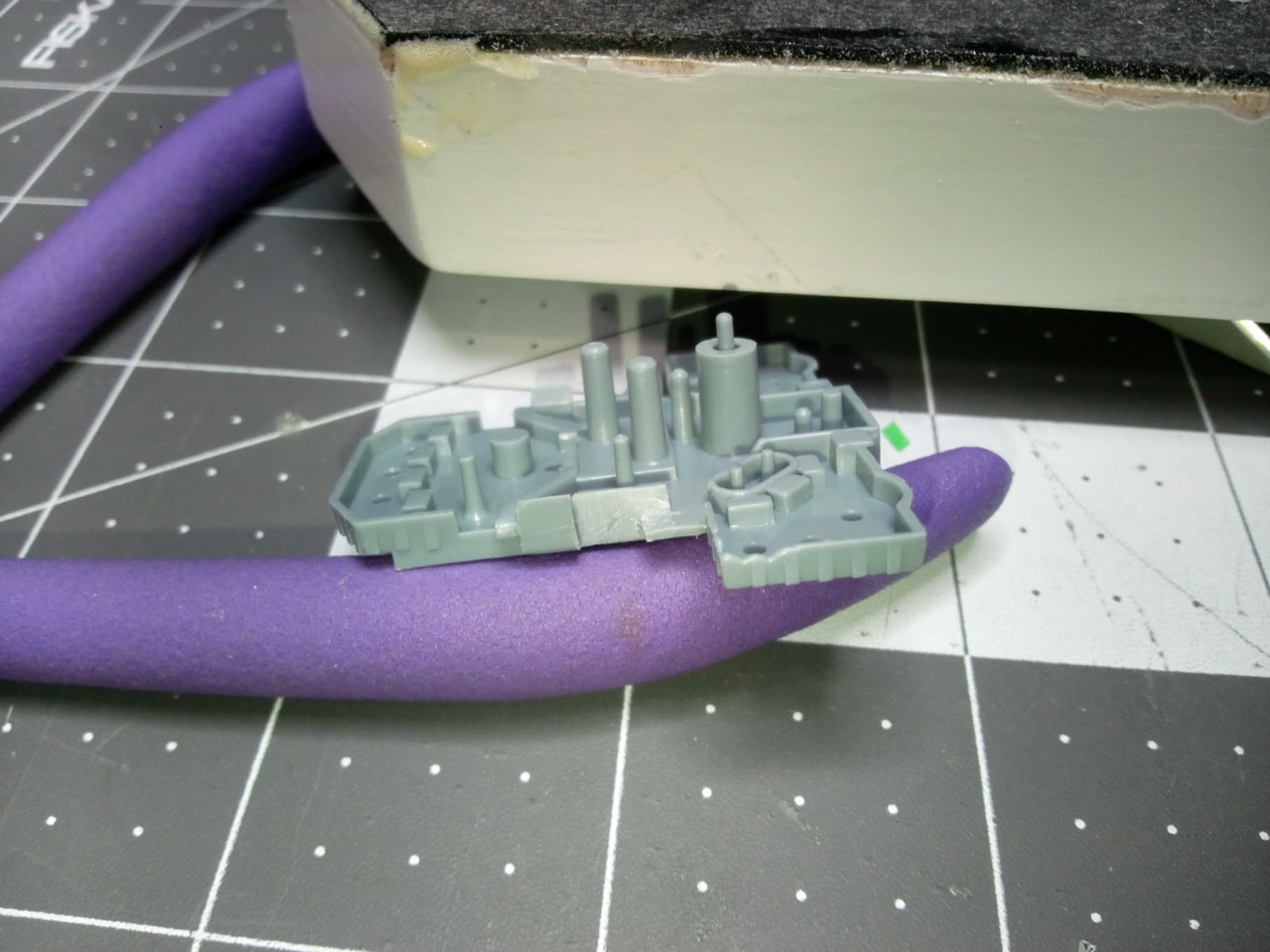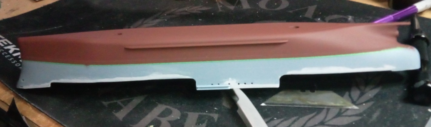 The green you seen is the masking tape protecting the boot line. I’ll be shooting the Haze Gray in a couple of days. I’ve had to mix a custom Haze Gray to match the background of my custom decals, since as you know, white doesn’t print. See chapter 1.