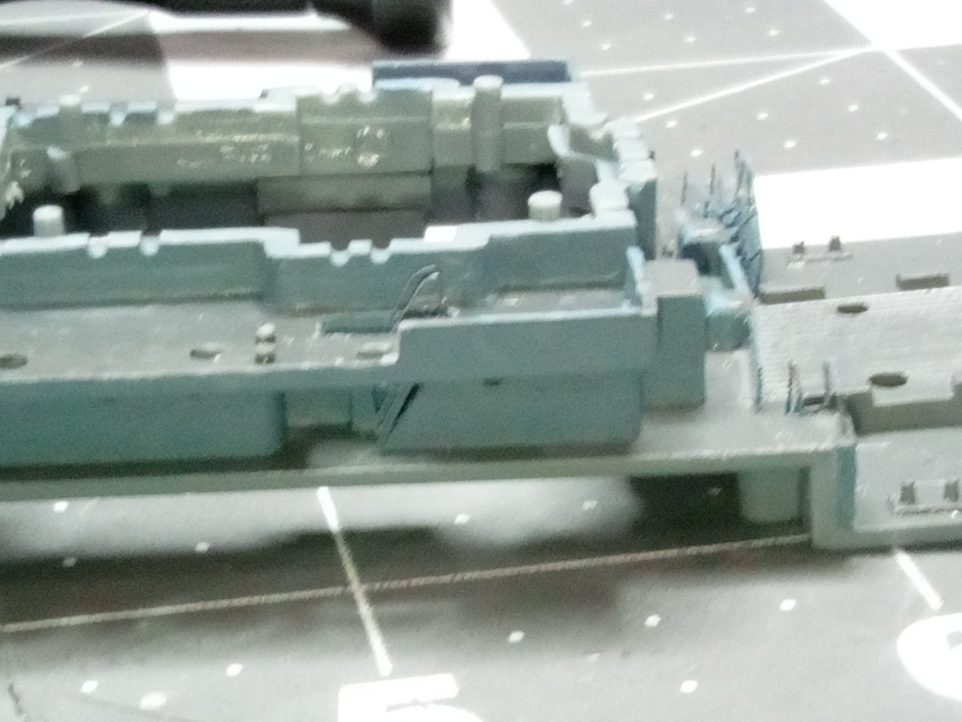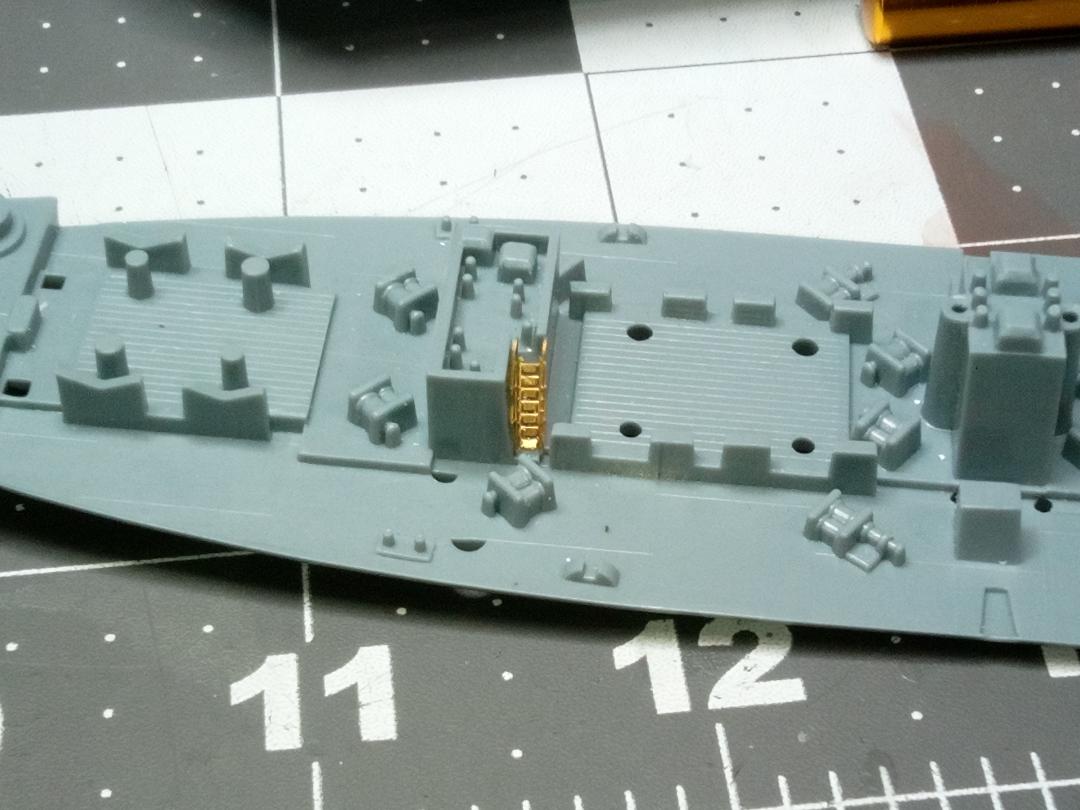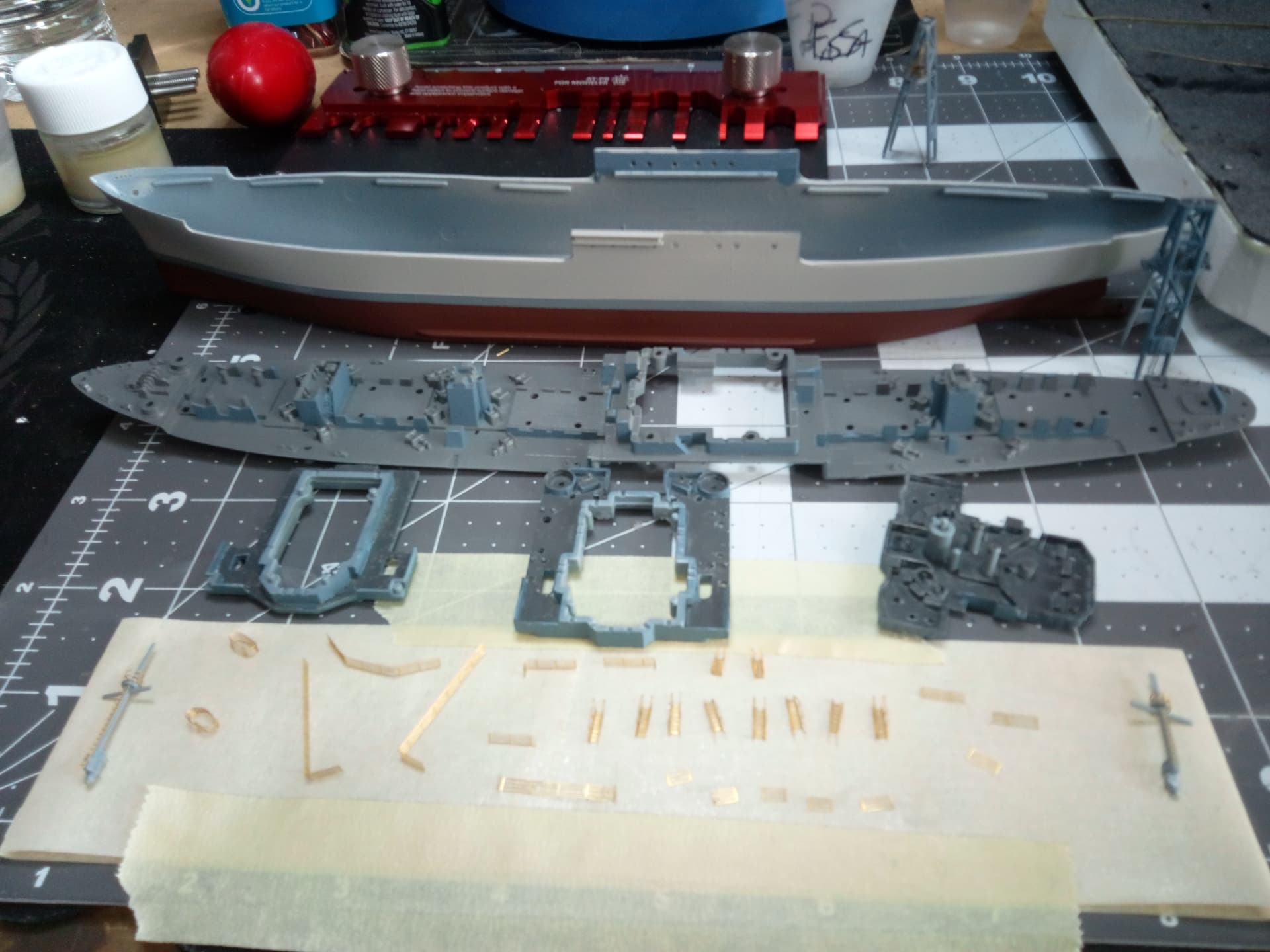 Got some haze gray on the hull (custom mix of Tamiya flat white, Tamiya med gray, and Mission Models haze gray), with just the boot stripe remaining. Painted the main deck with Squadron deck gray, and the vertical structures in AK ocean gray. Same two colors on the superstructure components. Then applied ocean gray to all the little pe parts and masts in the picture.