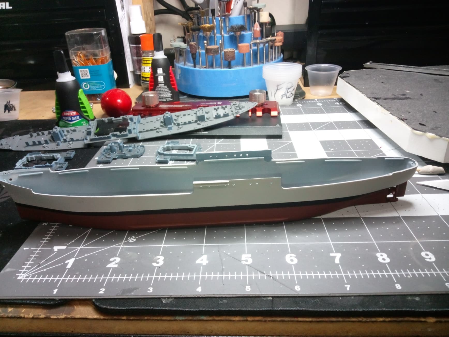 Chapter 4. Wow! Got a full day in on the build, but most of that time was spent removing a multitude of Stairs and railings from the superstructure decks. My hands are all cramped up from this “micro surgery”. The time spent is going to make a world of difference in the appearance of this vintage model. Starting the day, I shot some AK Hull Red on the bottom of the ship. The Hull Red was very dark from the bottle, so I added some of AK Insignia White and water to tone it down and thin it for the airbrush. It looks good to me.