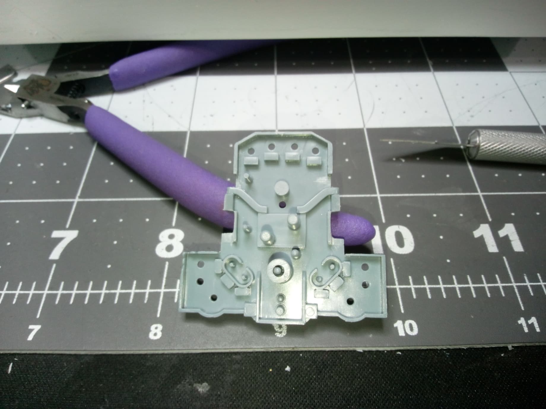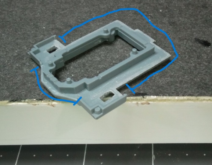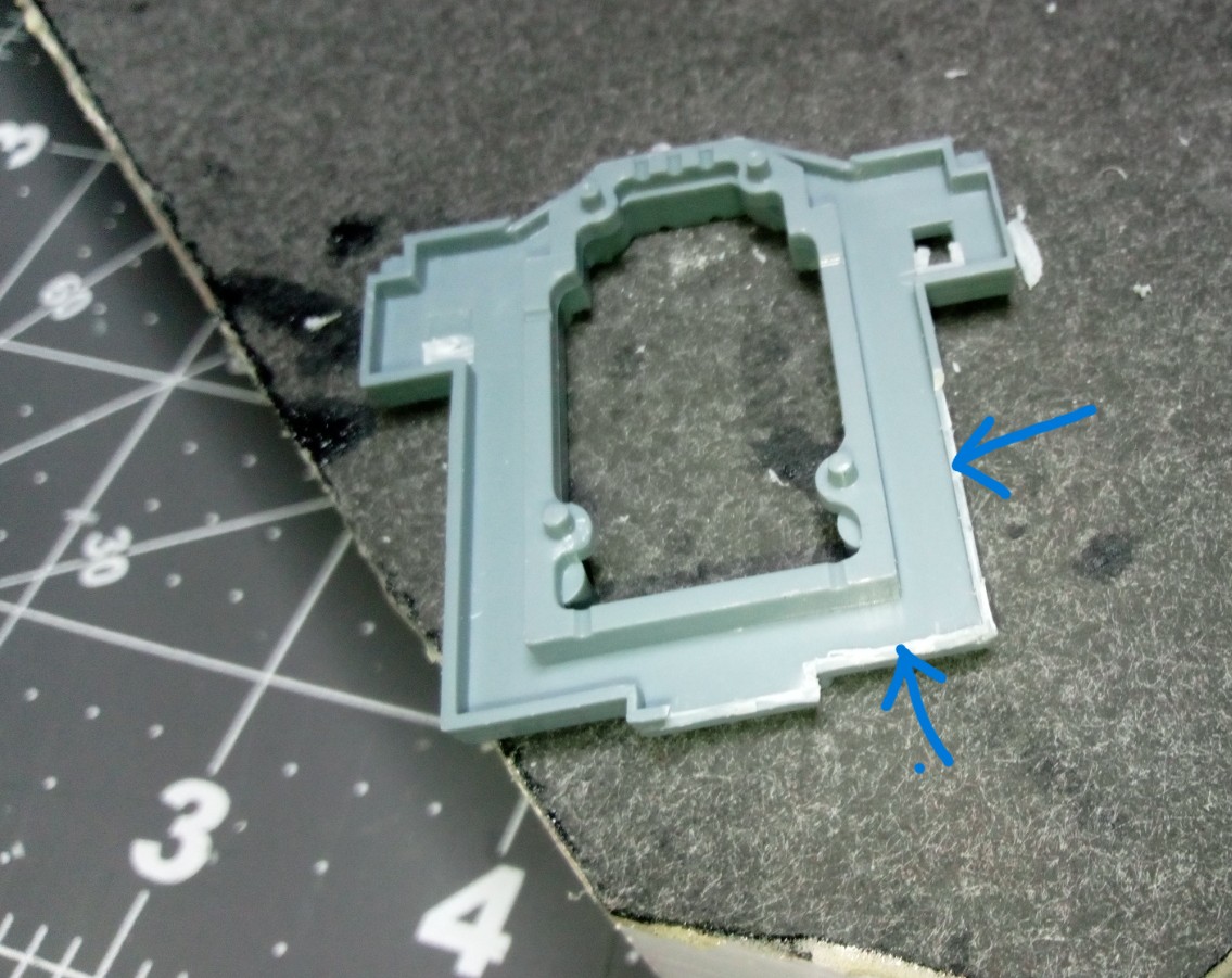 Not a lot of time at the bench lately. I’m waiting on some supplies to arrive and of course life has intruded again. While contemplating the build and the things I need to do in the future, I discovered more molded-in railings. I thought I had cut them all out, but I found them on the decks of the crane hoist towers. A very delicate spot, as they are part of the decks and hidden glue joints. Putting my fear aside, I went ahead and attacked them with some new tools acquired just yesterday. I’ll tell you about those in a minute. Here are the crane hoist towers, original on right, and railings cutaway on left: