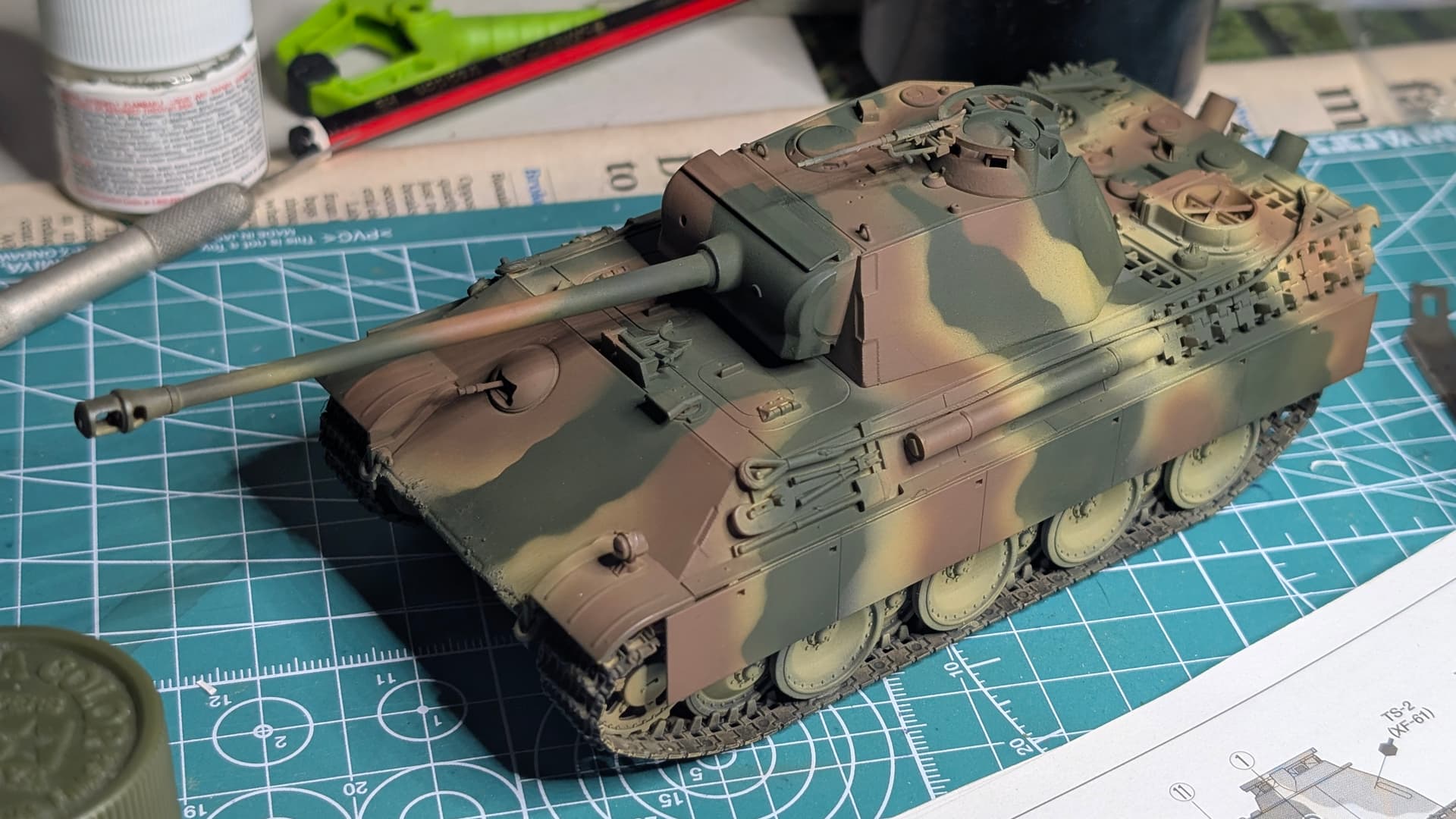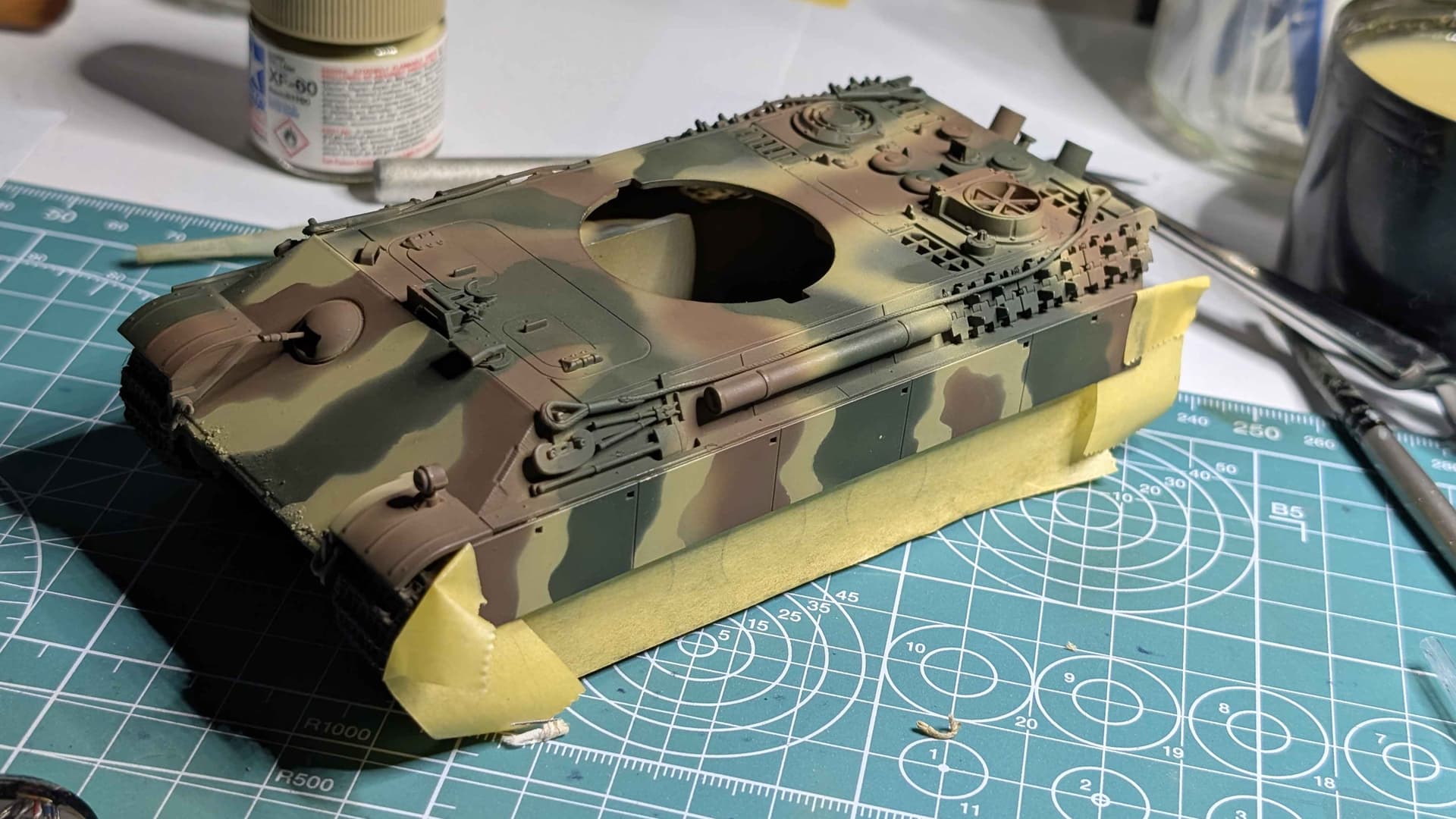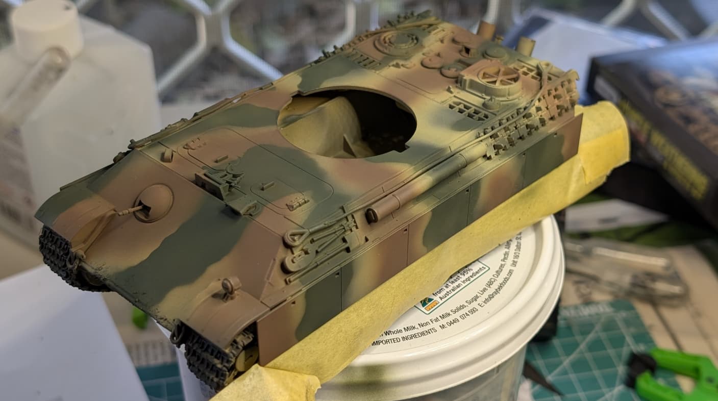 After initial assembly, Panther G spend most of the next 3 months back in the box. We weren’t completely idle during this period, as were side-questing our way through our Tiger I learning the ways of airbrushed three-colour German camo and how NOT to apply a wash…